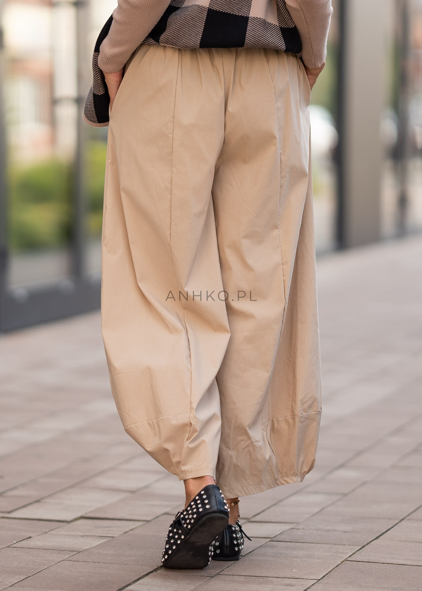 - Fason: Szerokie nogawki z efektem bombki, nadające objętości i lekkości.
