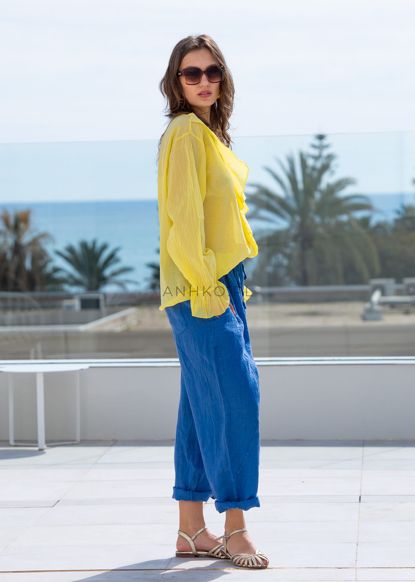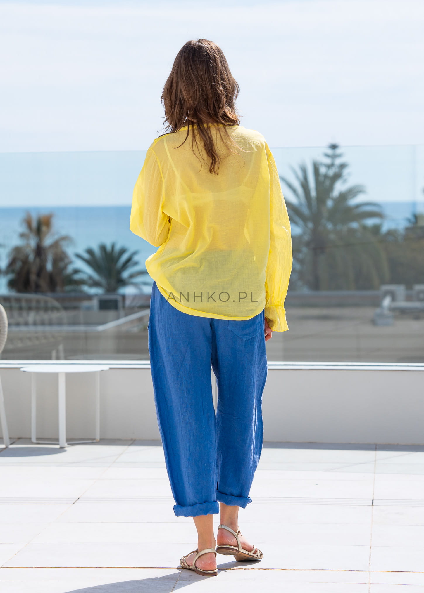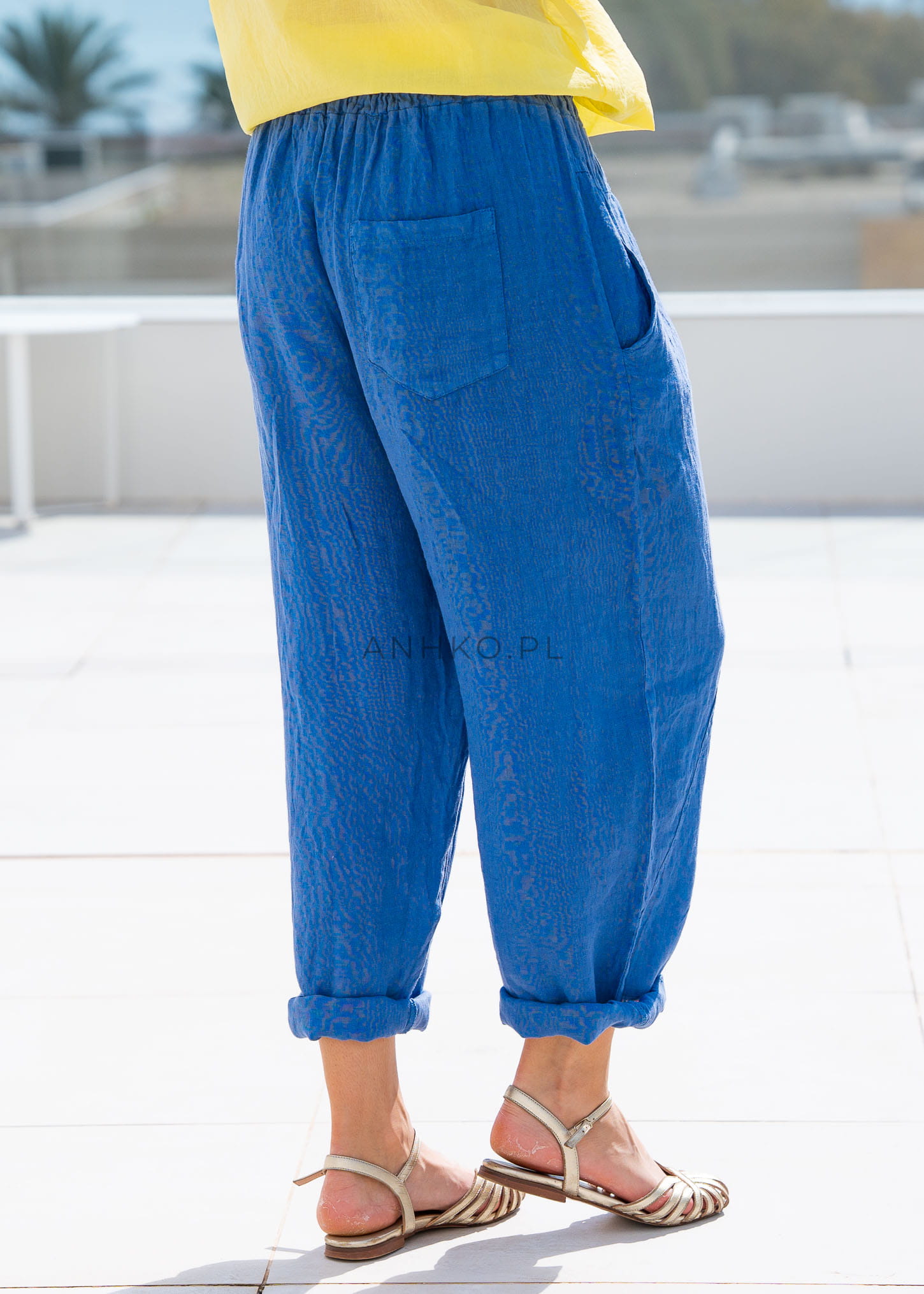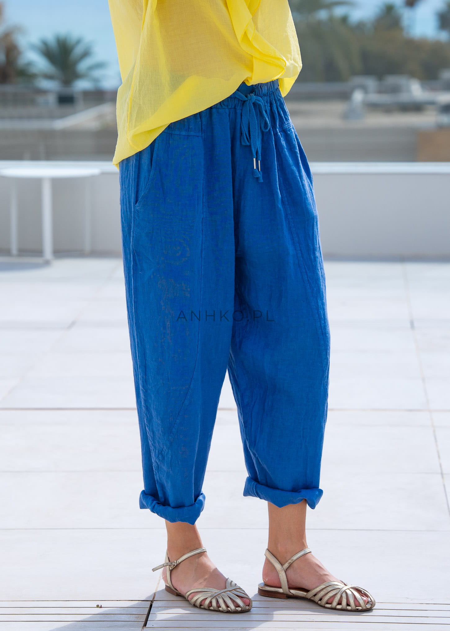 Te spodnie lniane damskie o luźnym fasonie miękko układają się na sylwetce, zapewniając naturalny, niewymuszony efekt. Zwężana nogawka z możliwością podwinięcia nadaje im lekkości, a elastyczny pas subtelnie podkreśla talię. Chabrowy kolor przyciąga uwagę i stanowi wyrazisty akcent w codziennych stylizacjach.