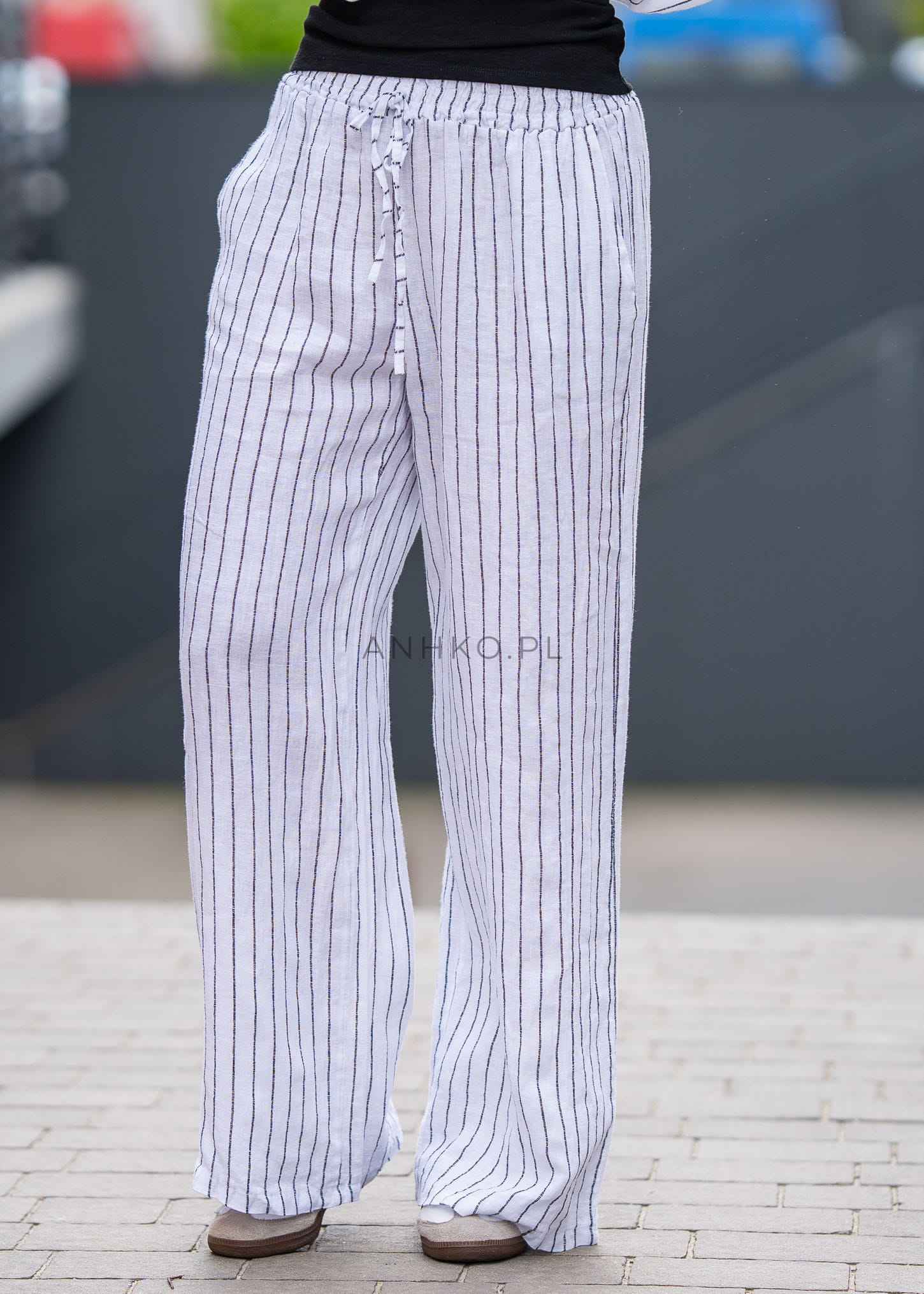 Te spodnie lniane damskie doskonale układają się na sylwetce dzięki szerokim nogawkom i miękkiej, naturalnej strukturze materiału. Pionowe paski optycznie wydłużają nogi, a elastyczny pas z troczkiem zapewnia wygodne dopasowanie i podkreśla talię bez uczucia ucisku.