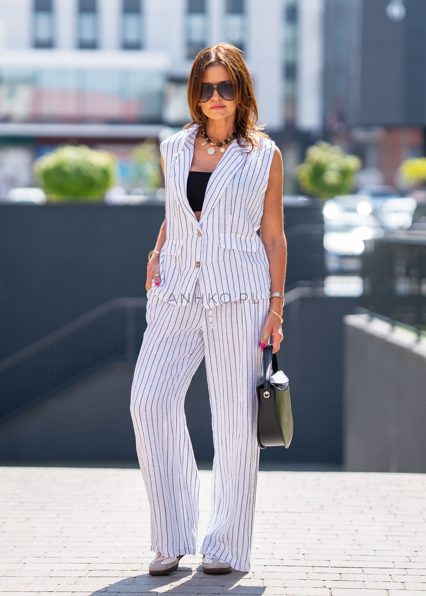 - Wzór: Pionowe paski wysmuklające sylwetkę.