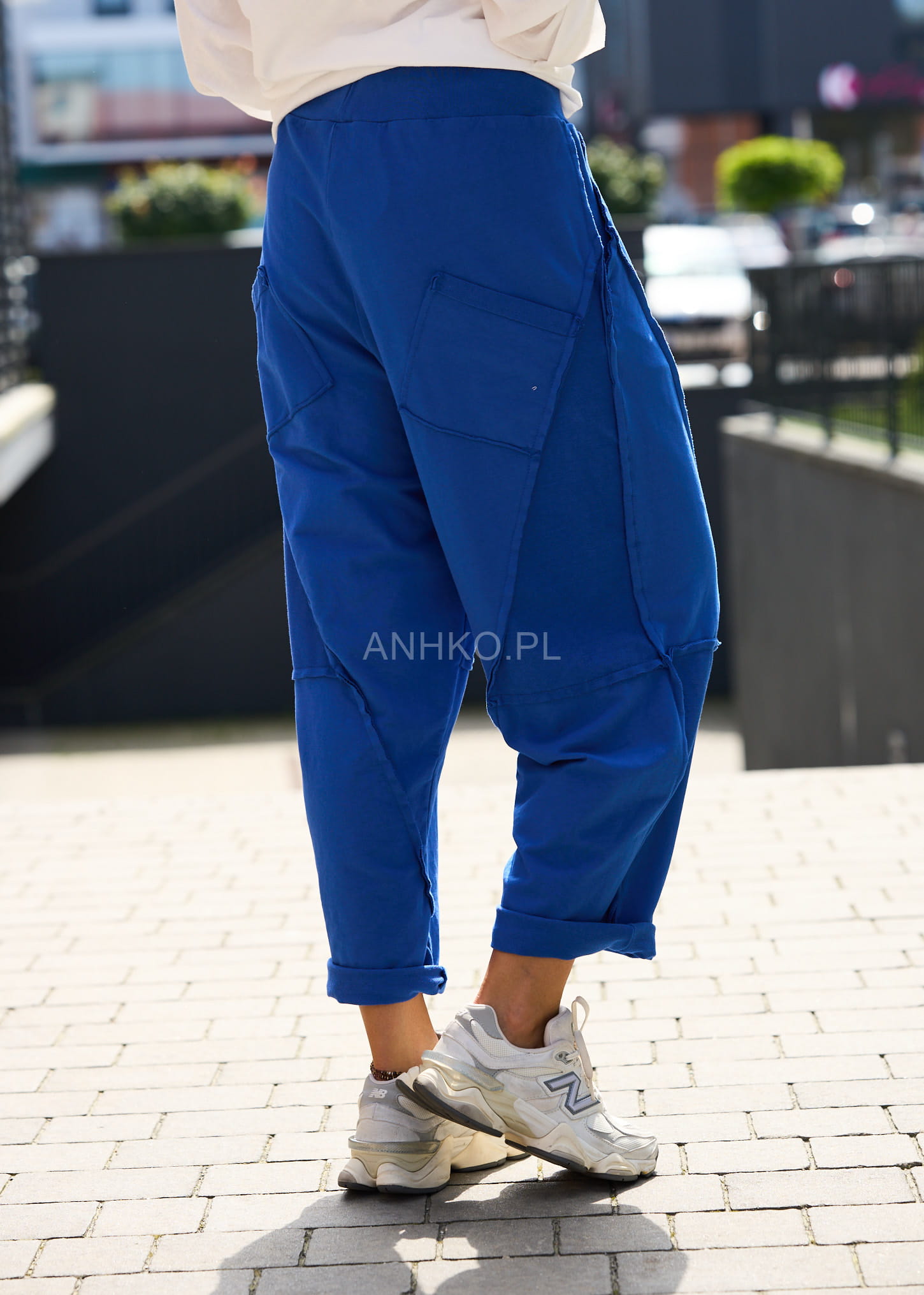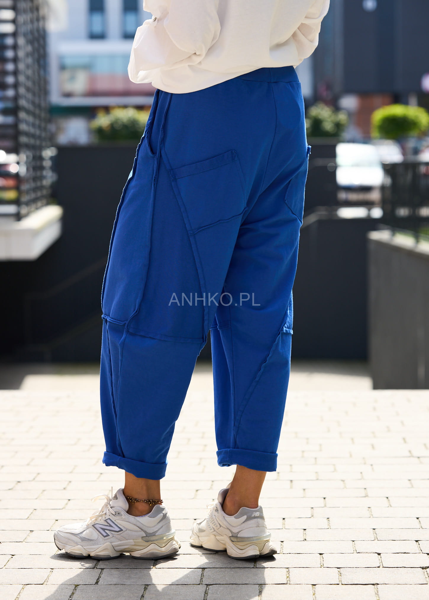 Te spodnie dresowe miękko układają się na sylwetce, zapewniając komfort i nowoczesny efekt oversized. Luźniejsza linia nogawek, delikatnie zwężany dół oraz fantazyjne przeszycia sprawiają, że model przyciąga uwagę i buduje wyrazisty, miejski look. Niebieski kolor dodaje energii stylizacji, a elastyczny pas podkreśla wygodę noszenia na co dzień.