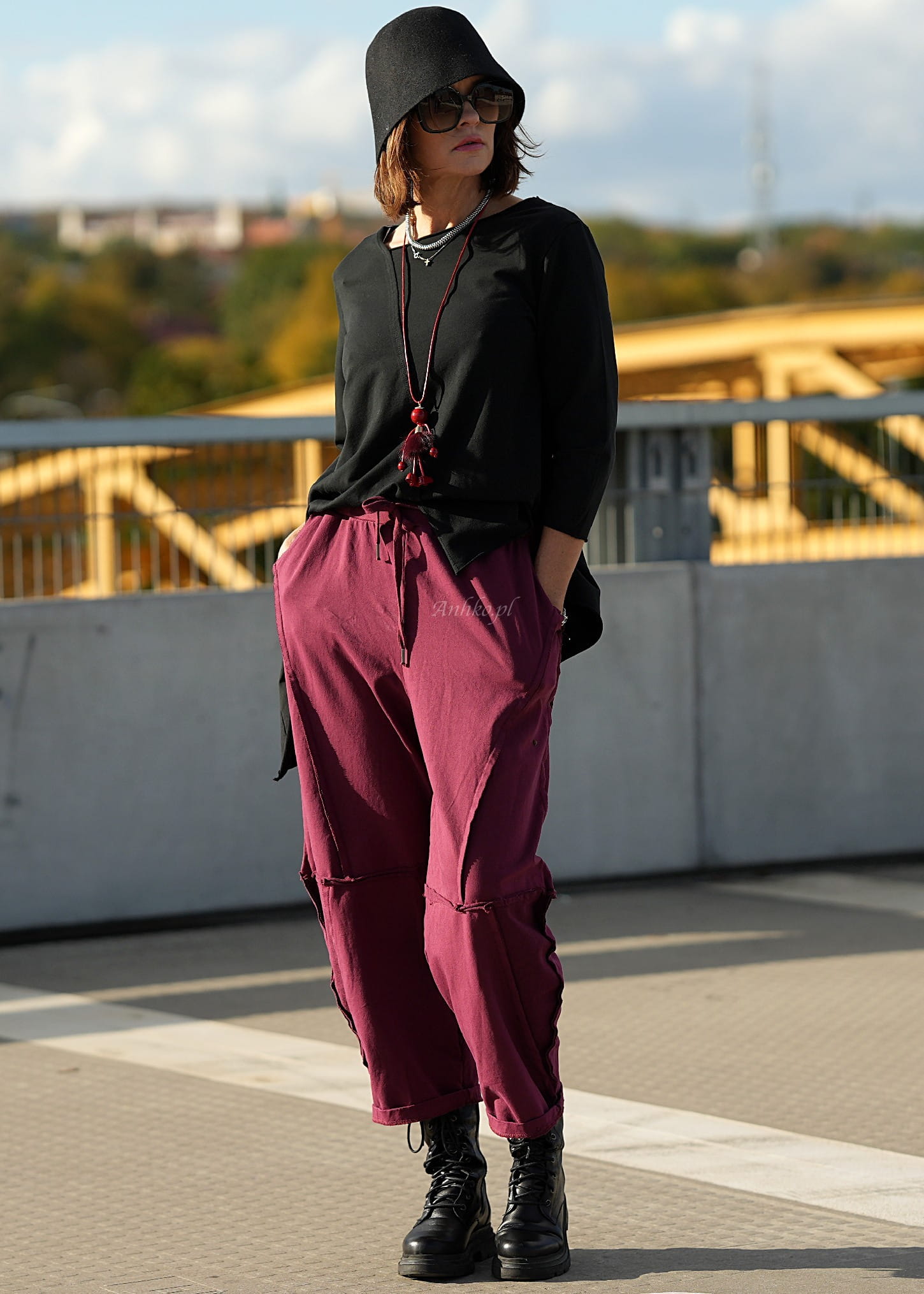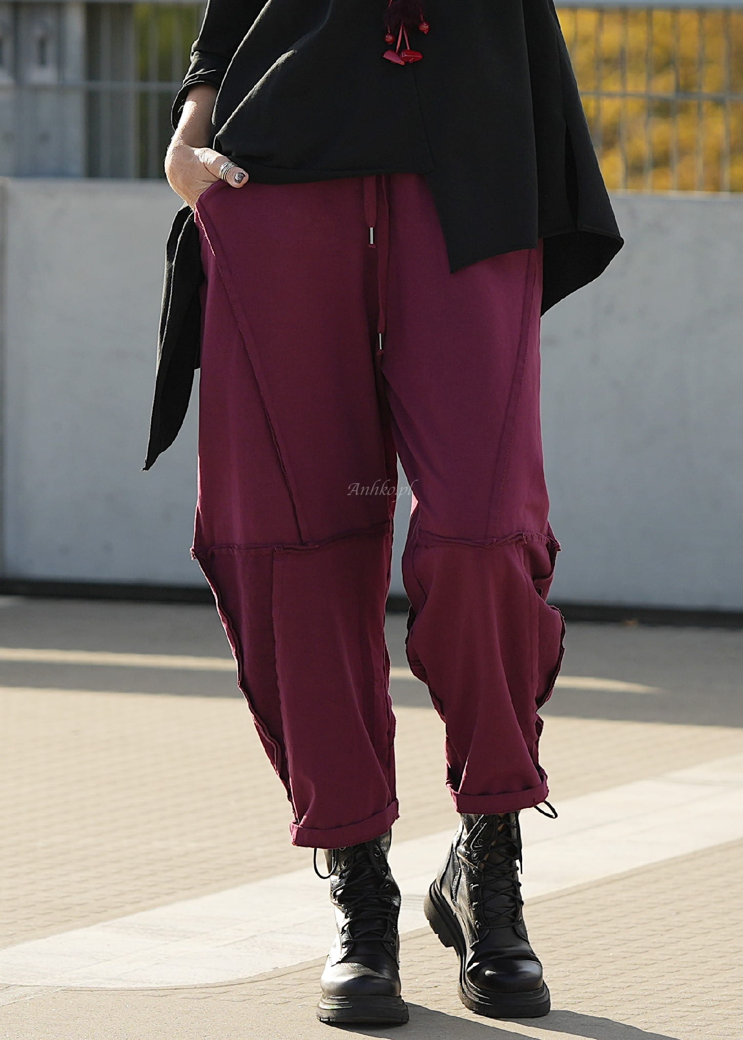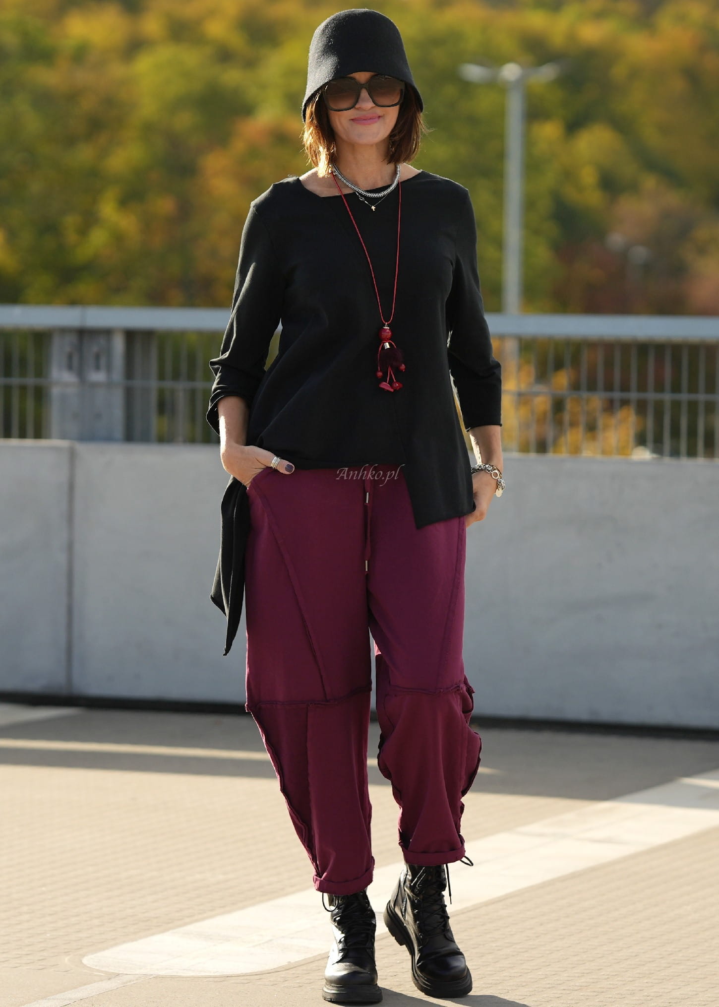 Te spodnie dresowe wyróżniają się luźnym krojem z obniżonym krokiem, który naturalnie układa się na sylwetce i nadaje stylizacji nowoczesnego, miejskiego charakteru. Głęboki odcień bordo wprowadza elegancki akcent, a fantazyjne przeszycia subtelnie podkreślają konstrukcję nogawek, dodając całości oryginalnego stylu.