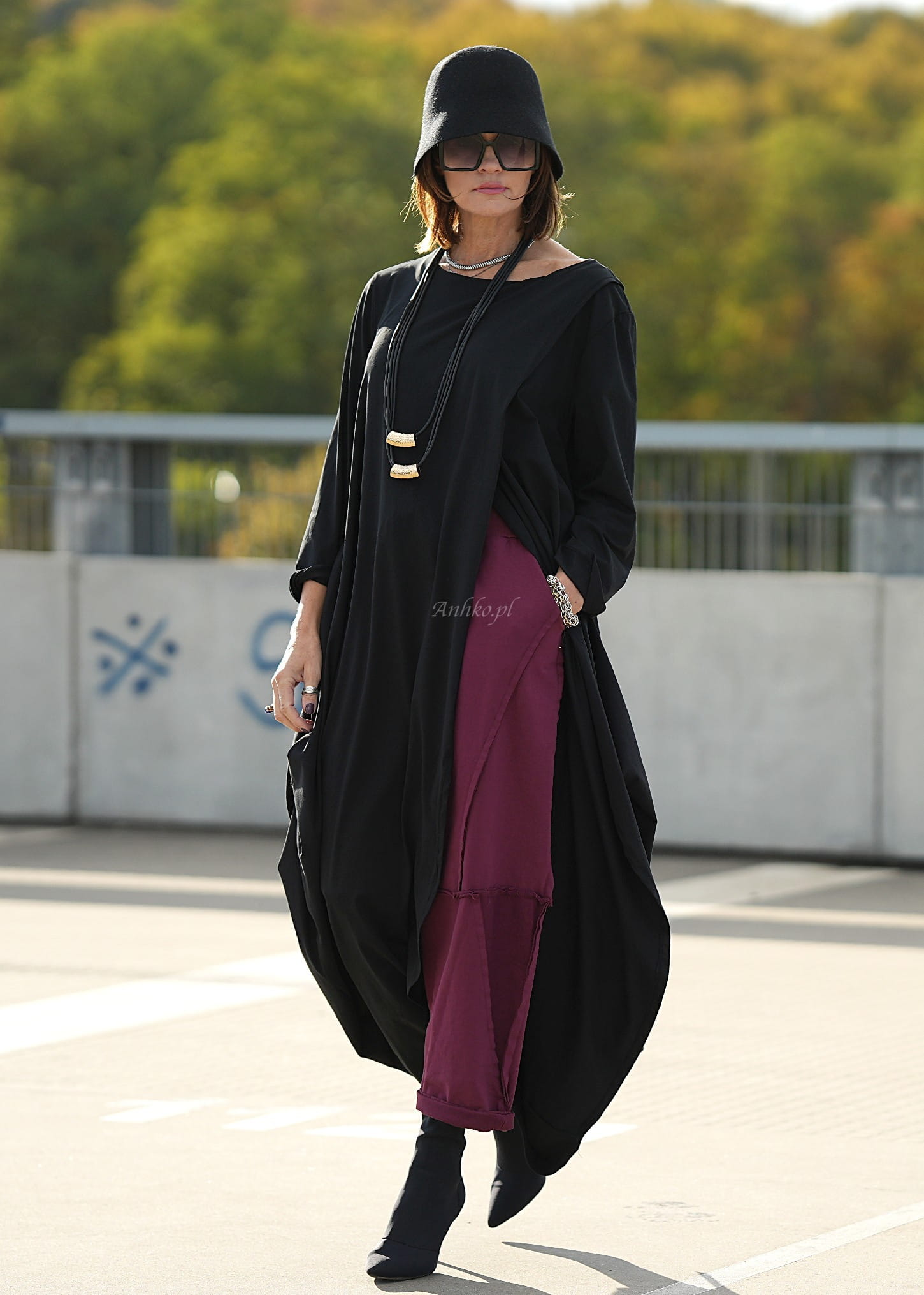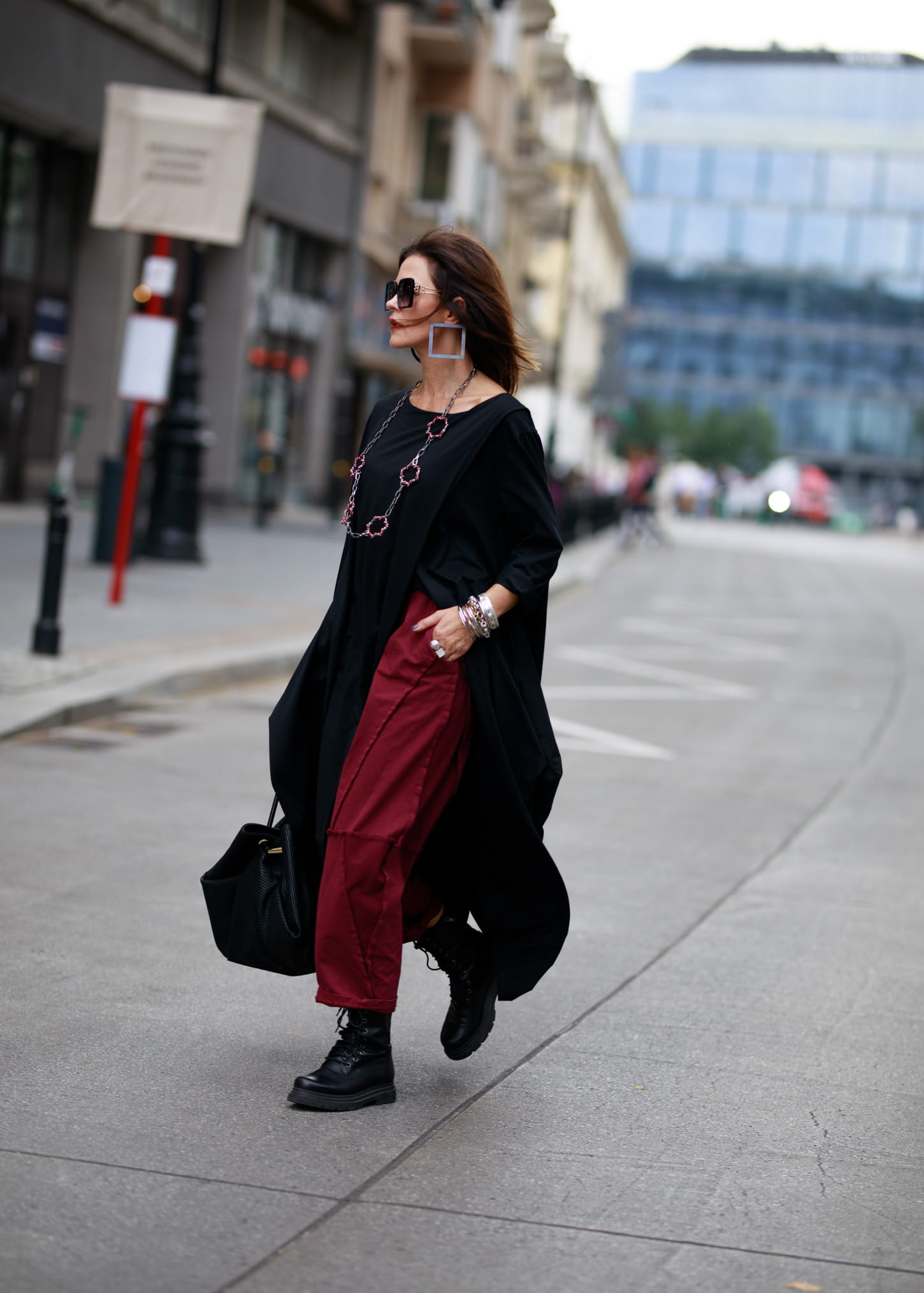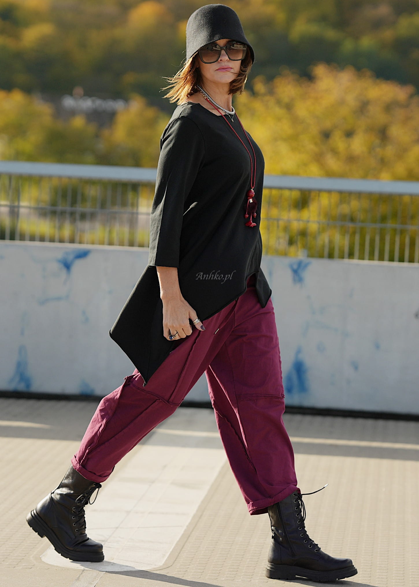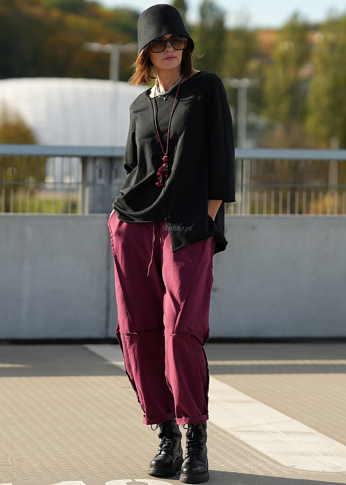 Te spodnie dresowe wyróżniają się luźnym krojem z obniżonym krokiem, który naturalnie układa się na sylwetce i nadaje stylizacji nowoczesnego, miejskiego charakteru. Głęboki odcień bordo wprowadza elegancki akcent, a fantazyjne przeszycia subtelnie podkreślają konstrukcję nogawek, dodając całości oryginalnego stylu.