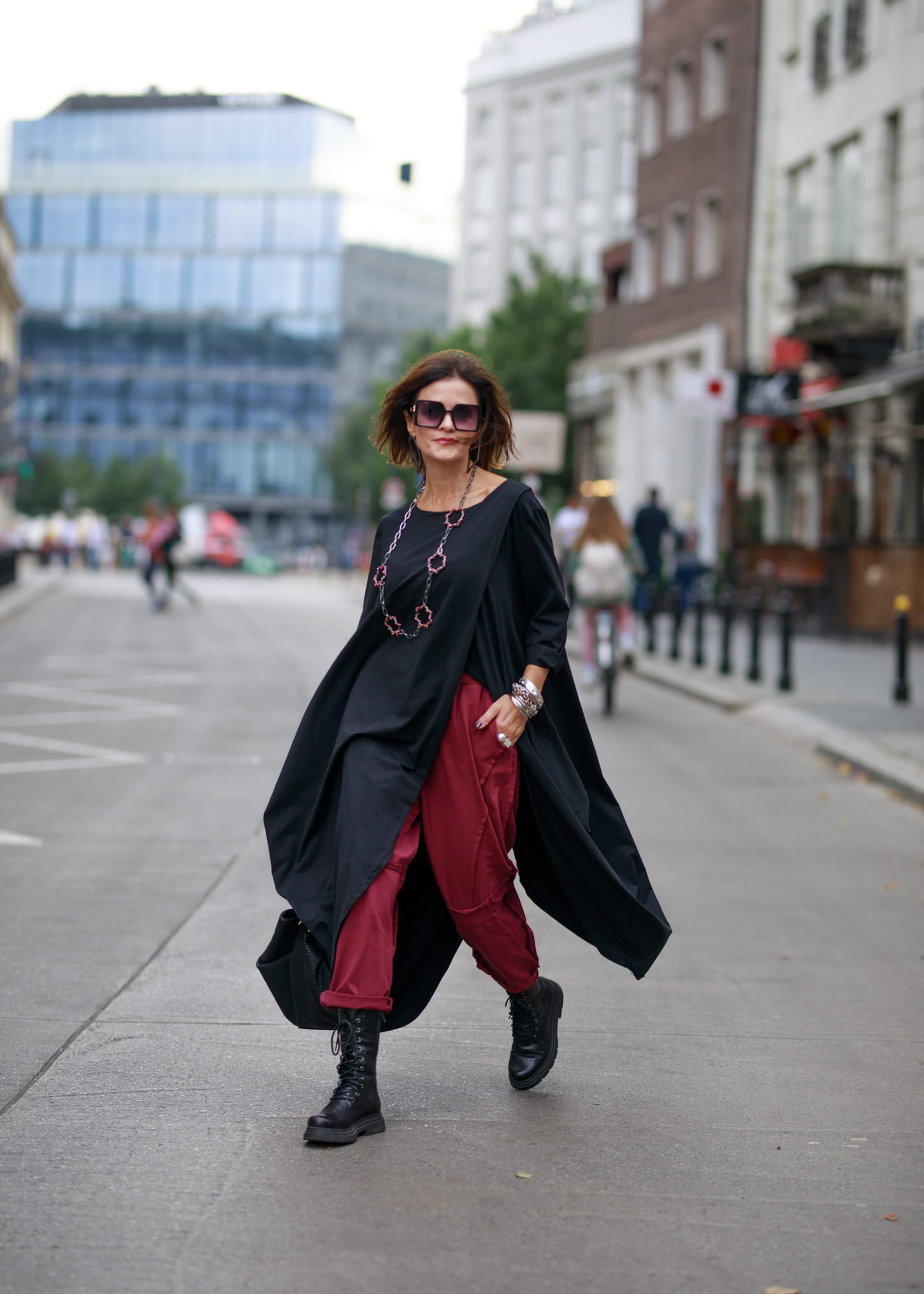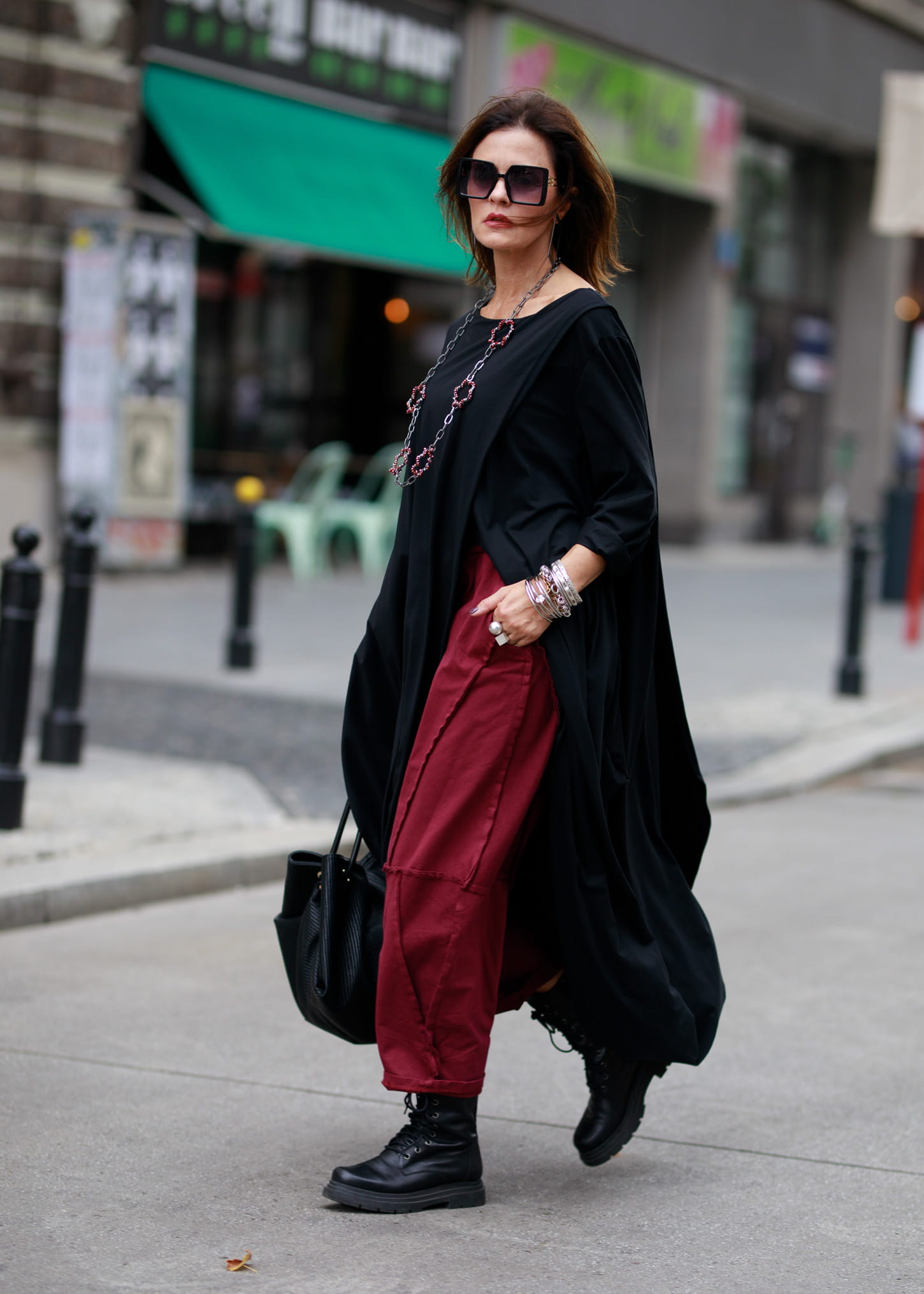 - Nogawki: Szerokie u góry i delikatnie zwężane ku dołowi.