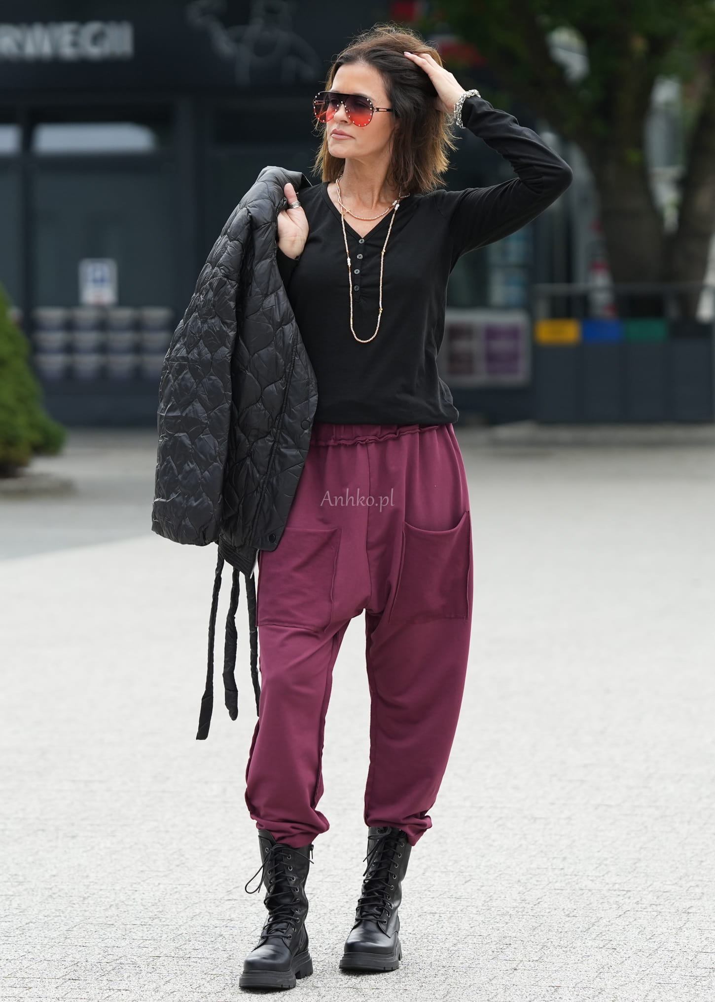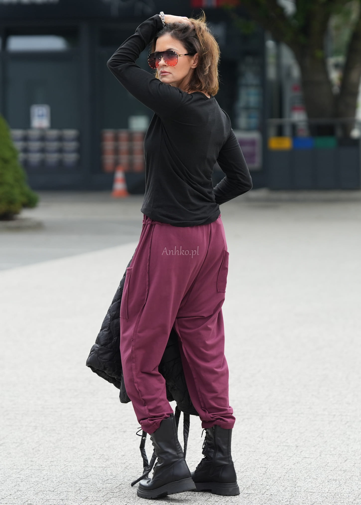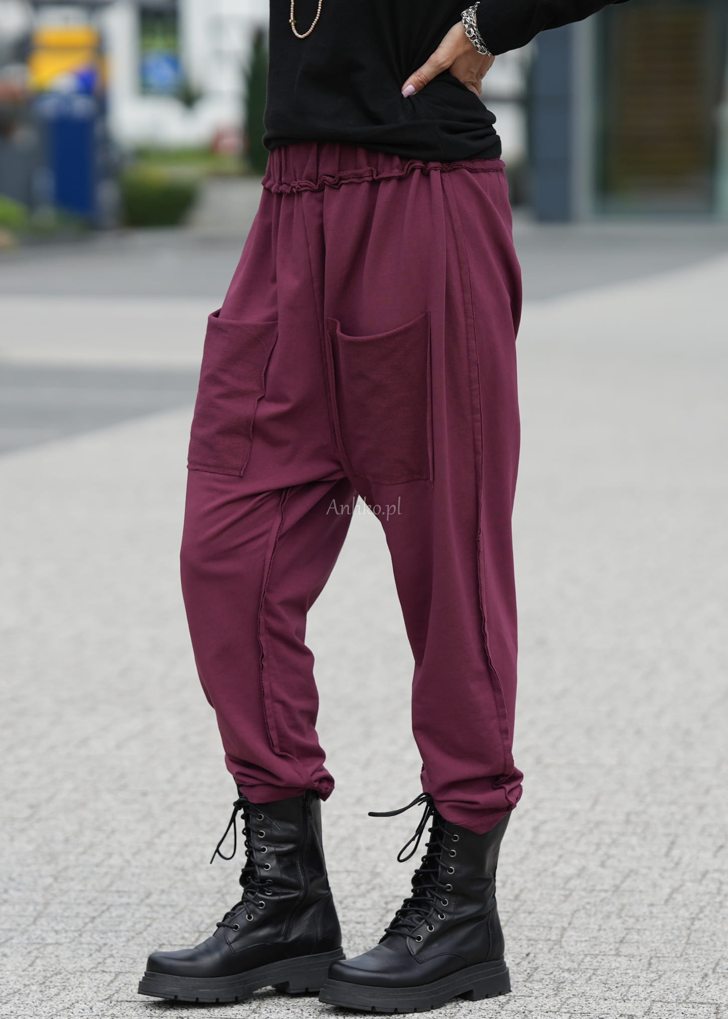 Te spodnie damskie wyróżniają się swobodnym fasonem, który miękko układa się na sylwetce i zapewnia maksymalny komfort. Luźny krój z obniżonym stanem oraz lekko zwężane nogawki tworzą nowoczesną, nonszalancką linię, idealną do codziennych stylizacji. Charakterystyczny odcień wine dodaje całości wyrazistości i modowego charakteru.