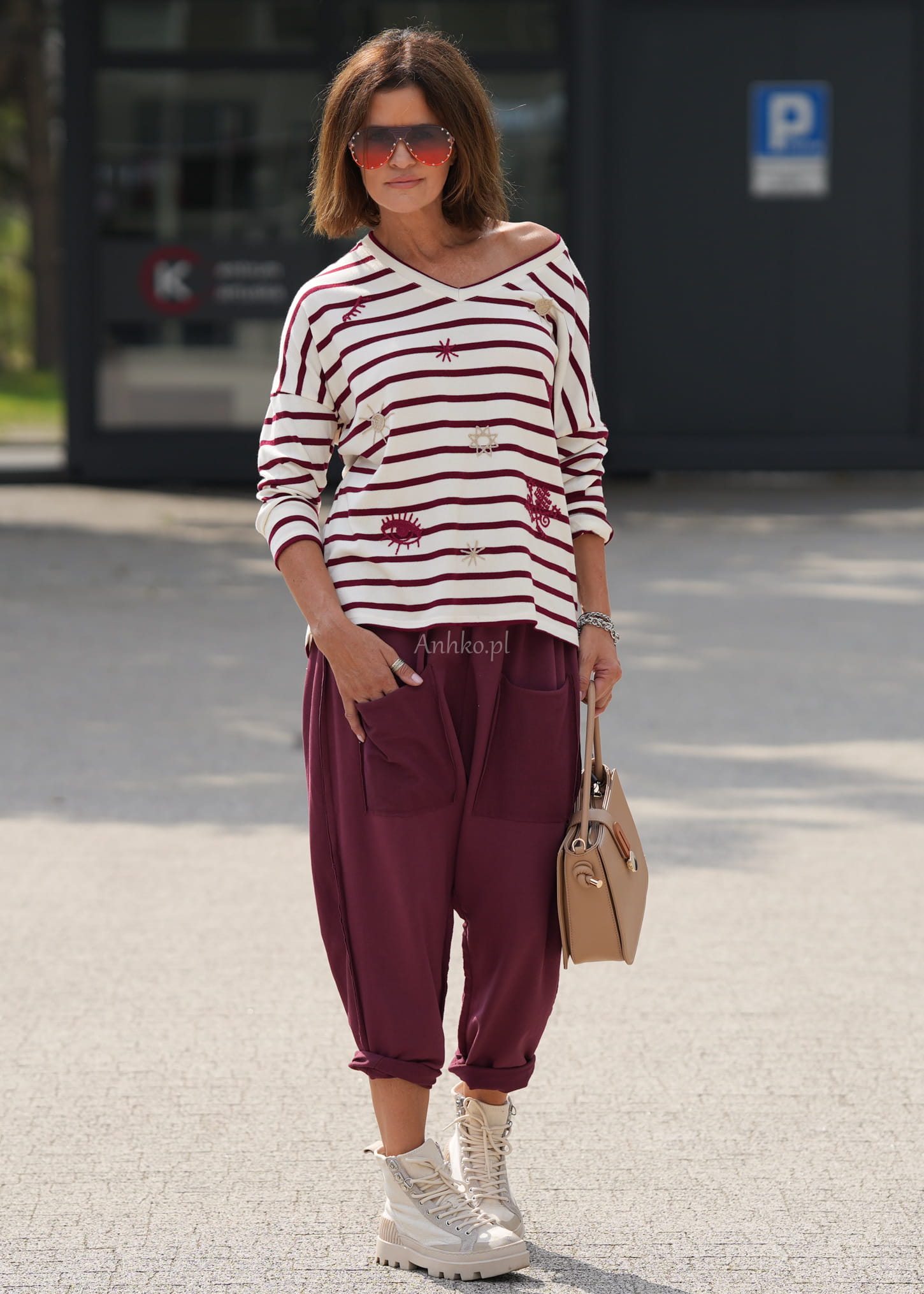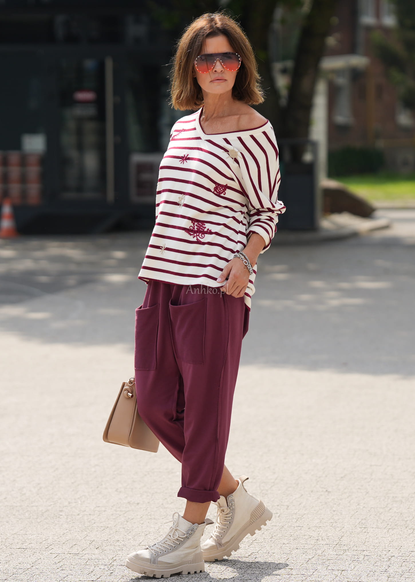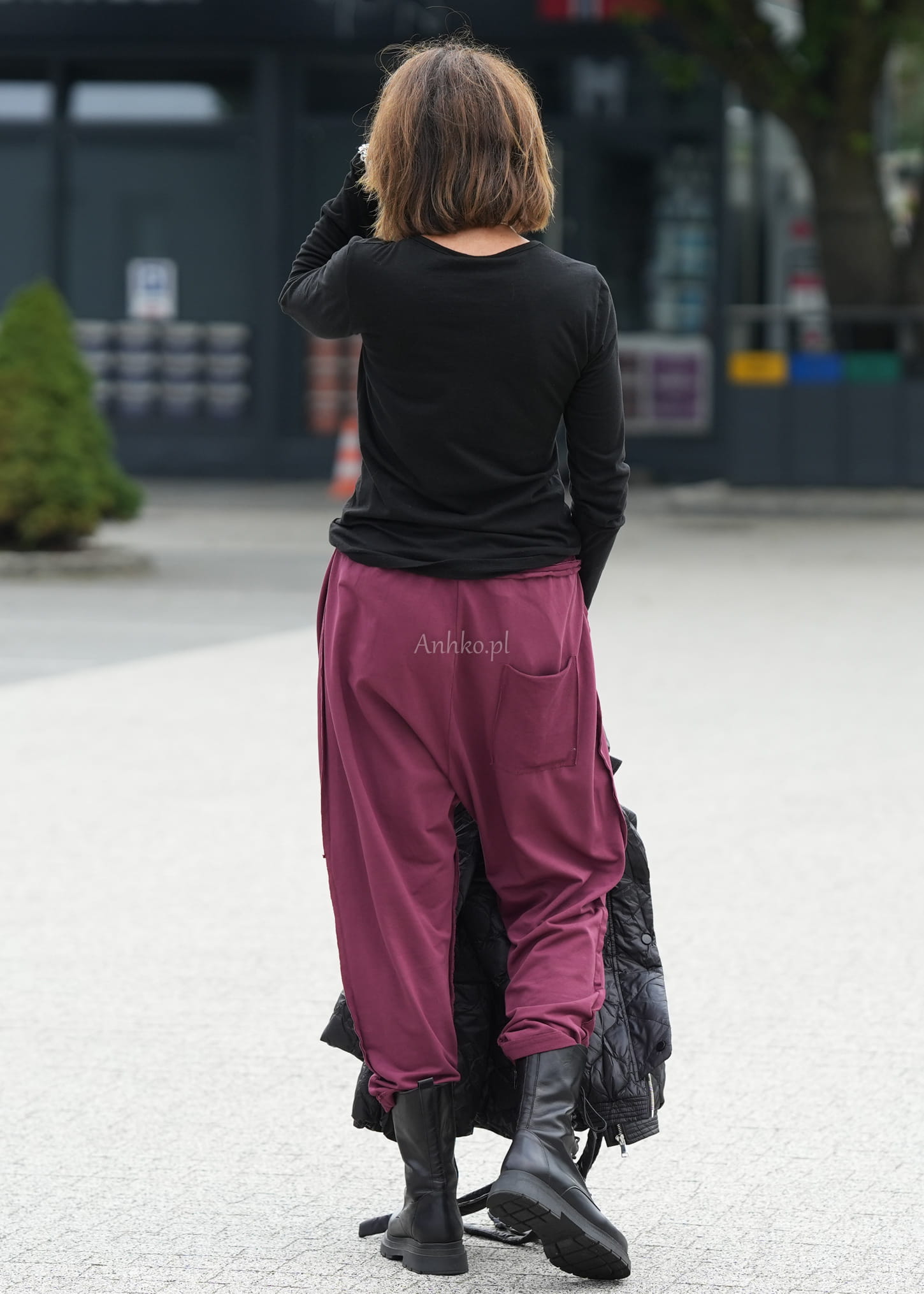 Te spodnie damskie wyróżniają się swobodnym fasonem, który miękko układa się na sylwetce i zapewnia maksymalny komfort. Luźny krój z obniżonym stanem oraz lekko zwężane nogawki tworzą nowoczesną, nonszalancką linię, idealną do codziennych stylizacji. Charakterystyczny odcień wine dodaje całości wyrazistości i modowego charakteru.