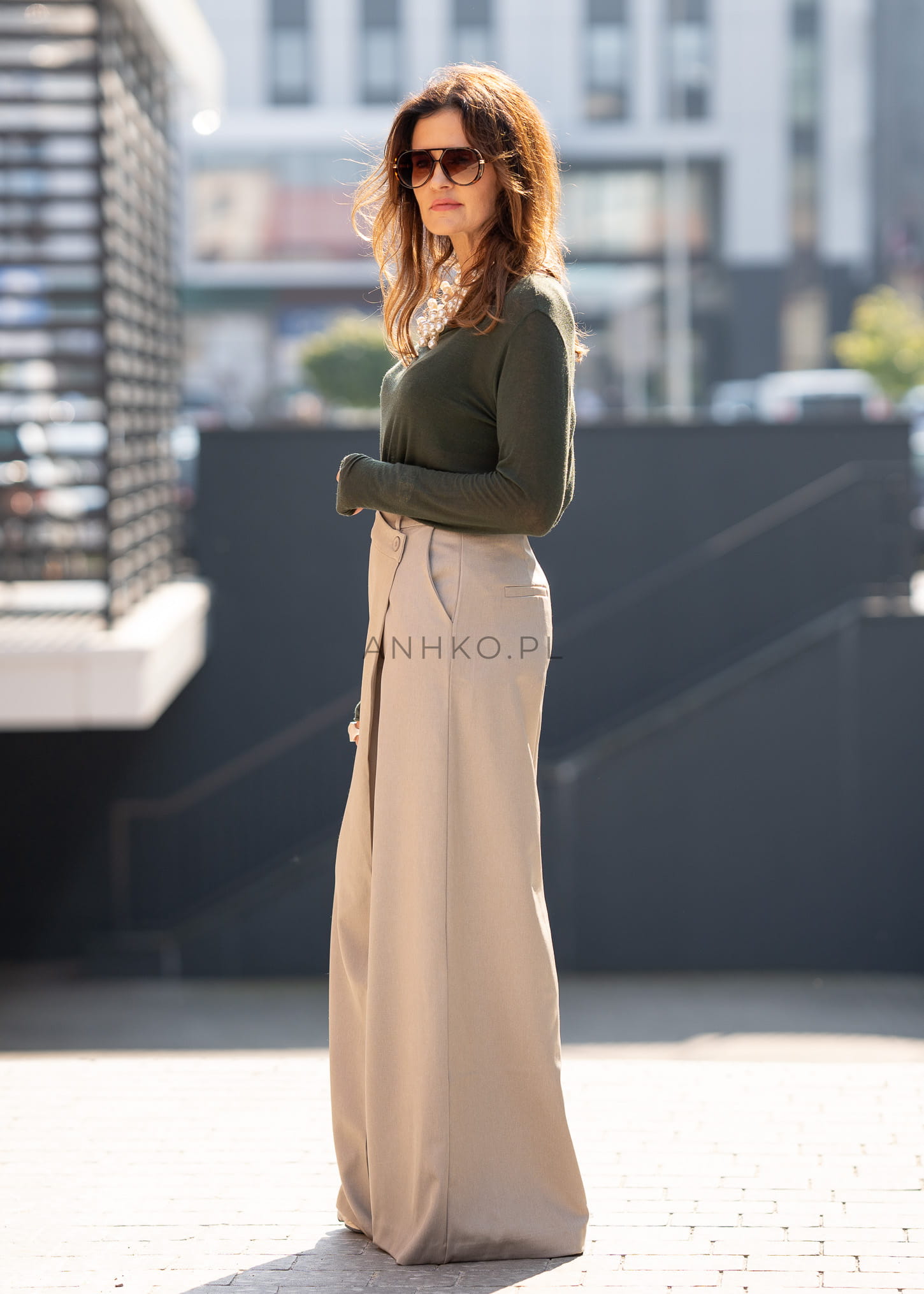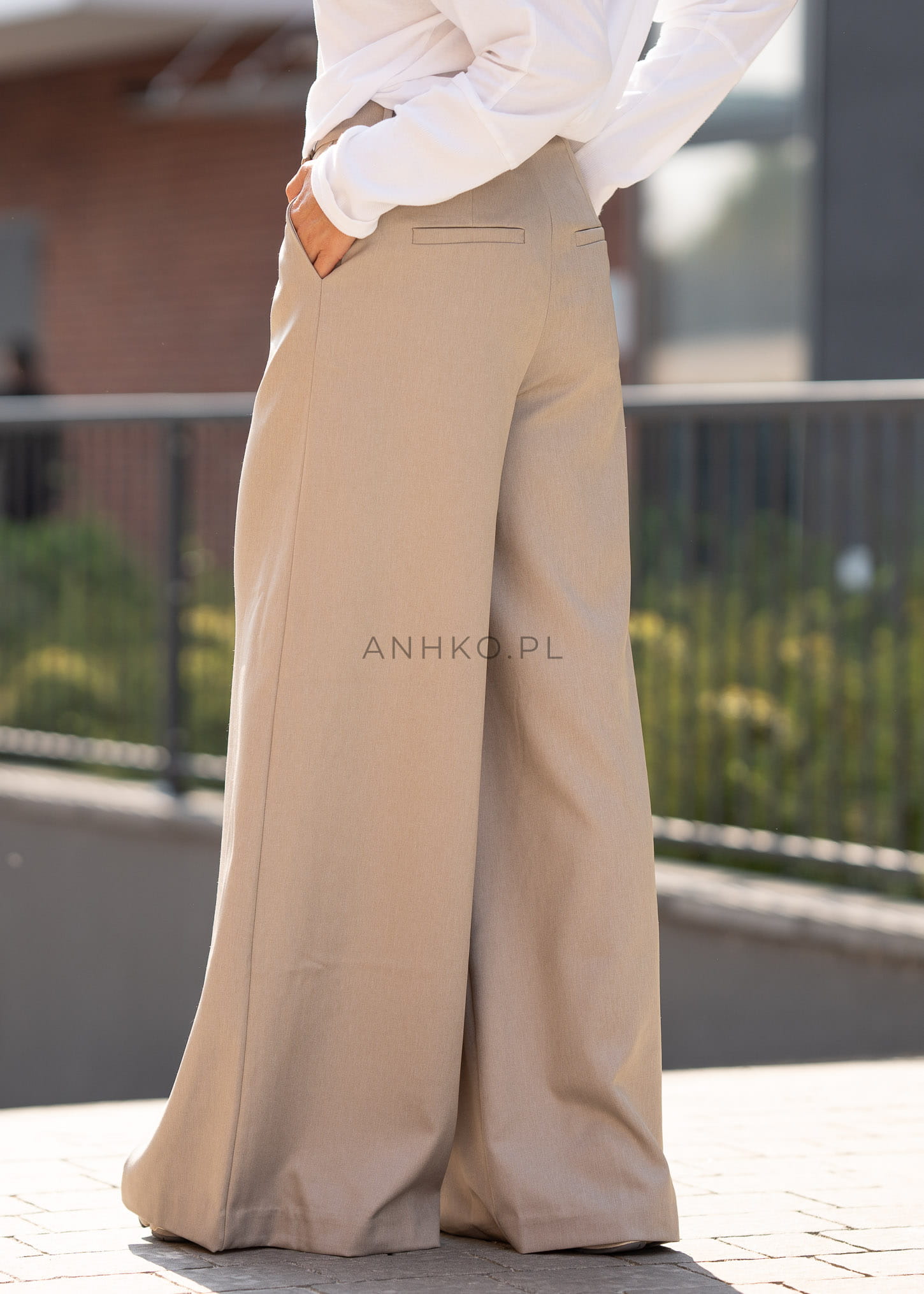 Spodnie Stretch Beżowo-Oliwkowe - Te eleganckie spodnie z szerokimi nogawkami to idealny wybór dla osób ceniących styl i wygodę. Wykonane z lekkiej, oddychającej tkaniny bawełnianej, zapewniają komfort noszenia przez cały dzień. Szerokie nogawki dodają swobodnego, modnego charakteru, a elastyczny pas z tyłu umożliwia idealne dopasowanie do sylwetki. Spodnie posiadają głębokie, funkcjonalne kieszenie, które podkreślają ich praktyczny charakter, jednocześnie nadając im elegancji.