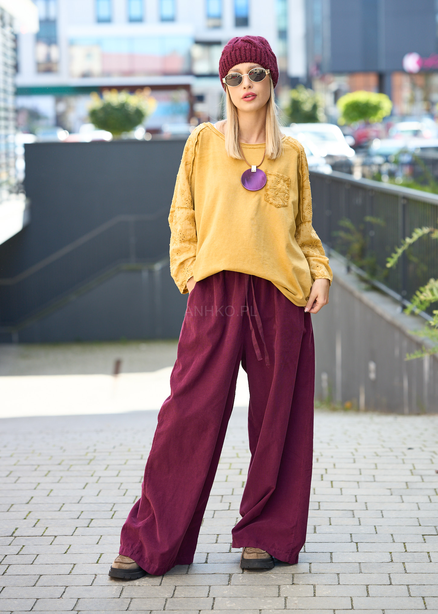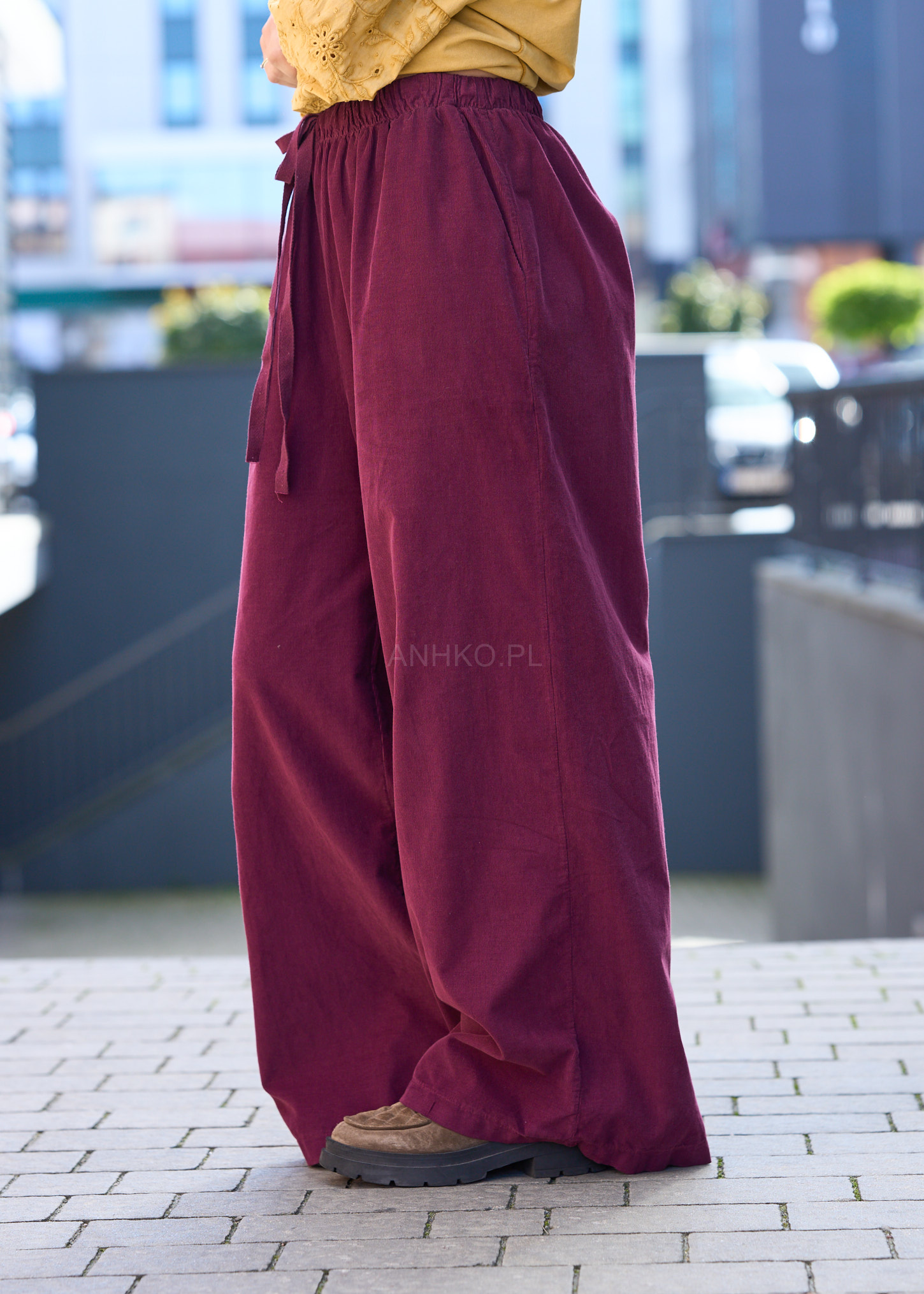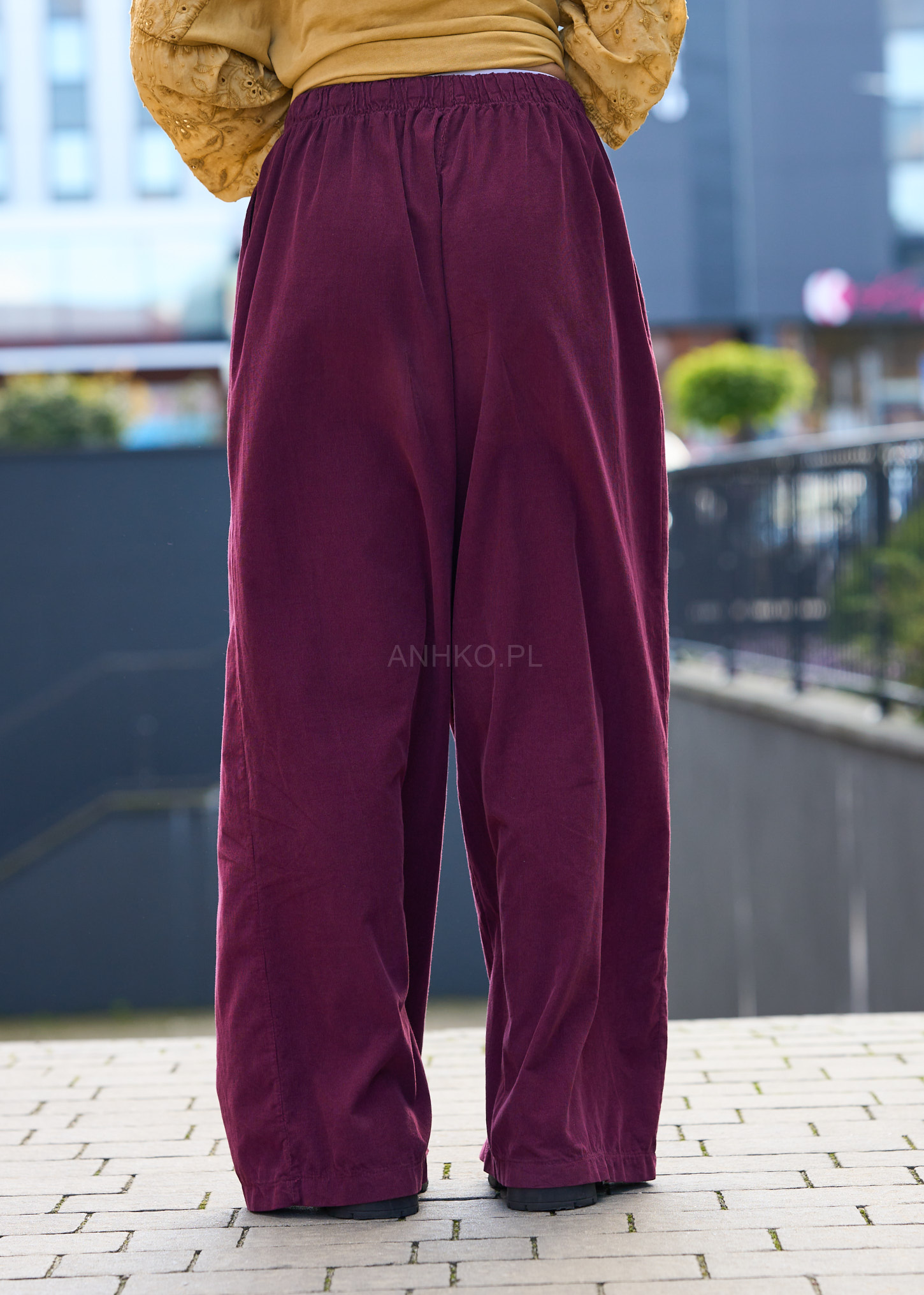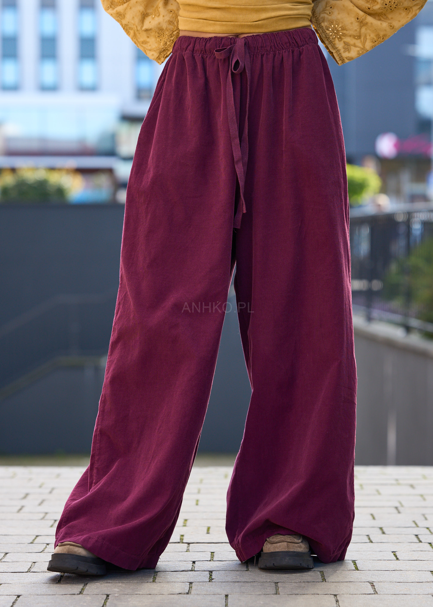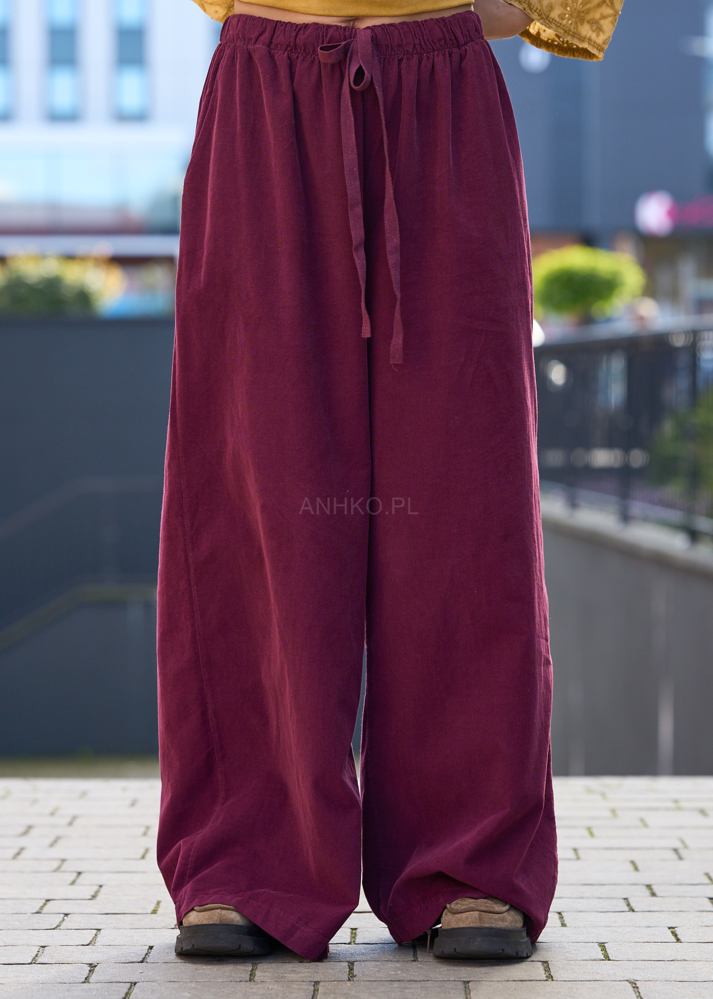 To spodnie ze sztruksu, które zapewniają wygodę dzięki gumce w pasie oraz sznurkowi do regulacji. Mają szeroką nogawkę, która nadaje im luźny i casualowy charakter. Te spodnie są zarówno stylowe, jak i komfortowe, stanowiąc doskonałą opcję na każdą okazje, idealne do codziennego noszenia.