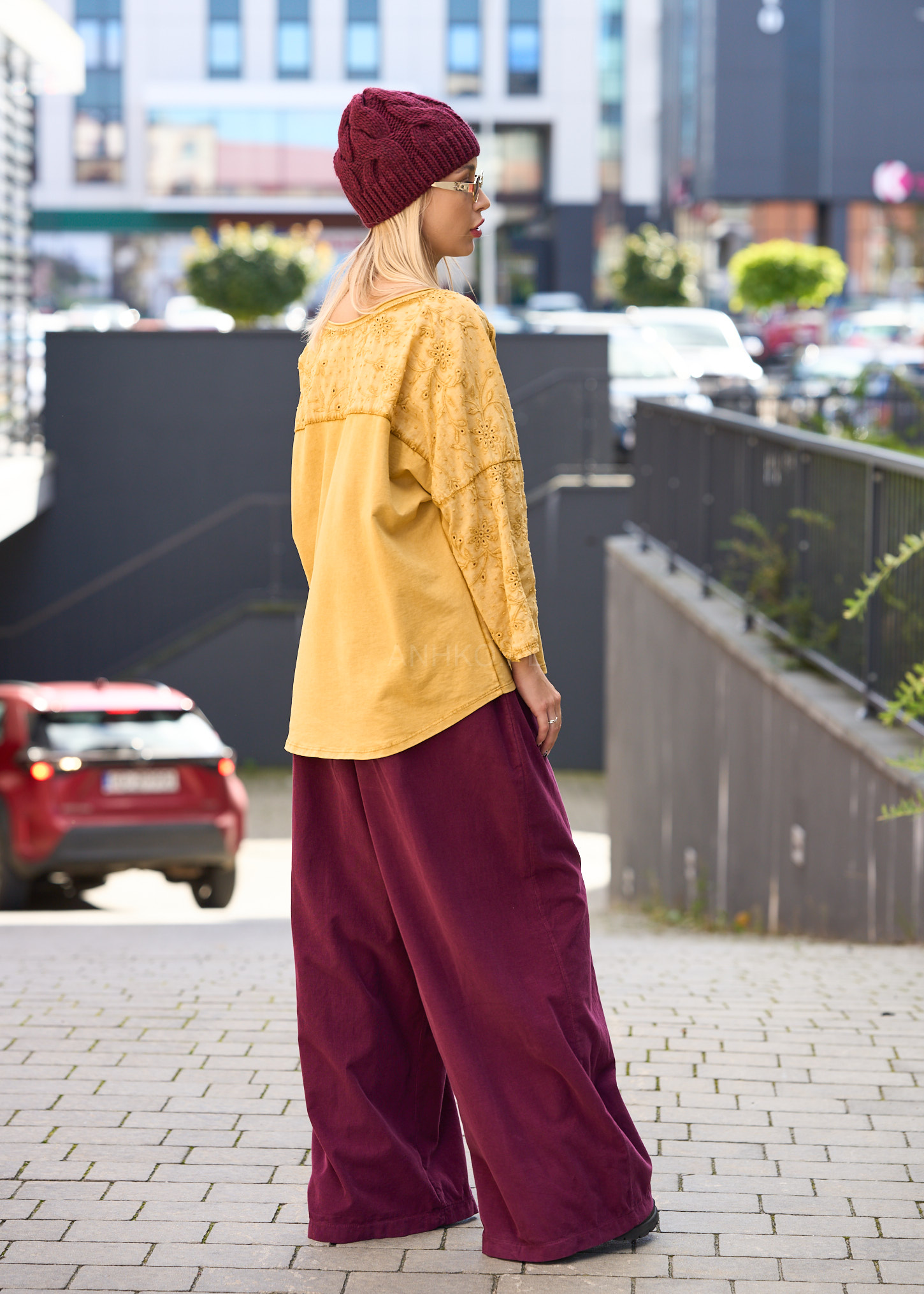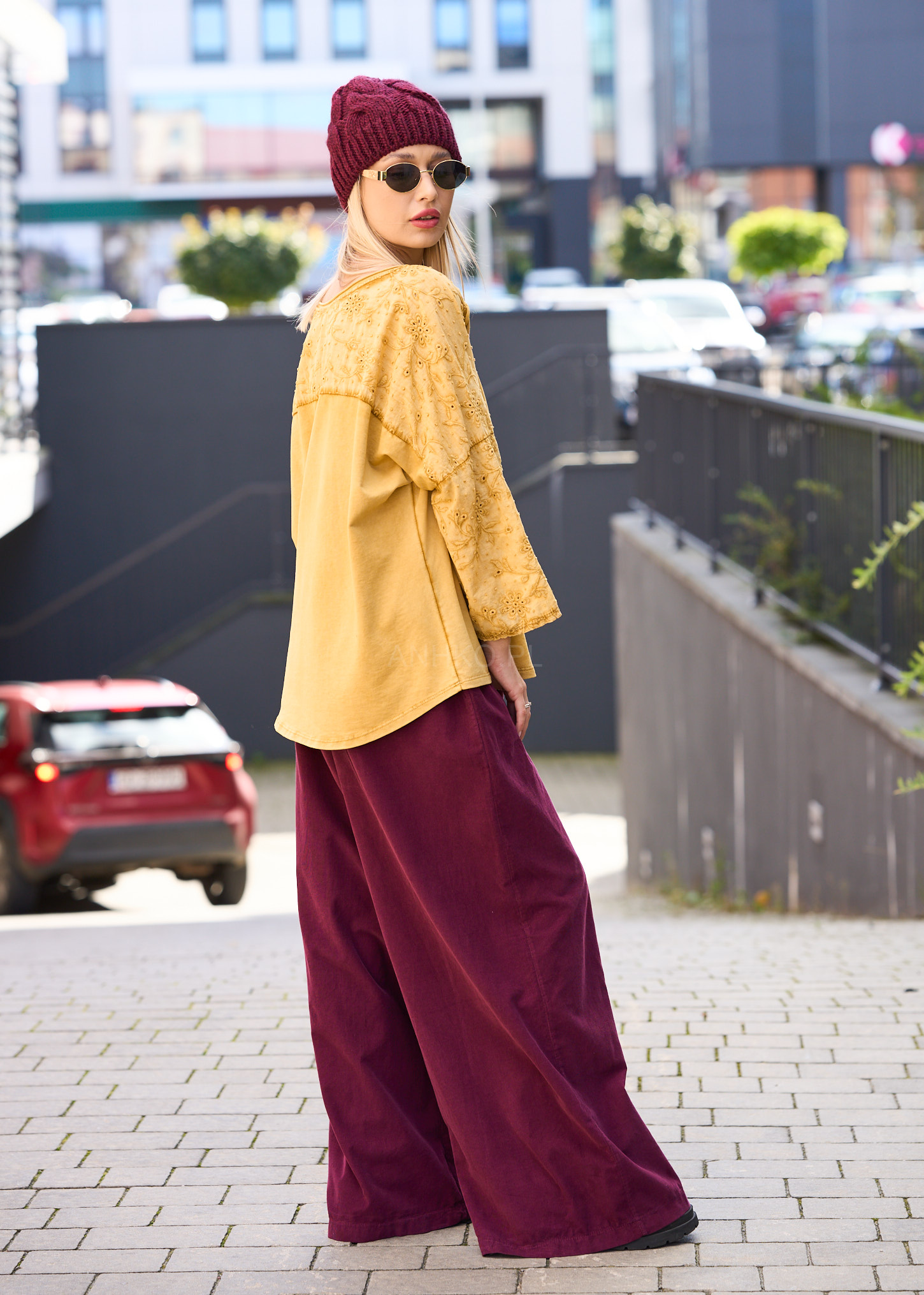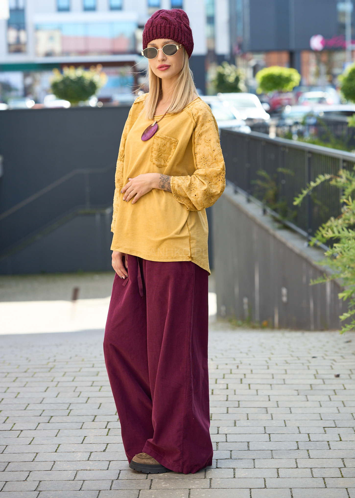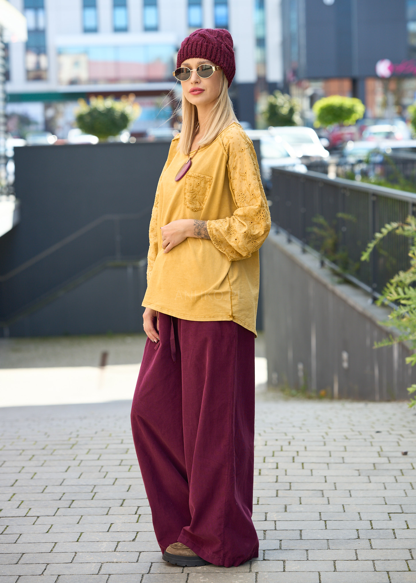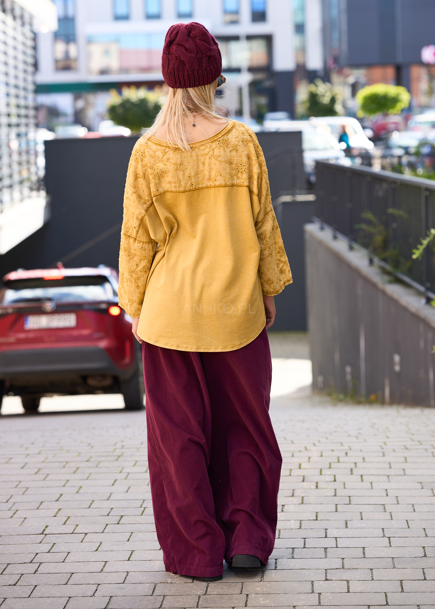 Bluzka Broider Musztardowa - Stylowa, zielona bluzka z haftowanymi rękawami 3/4 i kieszonką na piersi. Wykonana z miękkiej bawełny z dodatkiem elastanu, idealna na co dzień i wyjątkowe okazje.