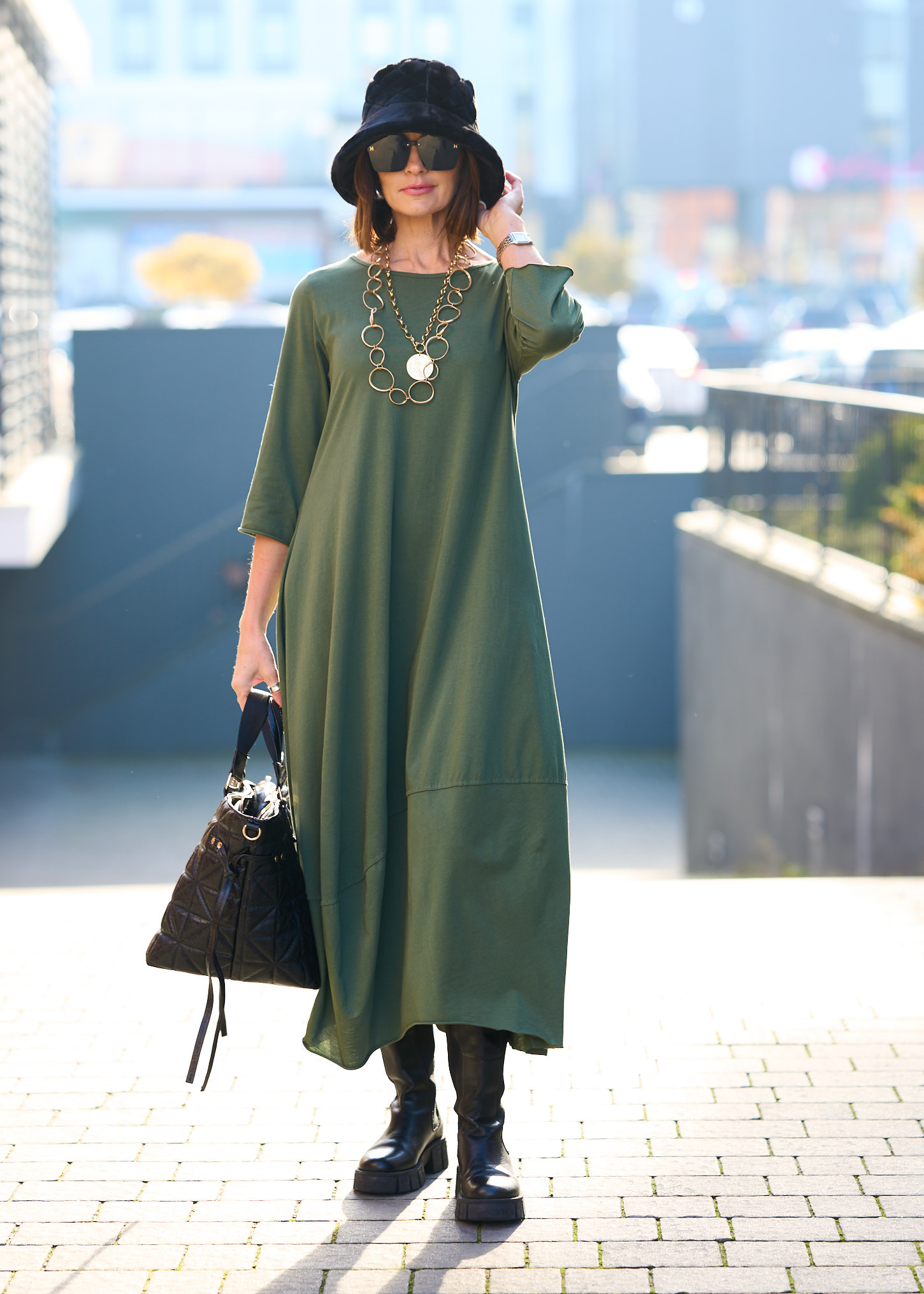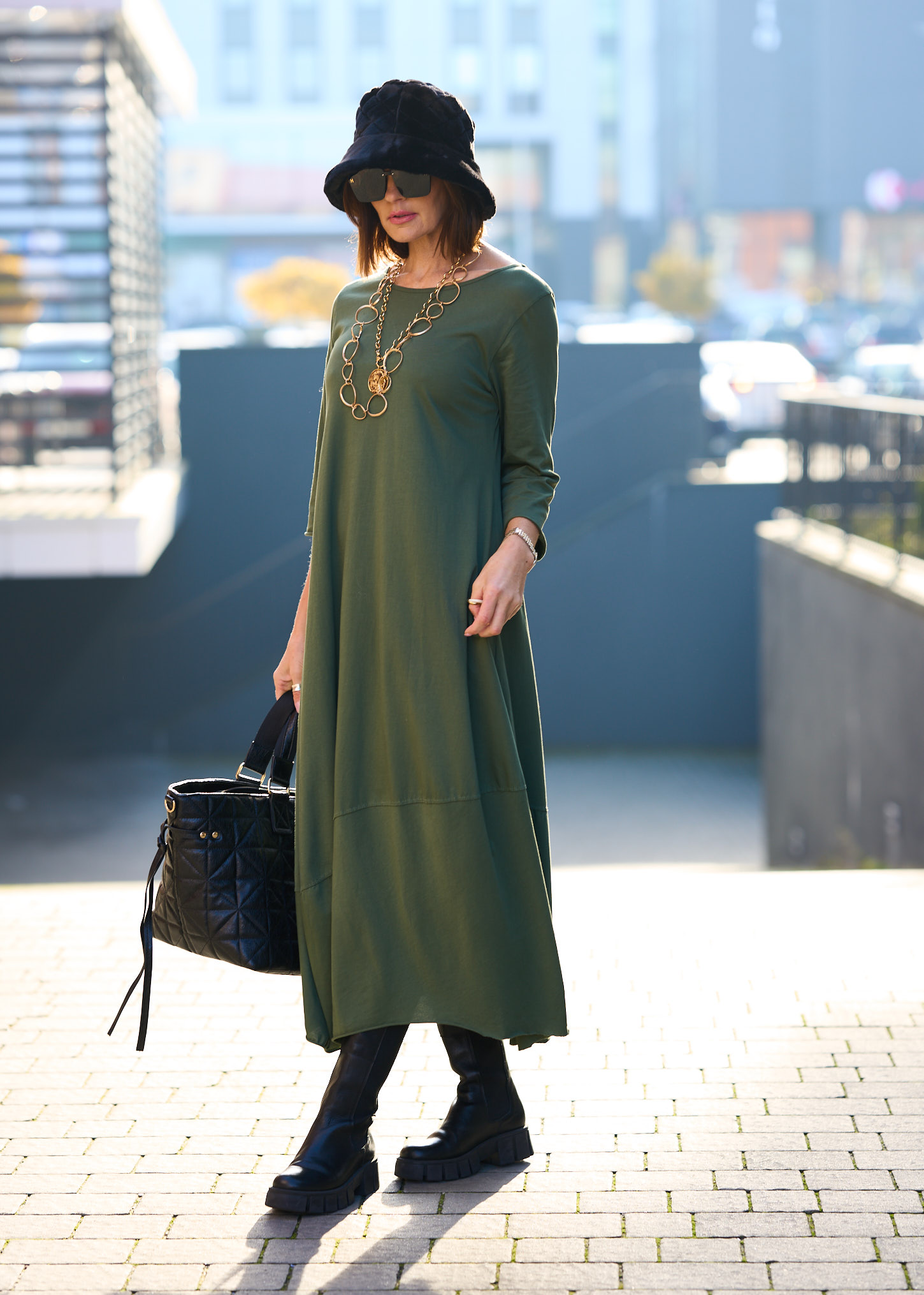 Ta sukienka maxi miękko opływa sylwetkę, swobodnie układa się od linii ramion i tworzy efekt lekkiej, nowoczesnej formy. Oliwkowy kolor podkreśla jej uniwersalny charakter, a luźny krój, rękaw 3/4 i dolna linia typu bombka sprawiają, że model wygląda stylowo zarówno z cięższymi botkami, jak i z minimalistycznymi dodatkami.