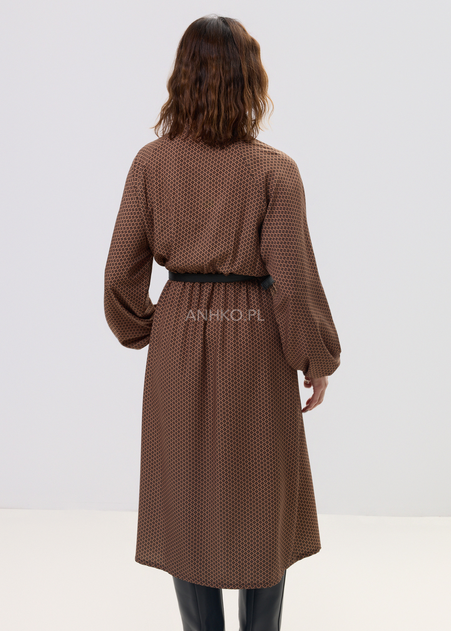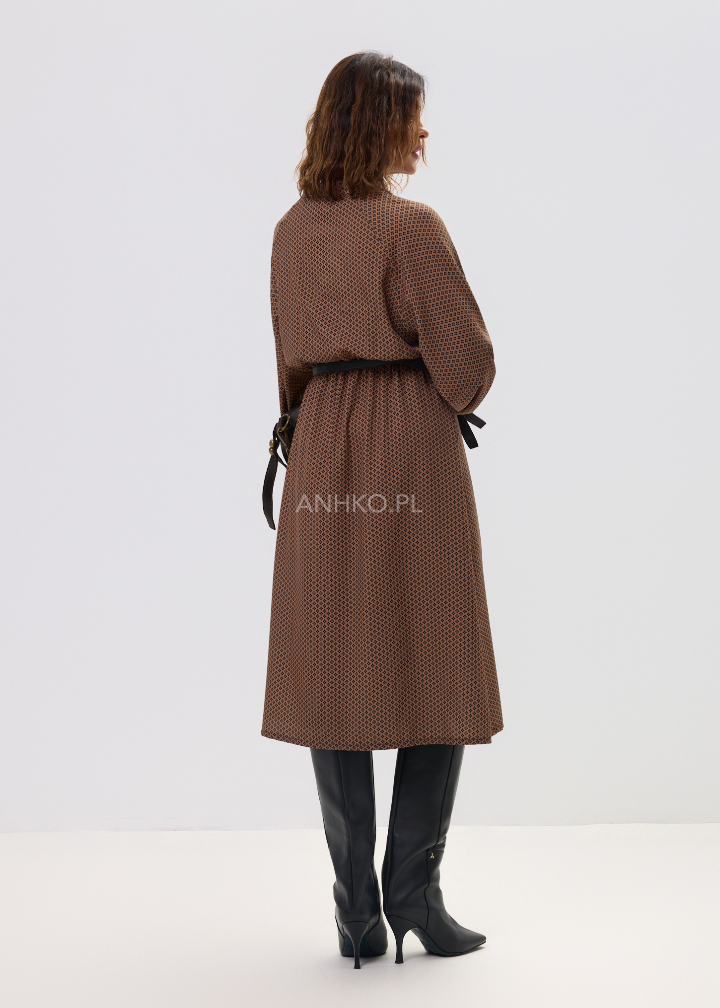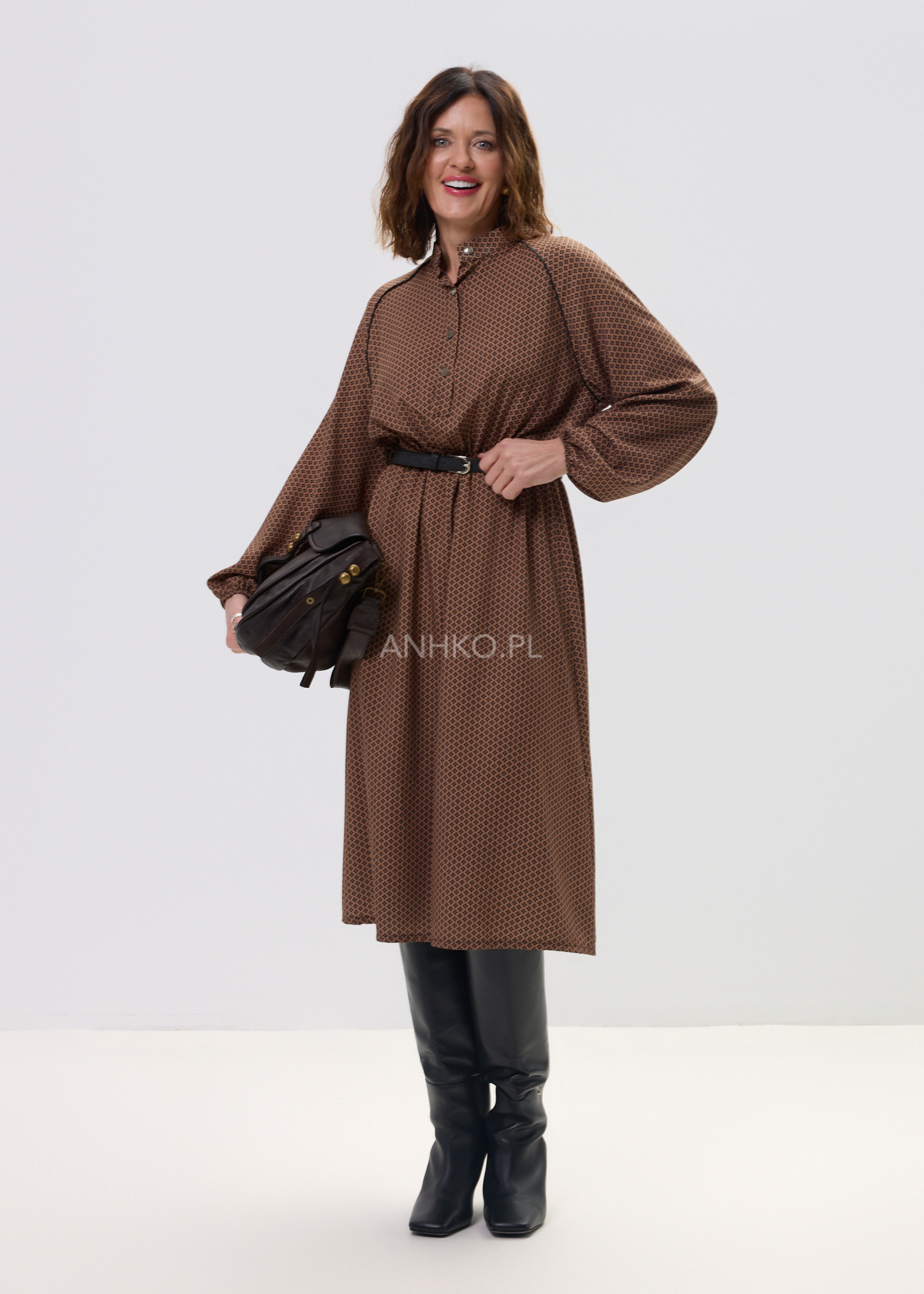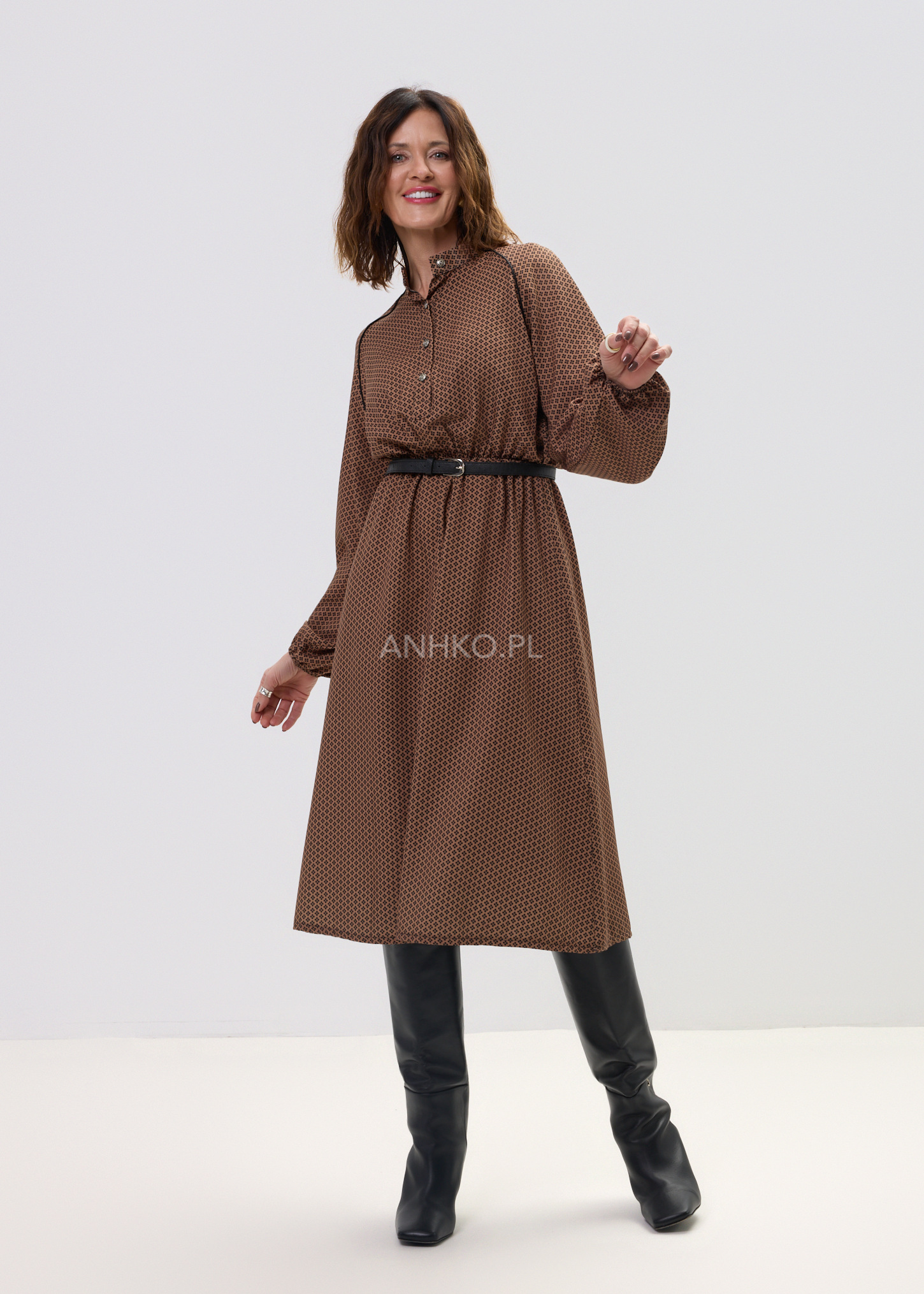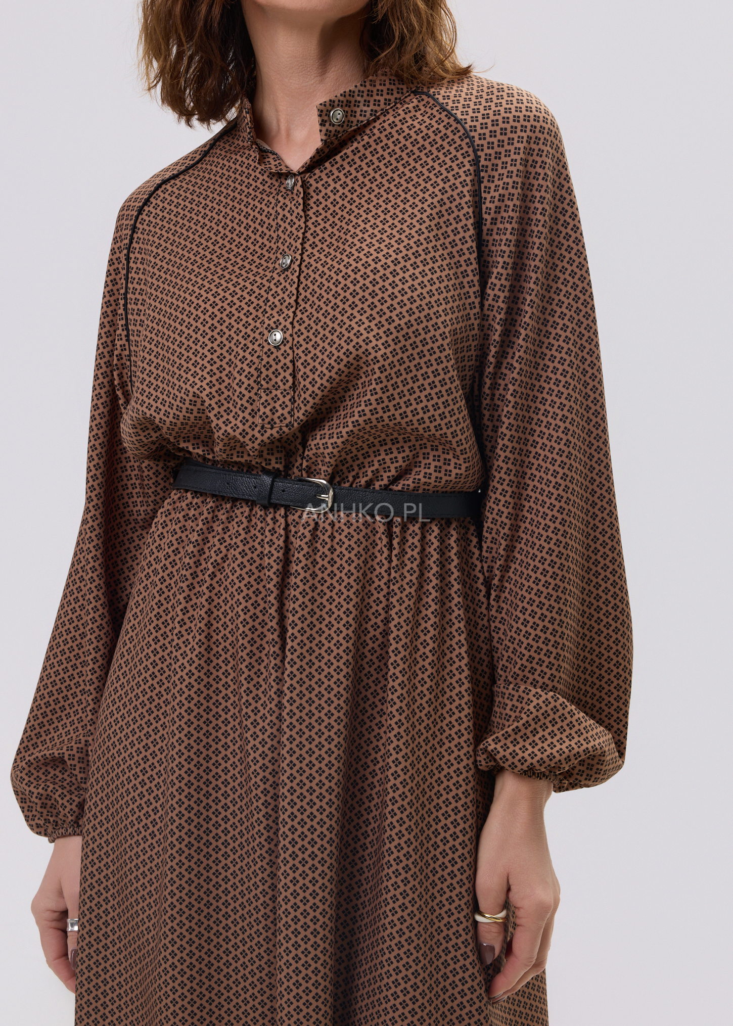 Ta sukienka midi zachwyca subtelnym, geometrycznym printem i ponadczasowym krojem inspirowanym koszulową formą. Model pięknie układa się na sylwetce – lekko rozkloszowany dół zapewnia swobodę ruchów, a delikatne marszczenie w talii podkreśla proporcje figury. Całość dopełnia pasek, który pozwala dopasować fason do własnego stylu.