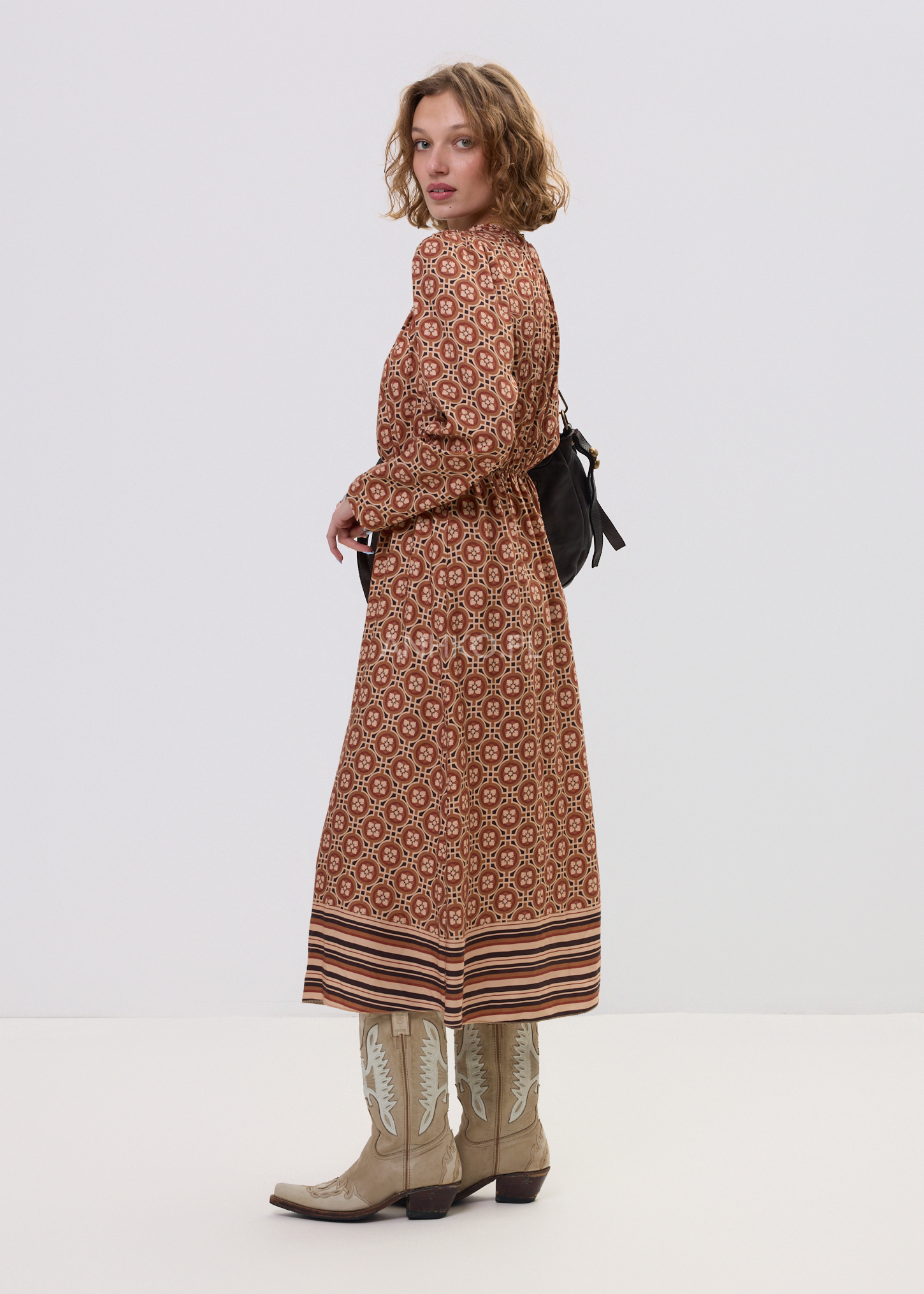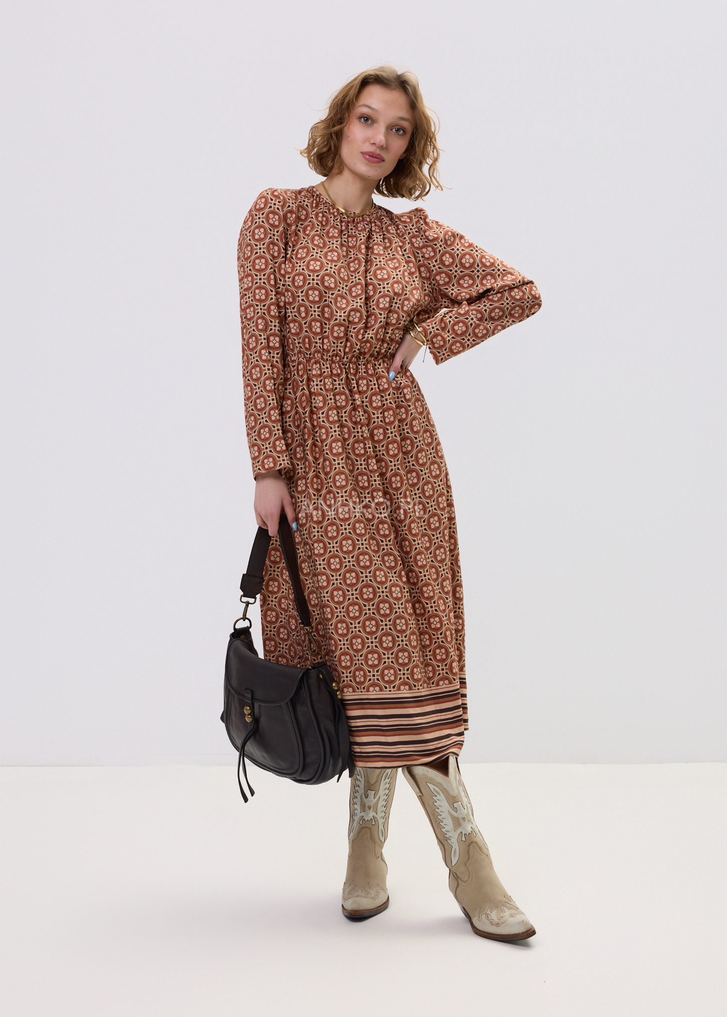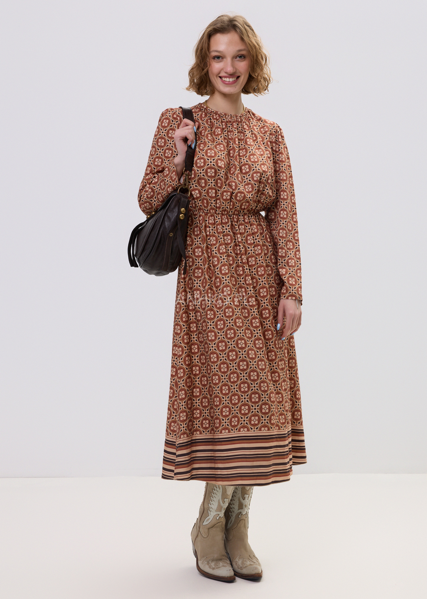 Wyjątkowego charakteru dodają marszczenia przy dekolcie, które biegną wzdłuż przodu sukienki, tworząc efekt subtelnej struktury materiału. Długie rękawy oraz delikatne marszczenia przy ramionach podkreślają elegancki charakter modelu, a ozdobny wzór w odcieniach ciepłego brązu sprawia, że sukienka świetnie komponuje się zarówno z kozakami, jak i bardziej klasycznymi dodatkami.
