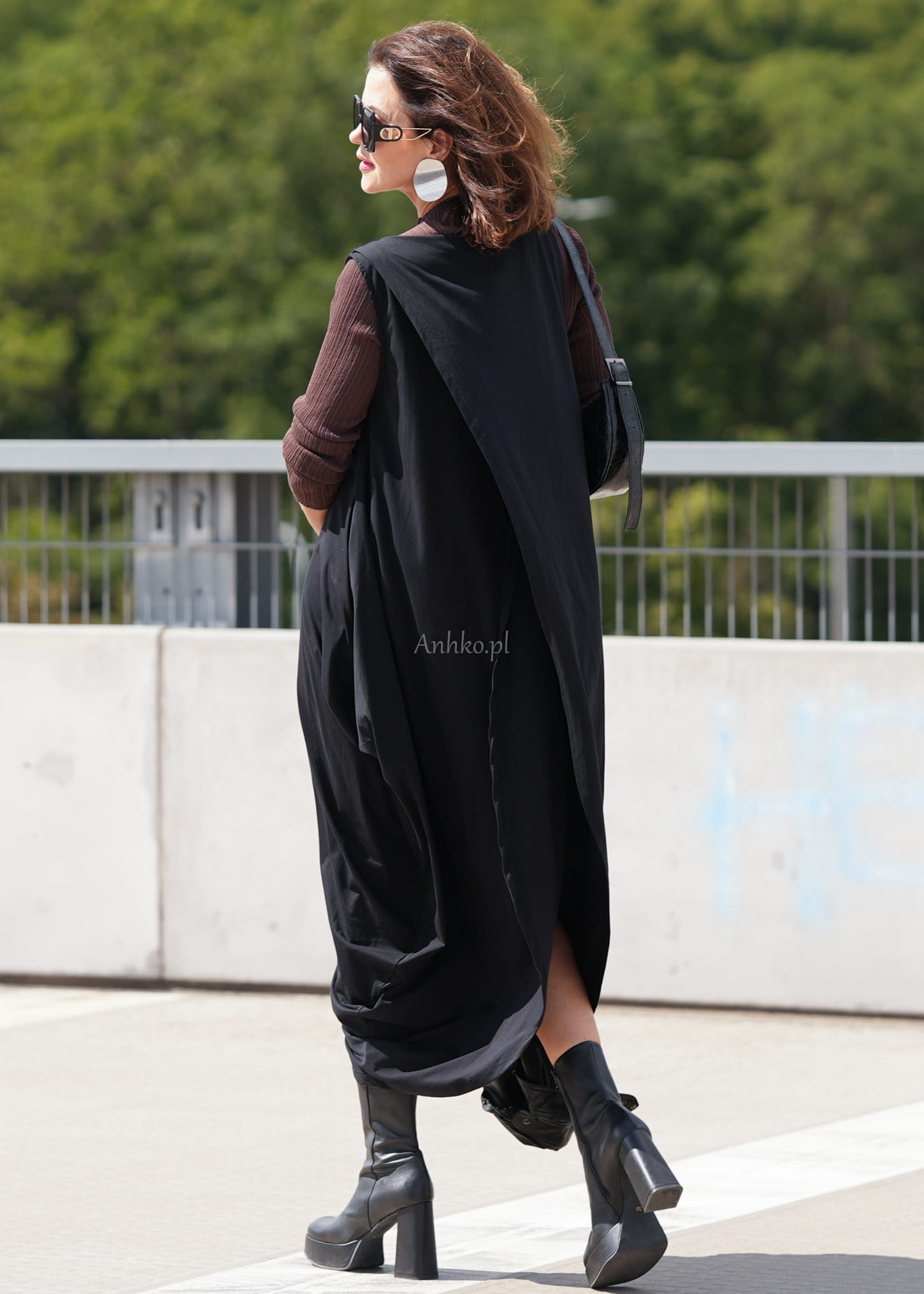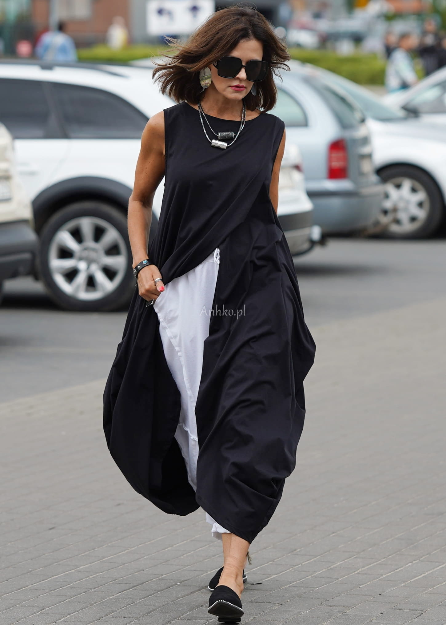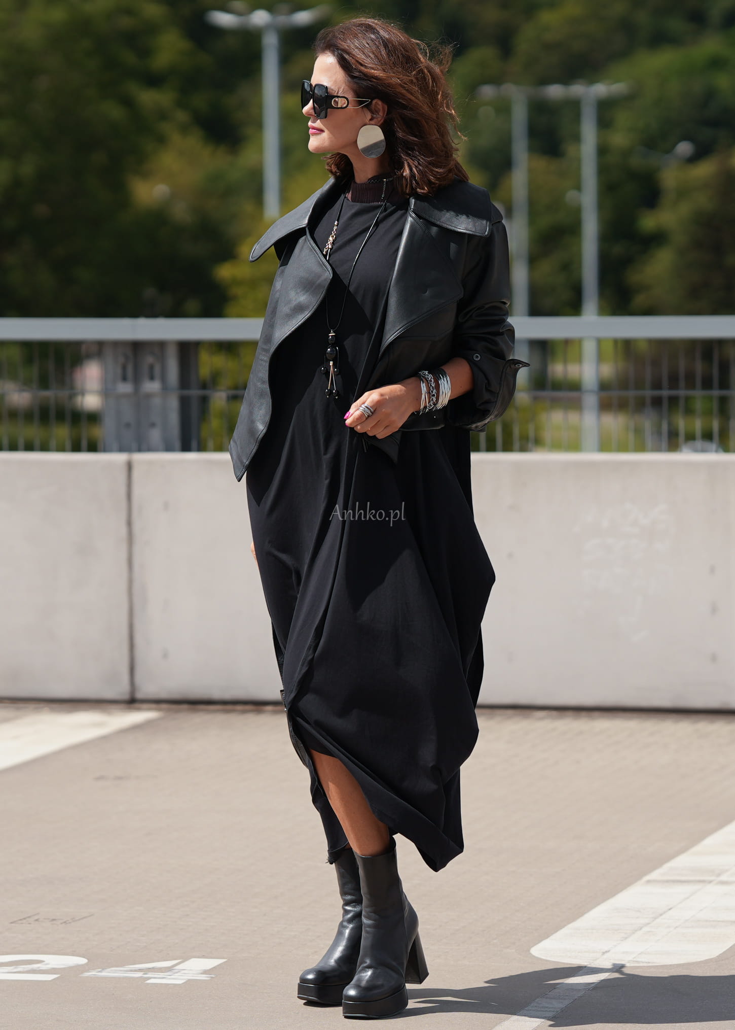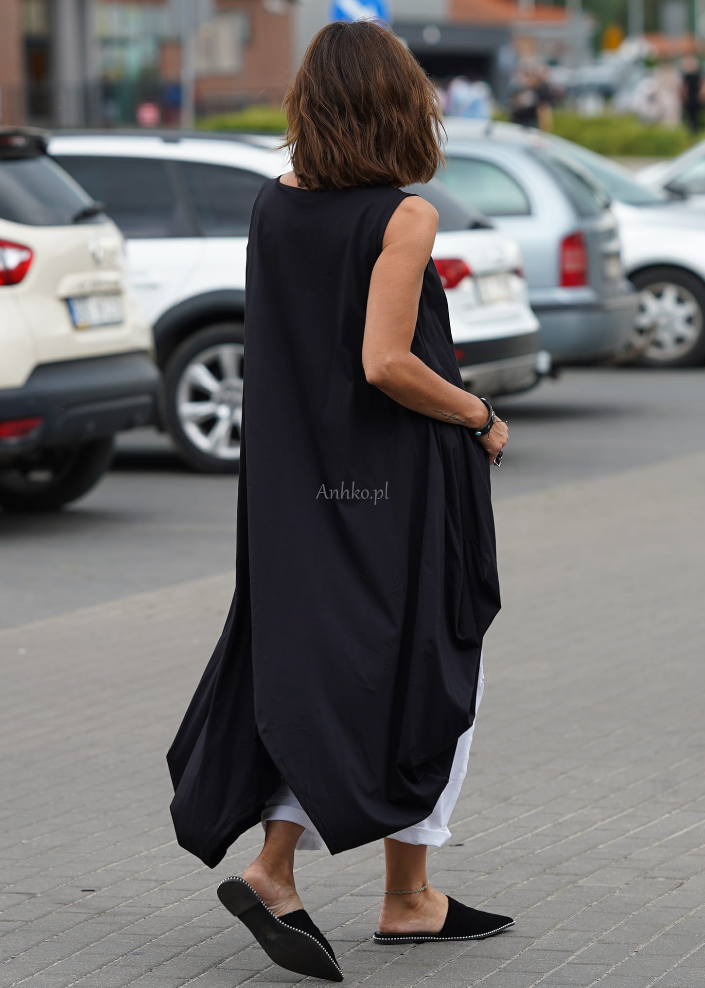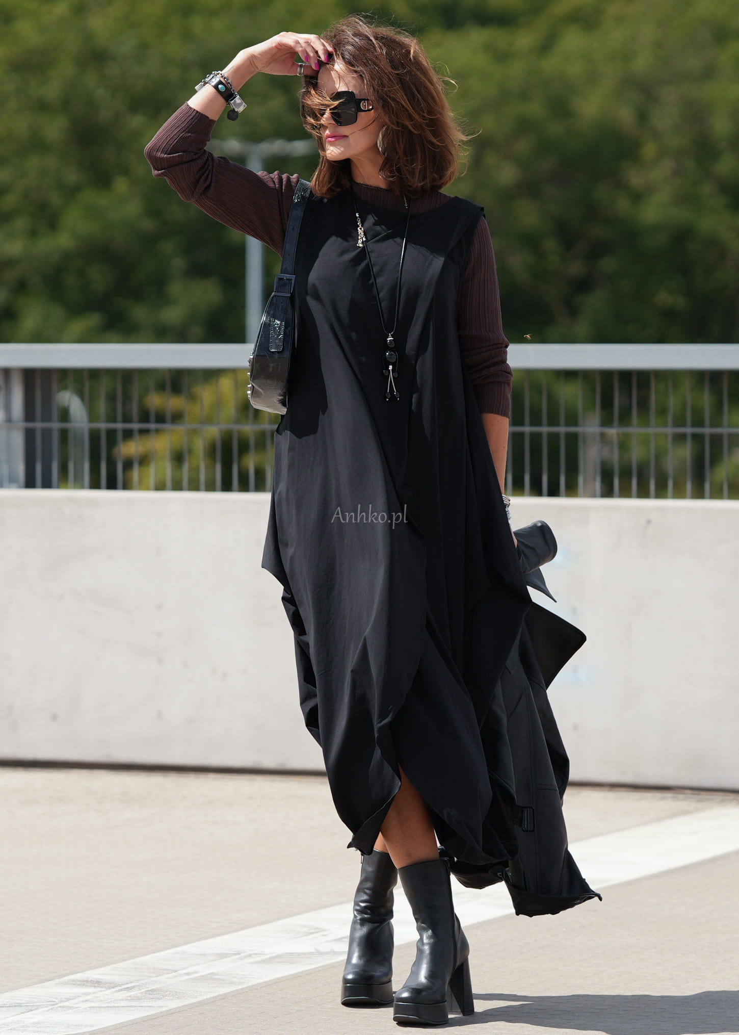 Ta sukienka oversize wyróżnia się asymetrycznym krojem i dynamicznymi zakładkami, które tworzą efektowną, rzeźbiarską sylwetkę. Luźna forma swobodnie układa się na ciele, a wydłużony, nieregularny dół nadaje całości nowoczesnego charakteru. Czarny kolor podkreśla minimalistyczny styl i sprawia, że model prezentuje się wyjątkowo elegancko w każdej odsłonie.