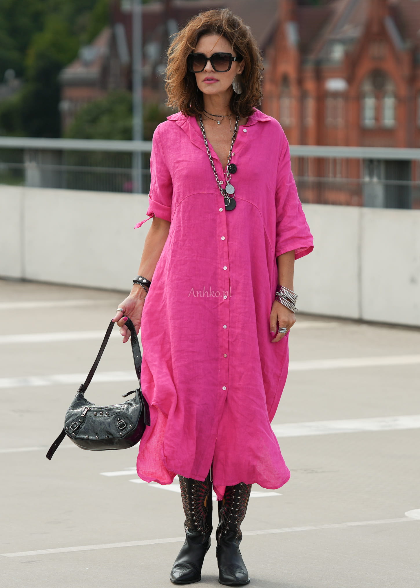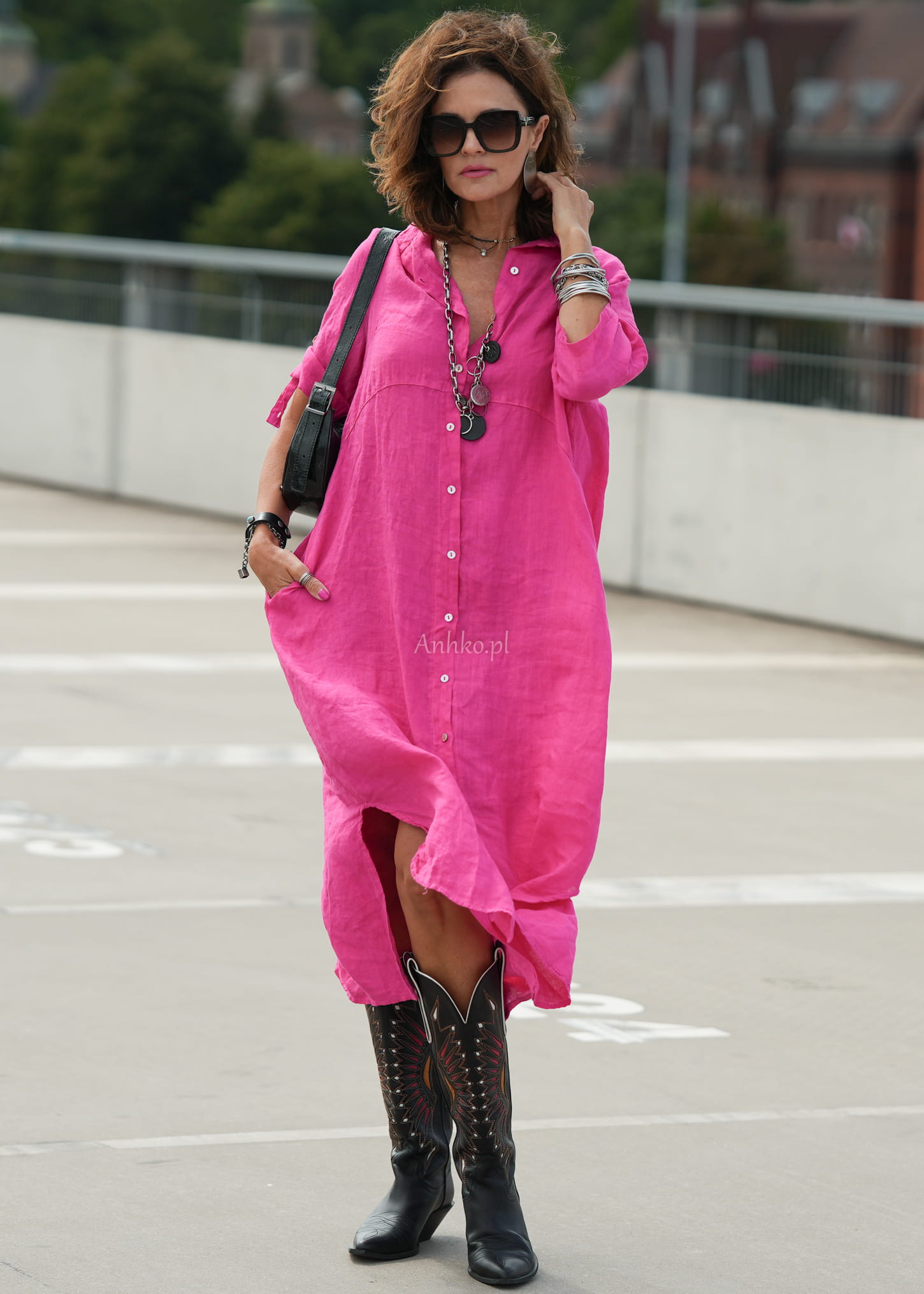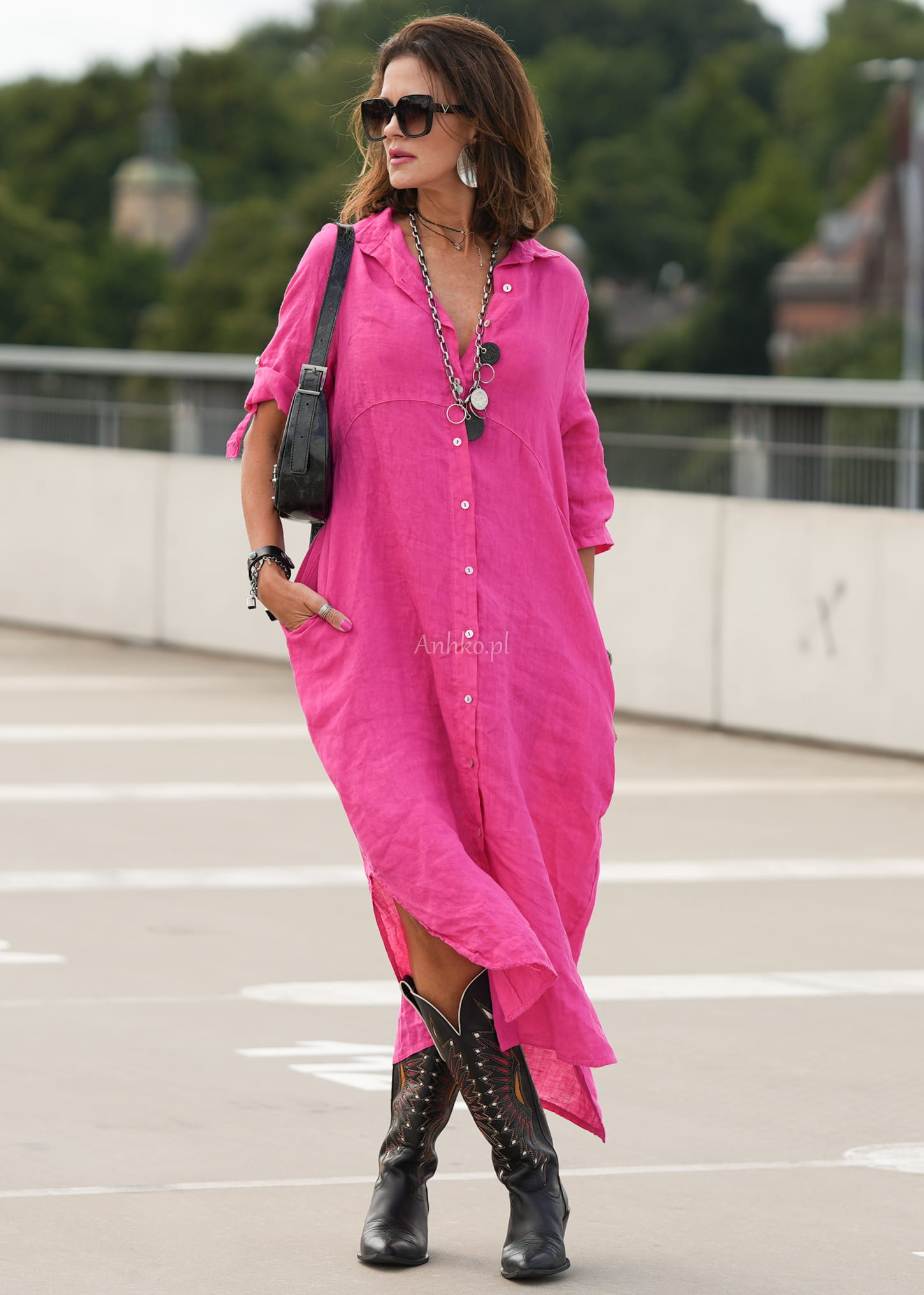Ta sukienka w energetycznym odcieniu różu przyciąga uwagę i pięknie układa się na sylwetce dzięki lekkiej, naturalnej tkaninie. Prosty fason typu szmizjerka delikatnie podkreśla figurę, a długość maxi optycznie wydłuża linię ciała. Swobodnie opadający materiał pracuje przy ruchu, nadając stylizacji lekkości i dynamicznego charakteru.