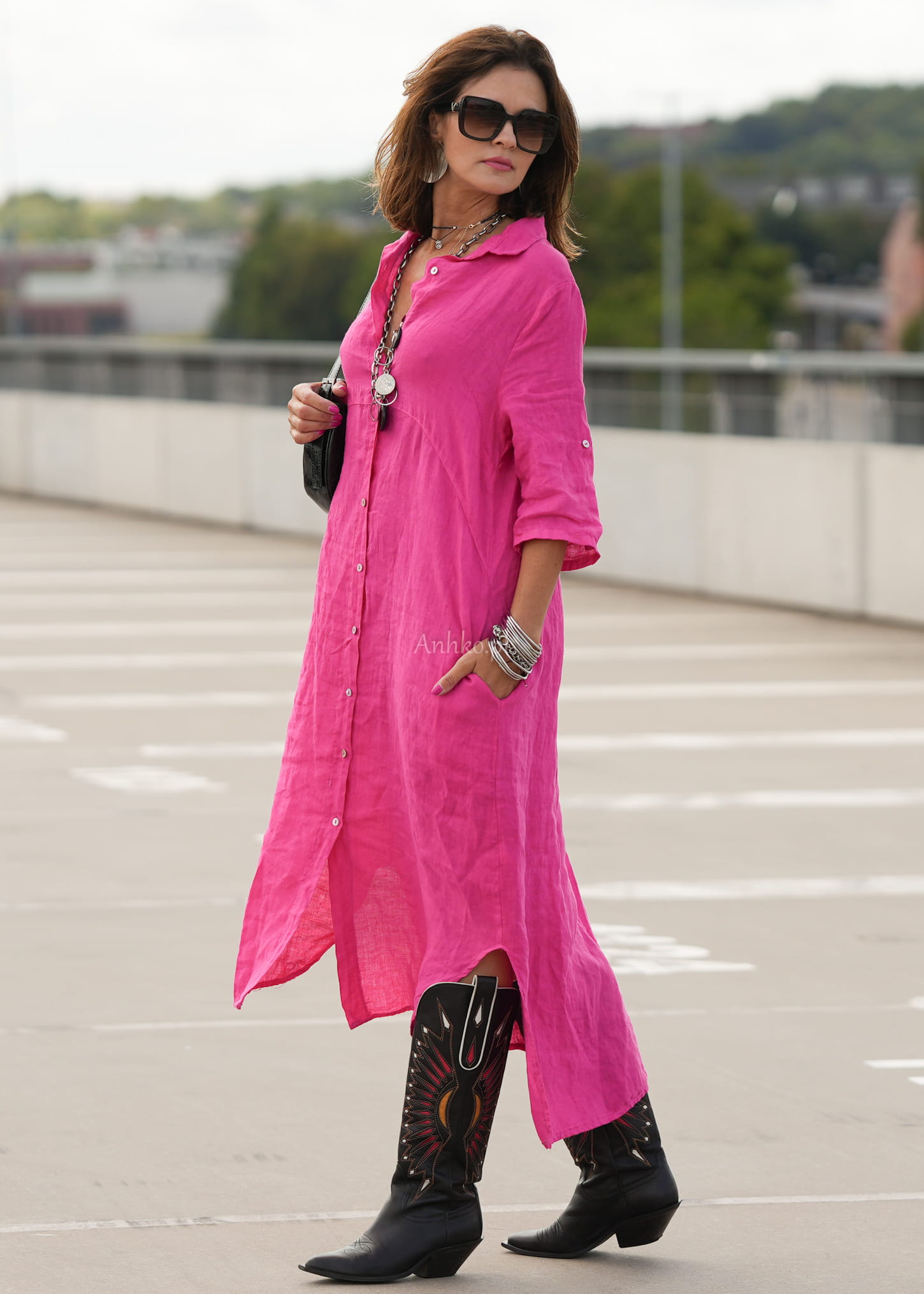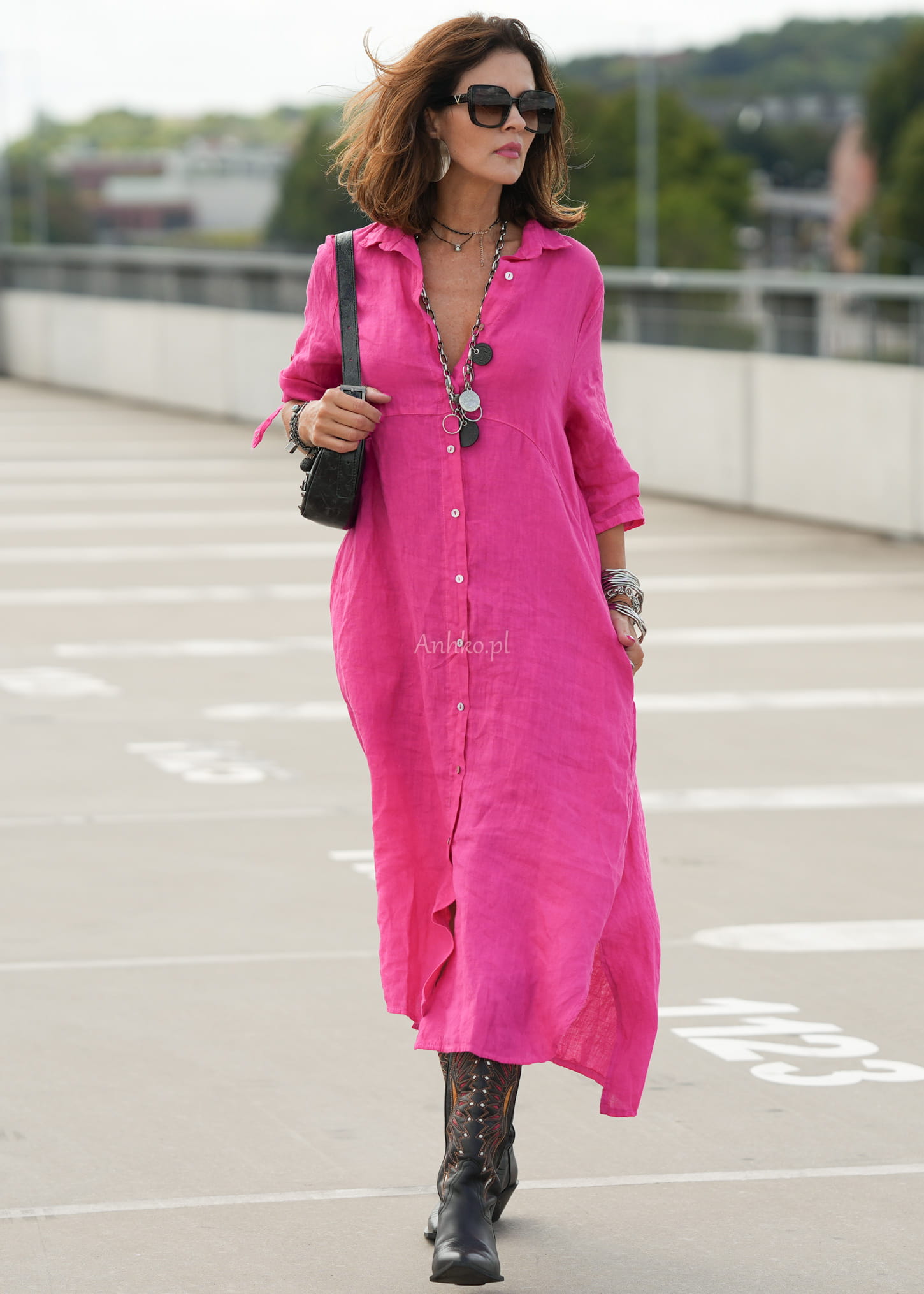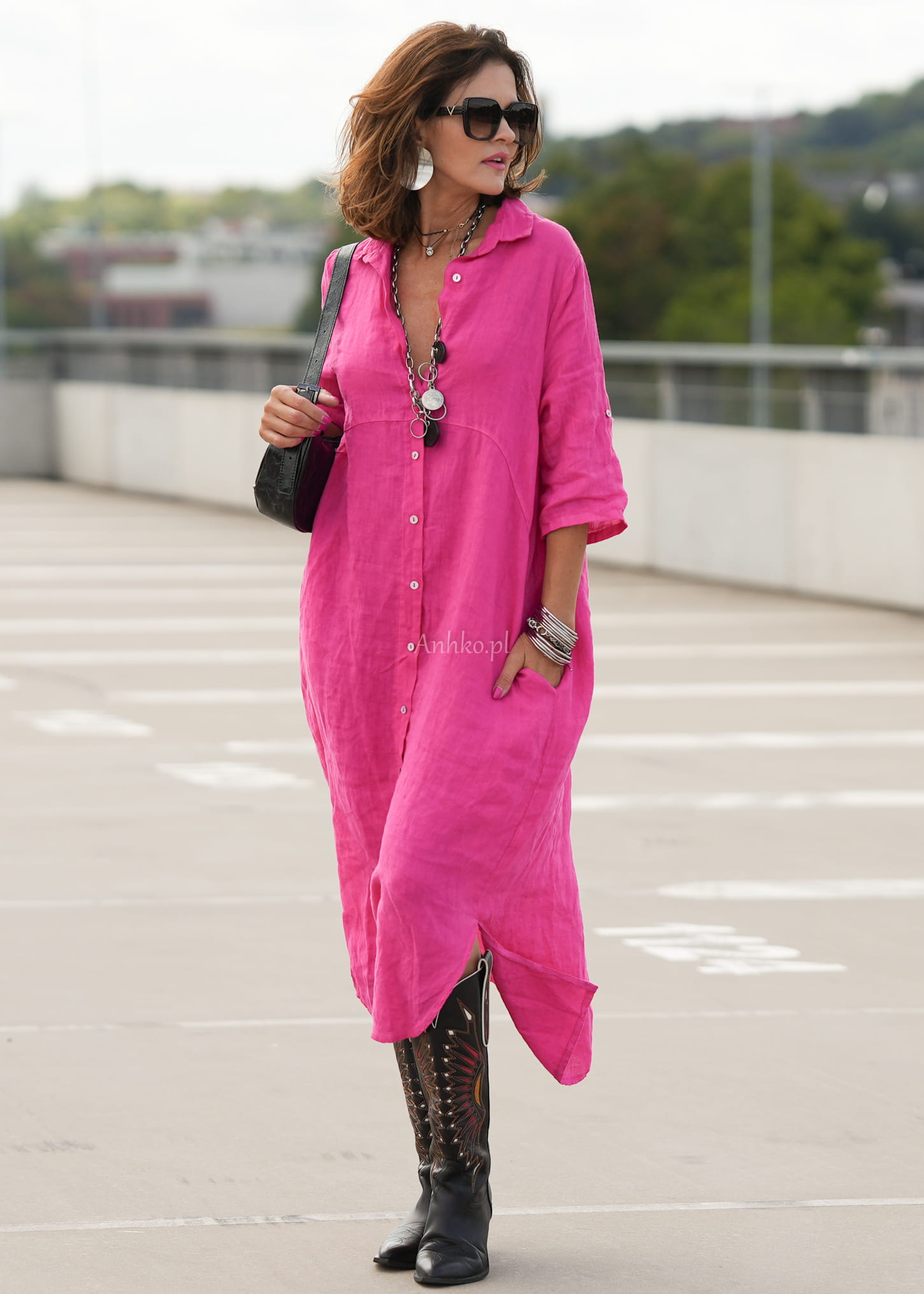 Ta sukienka w energetycznym odcieniu różu przyciąga uwagę i pięknie układa się na sylwetce dzięki lekkiej, naturalnej tkaninie. Prosty fason typu szmizjerka delikatnie podkreśla figurę, a długość maxi optycznie wydłuża linię ciała. Swobodnie opadający materiał pracuje przy ruchu, nadając stylizacji lekkości i dynamicznego charakteru.