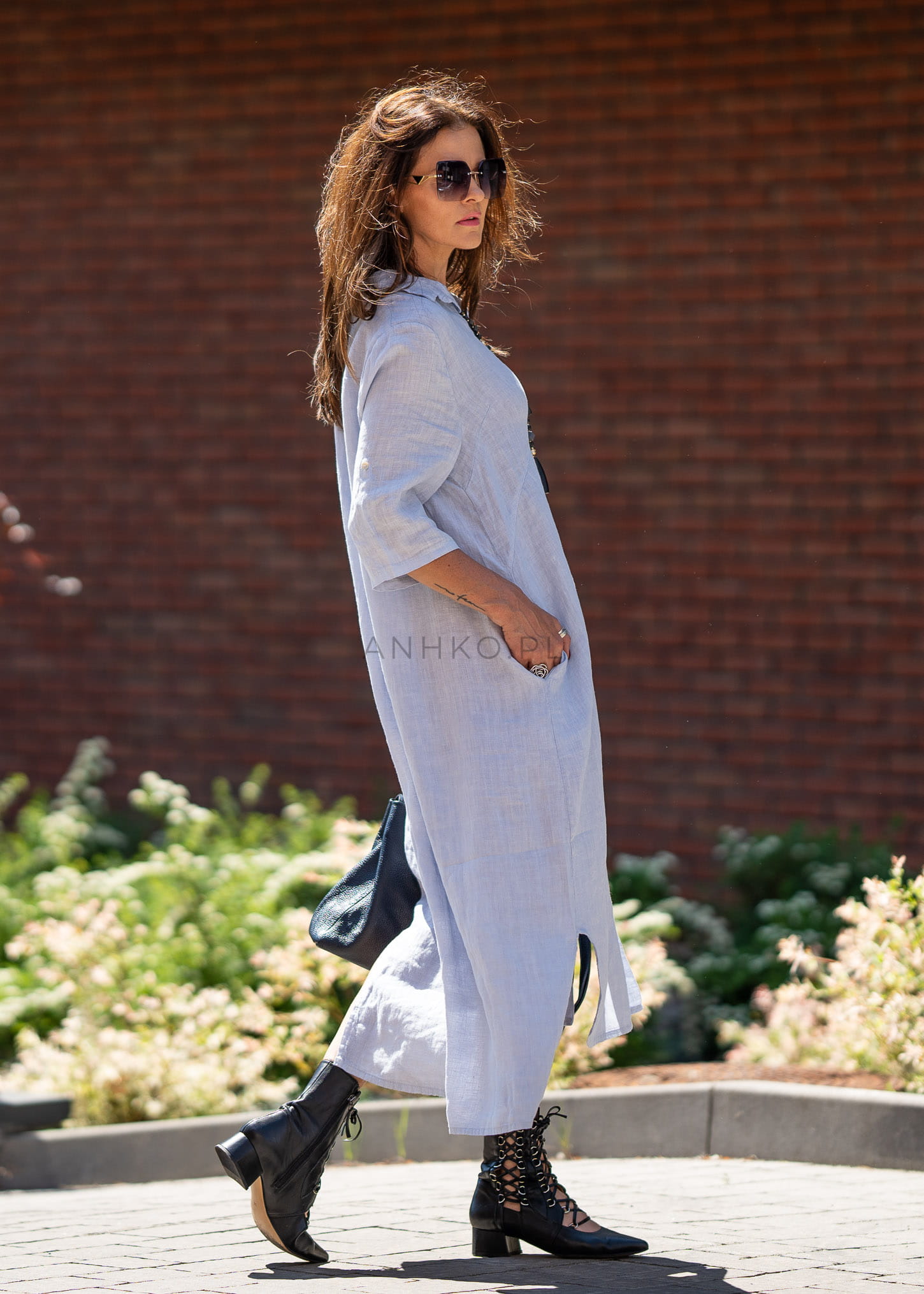 Model w stylu szmizjerki wyróżnia się naturalną lnianą tkaniną oraz subtelnym kołnierzykiem, który dodaje elegancji. Rękaw z możliwością podpięcia zwiększa funkcjonalność, a luźna forma sprawia, że sukienka doskonale wpisuje się w codzienny, jak i bardziej dopracowany look.