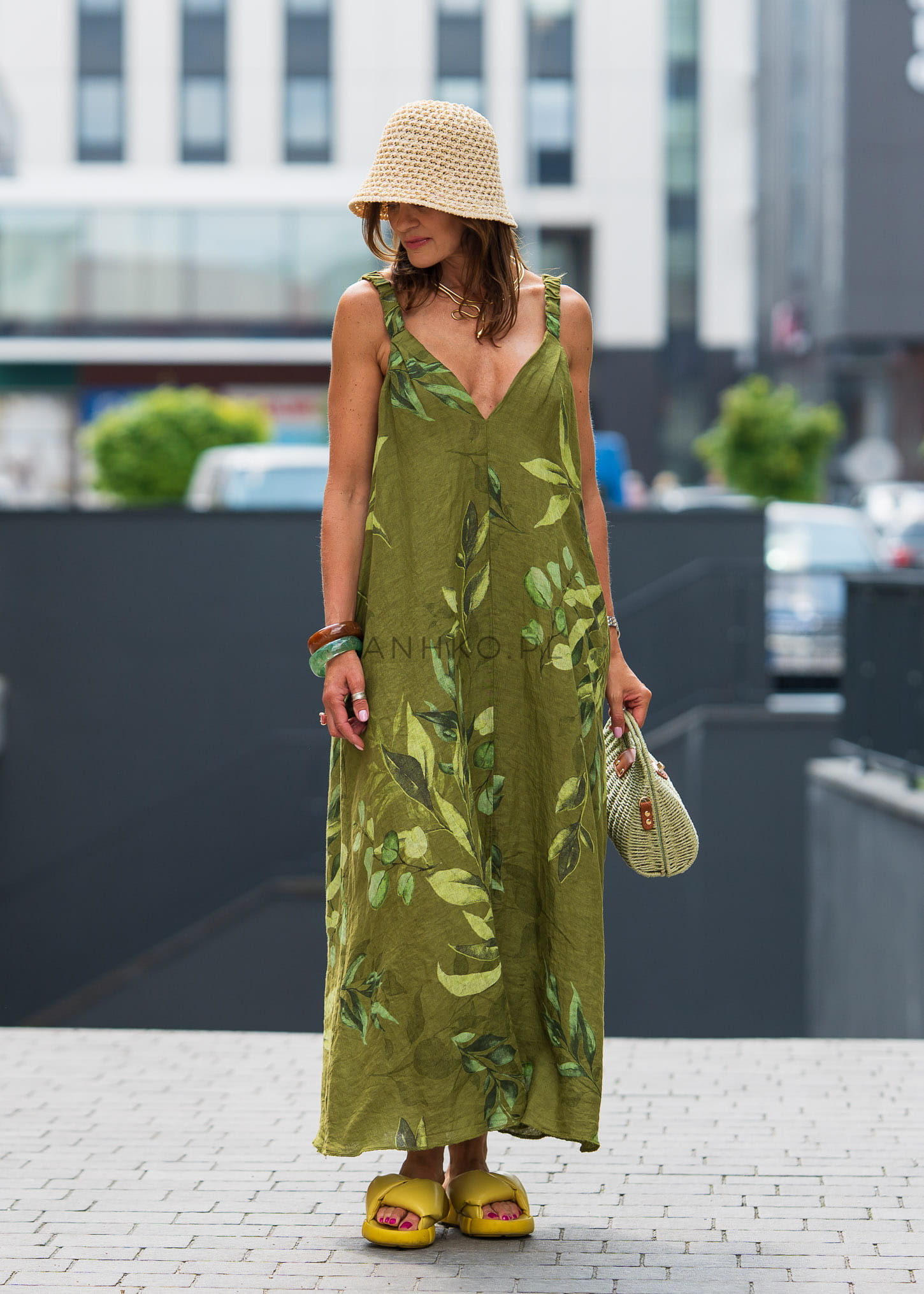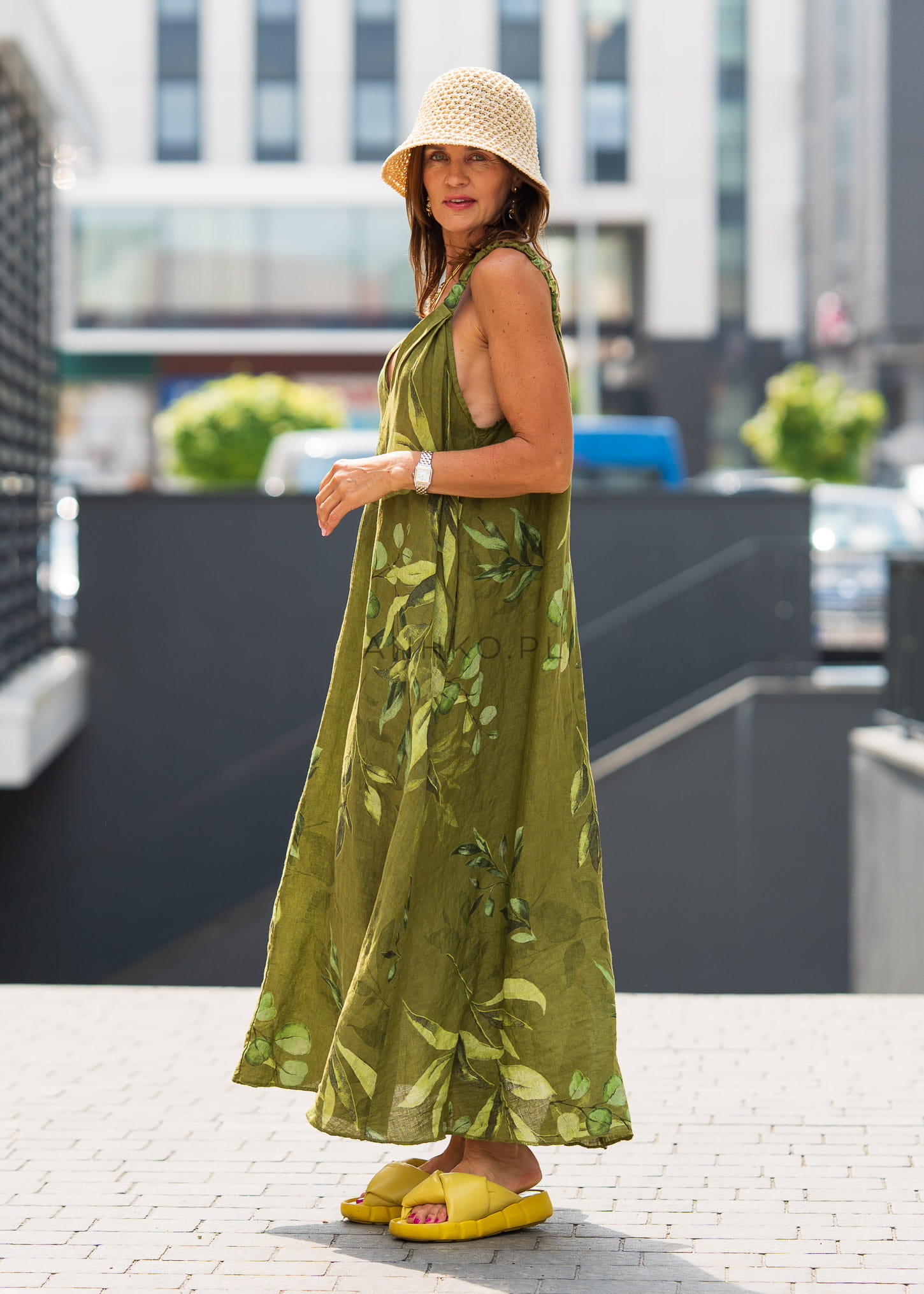 Ta sukienka lniana o luźnym kroju miękko układa się na sylwetce, tworząc lekki, swobodny efekt podczas ruchu. Długa linia maxi oraz delikatnie rozszerzana forma sprawiają, że materiał naturalnie opływa ciało, zapewniając komfort i elegancki luz. Botaniczny print w odcieniach zieleni przyciąga wzrok i nadaje całości wyjątkowego charakteru inspirowanego naturą.