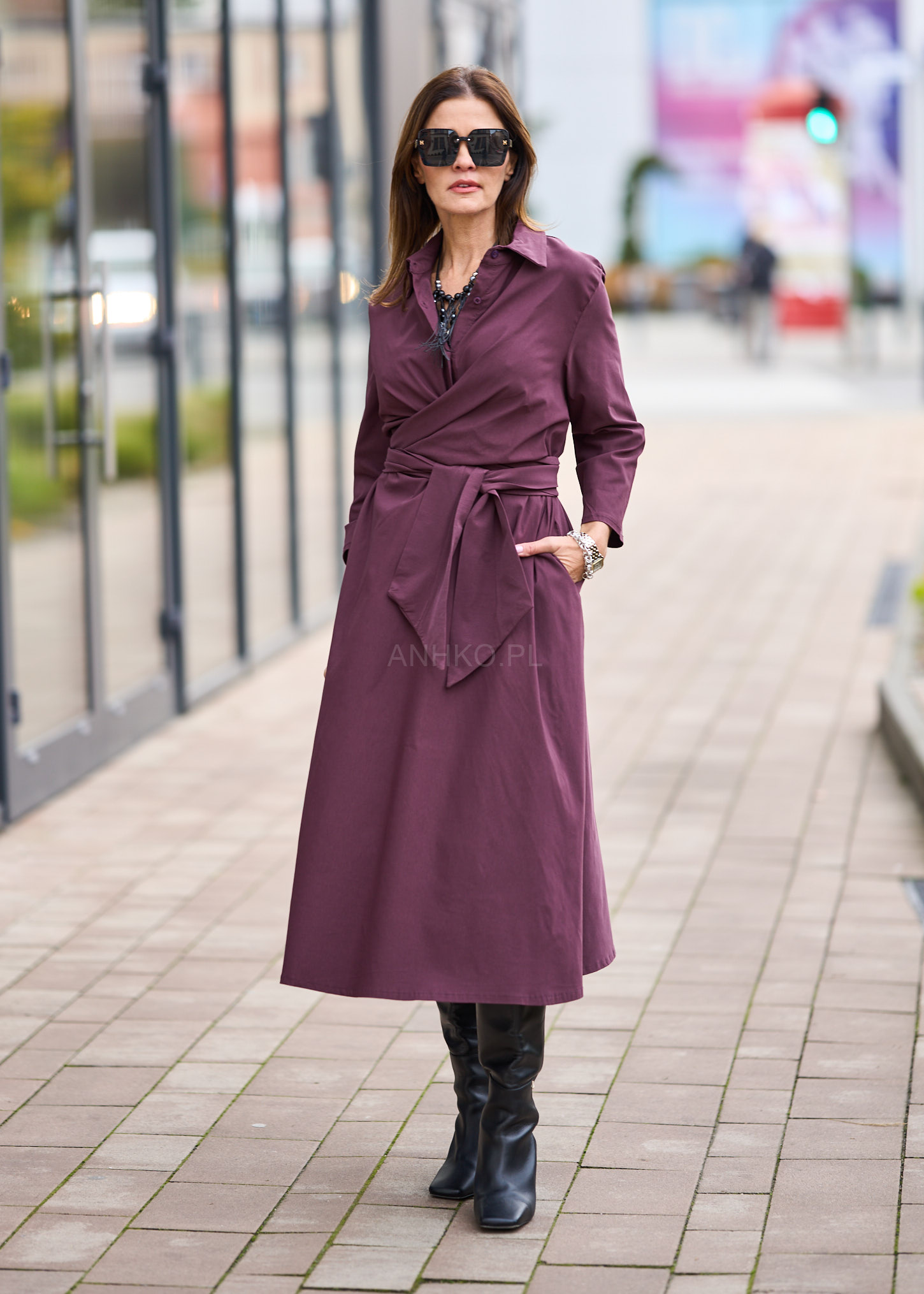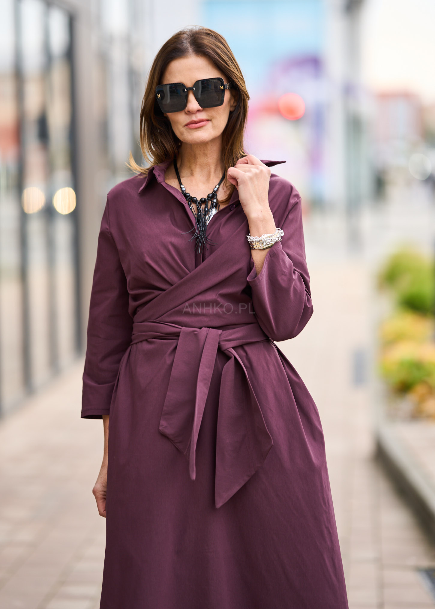Model zapinany do połowy na guziki zapewnia wygodę i funkcjonalność. Długość maxi w połączeniu z długim rękawem nadaje całości eleganckiego charakteru, a możliwość różnego sposobu przewiązania pasków sprawia, że sukienka zyskuje indywidualny wyraz – od codziennego minimalizmu po bardziej dopracowaną formę.