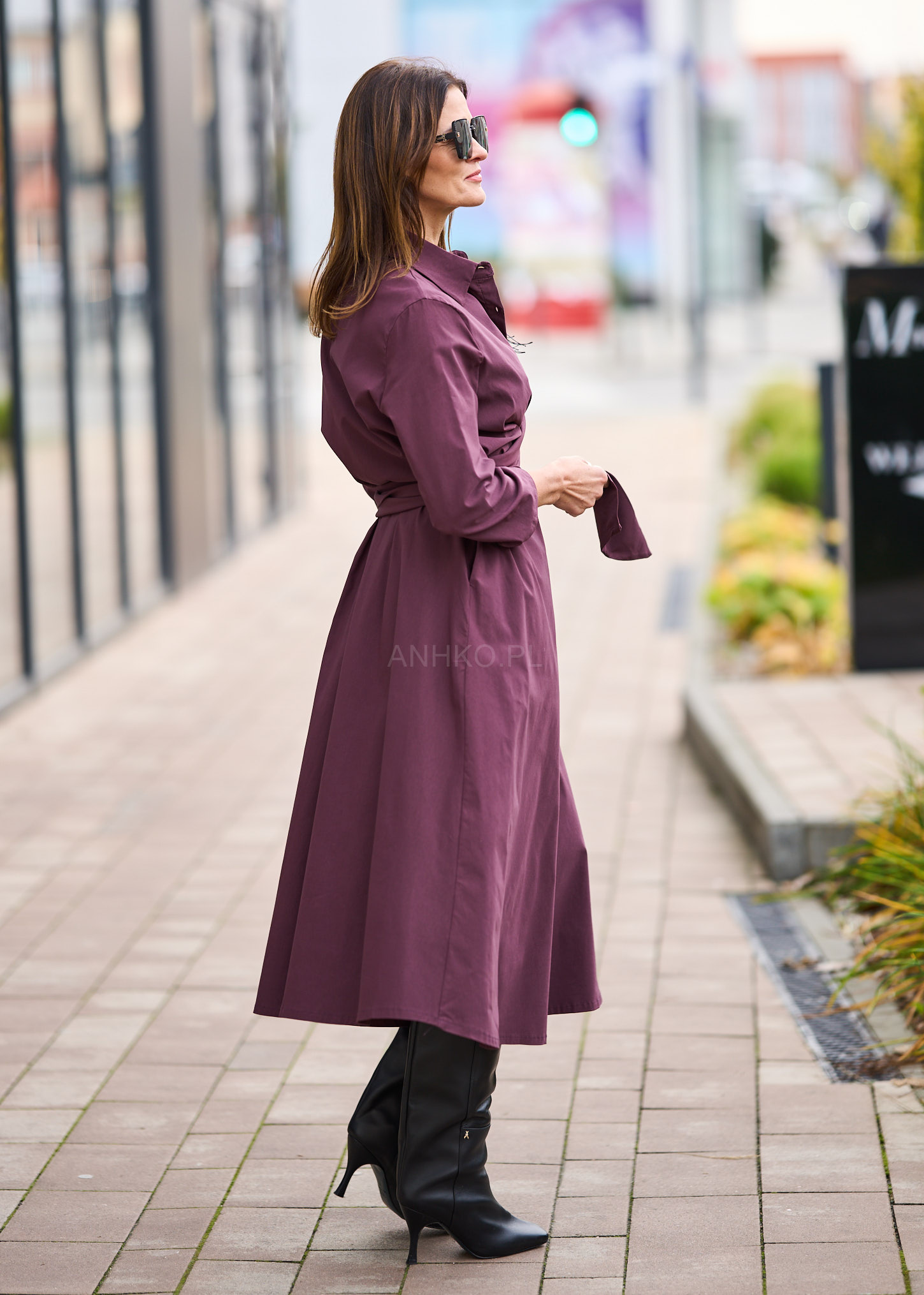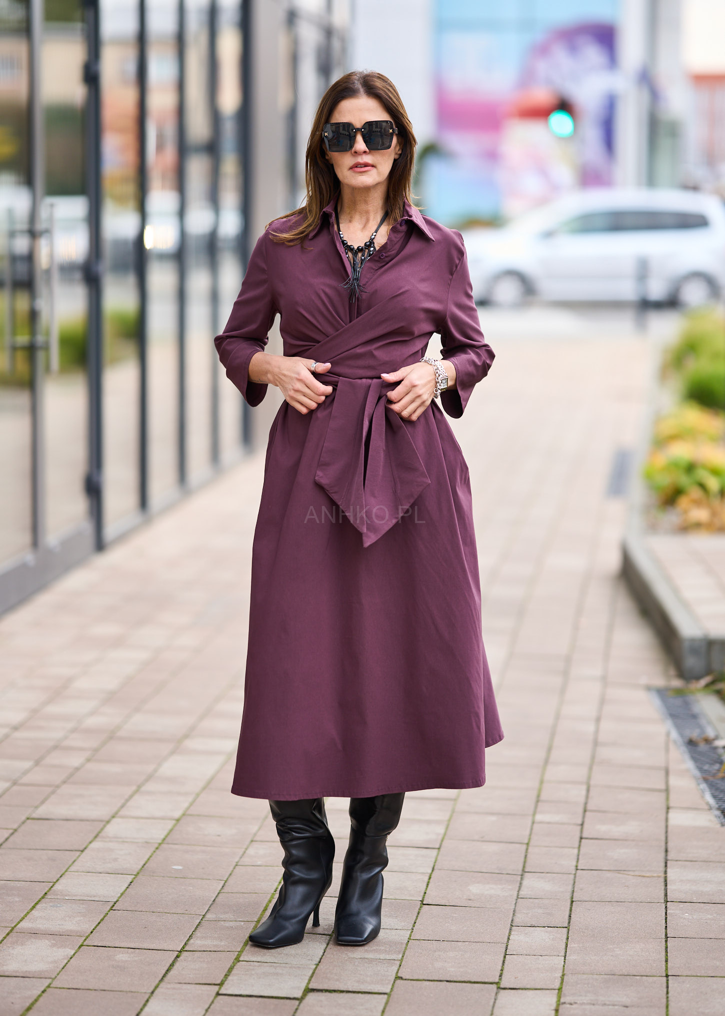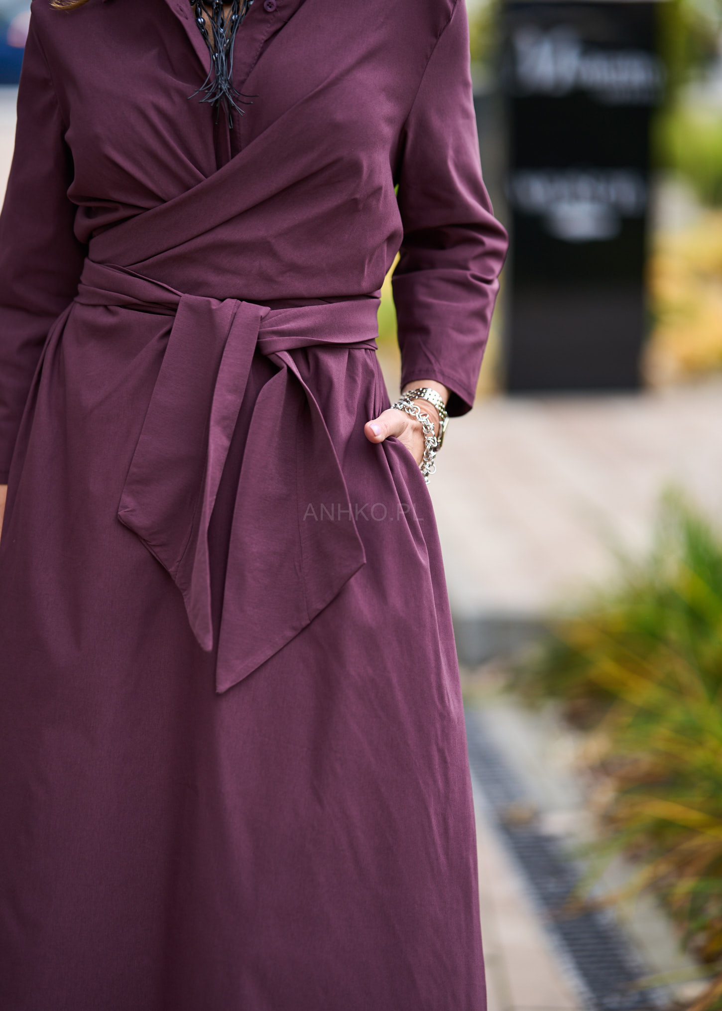 Ta sukienka midi damska w śliwkowym kolorze łączy minimalistyczną formę z kobiecym detalem podkreślającym talię. Swobodna góra z dekoltem w kształcie litery V miękko układa się na sylwetce, a wiązanie w pasie pozwala modelować proporcje według własnych preferencji. Tkanina delikatnie opływa ciało, tworząc harmonijną, wydłużoną linię.