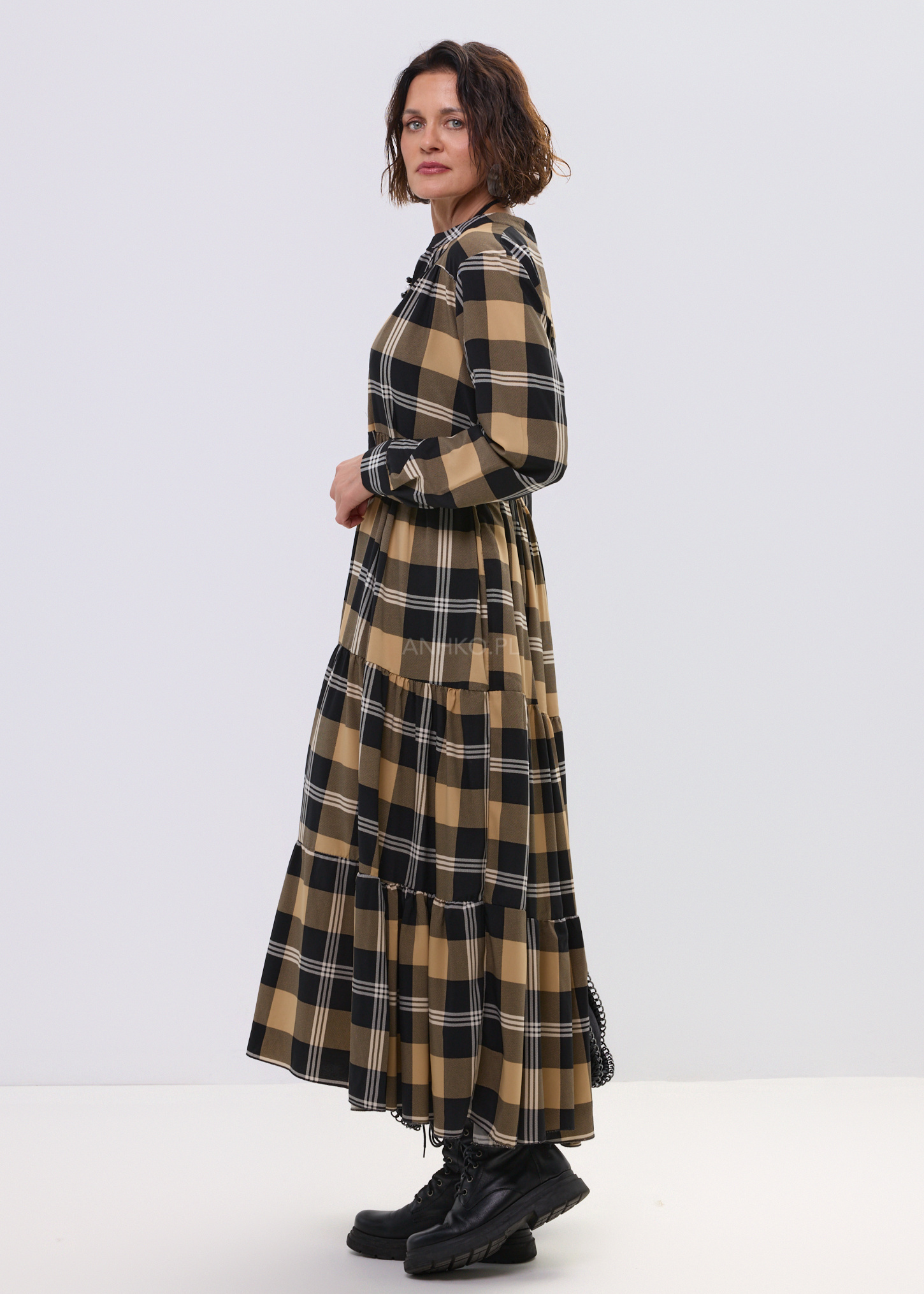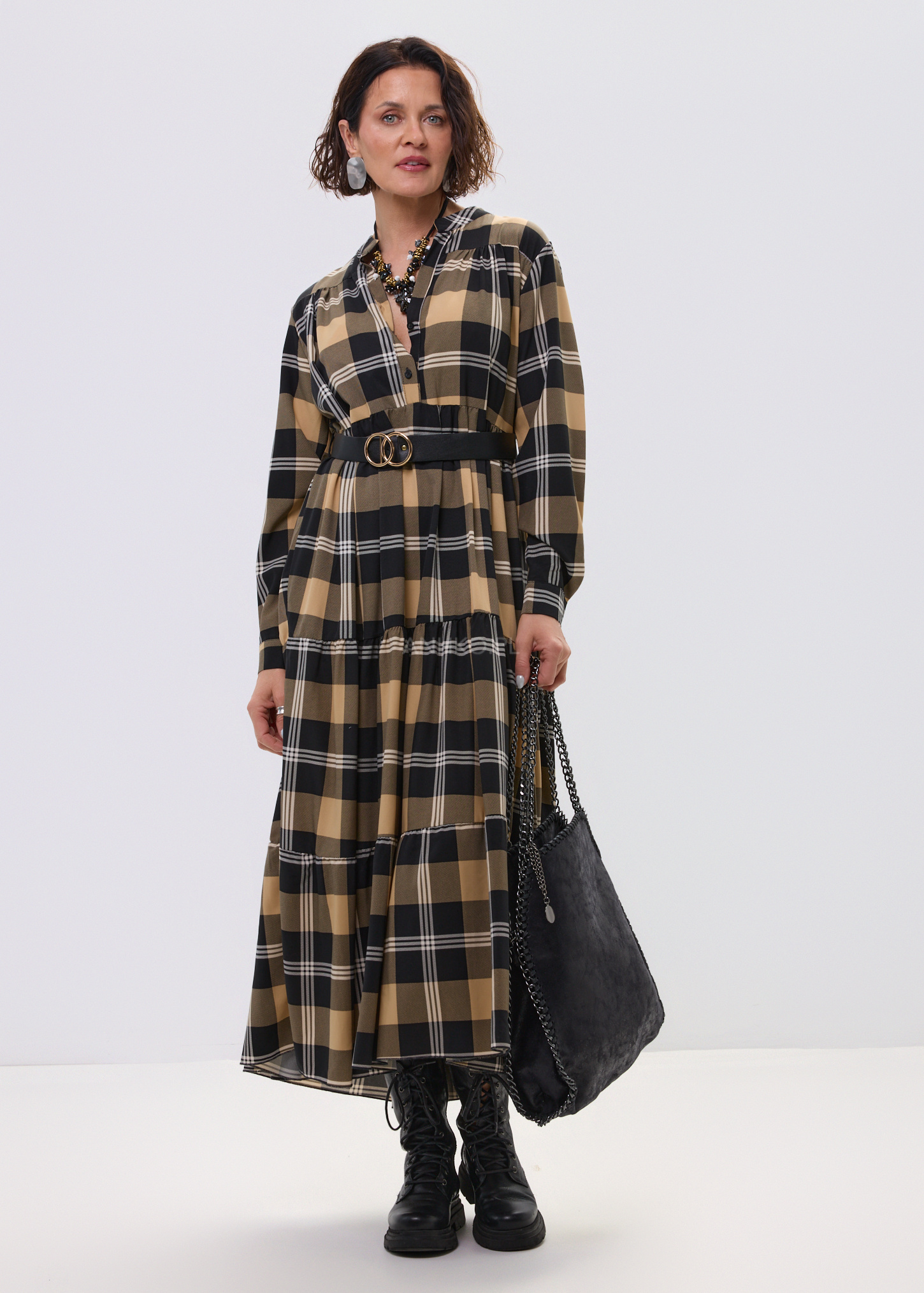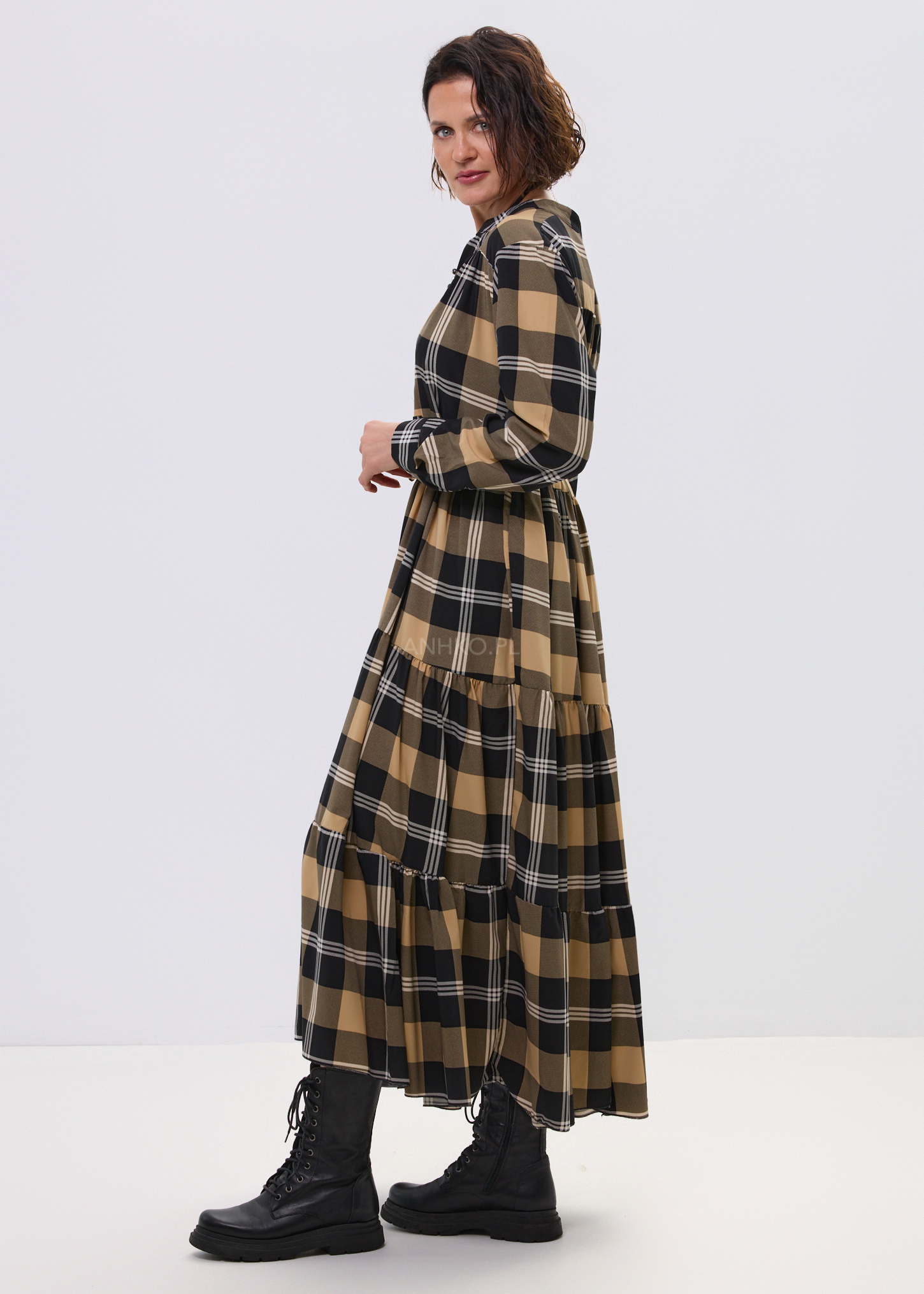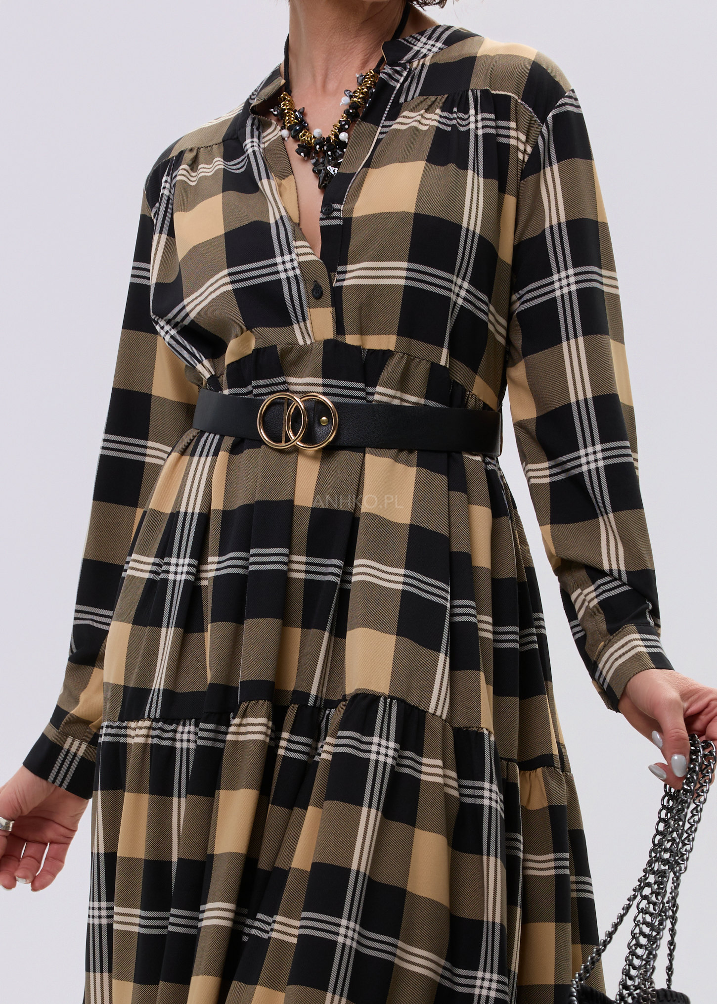 Wykonana jest w stylu koszulowym o oversizowym kroju. Ma ona dekolt V-neck zapinany na guziki, pasek oraz jest zakończona trzema falbanami. Całość dopełnia piękny print w kratkę.