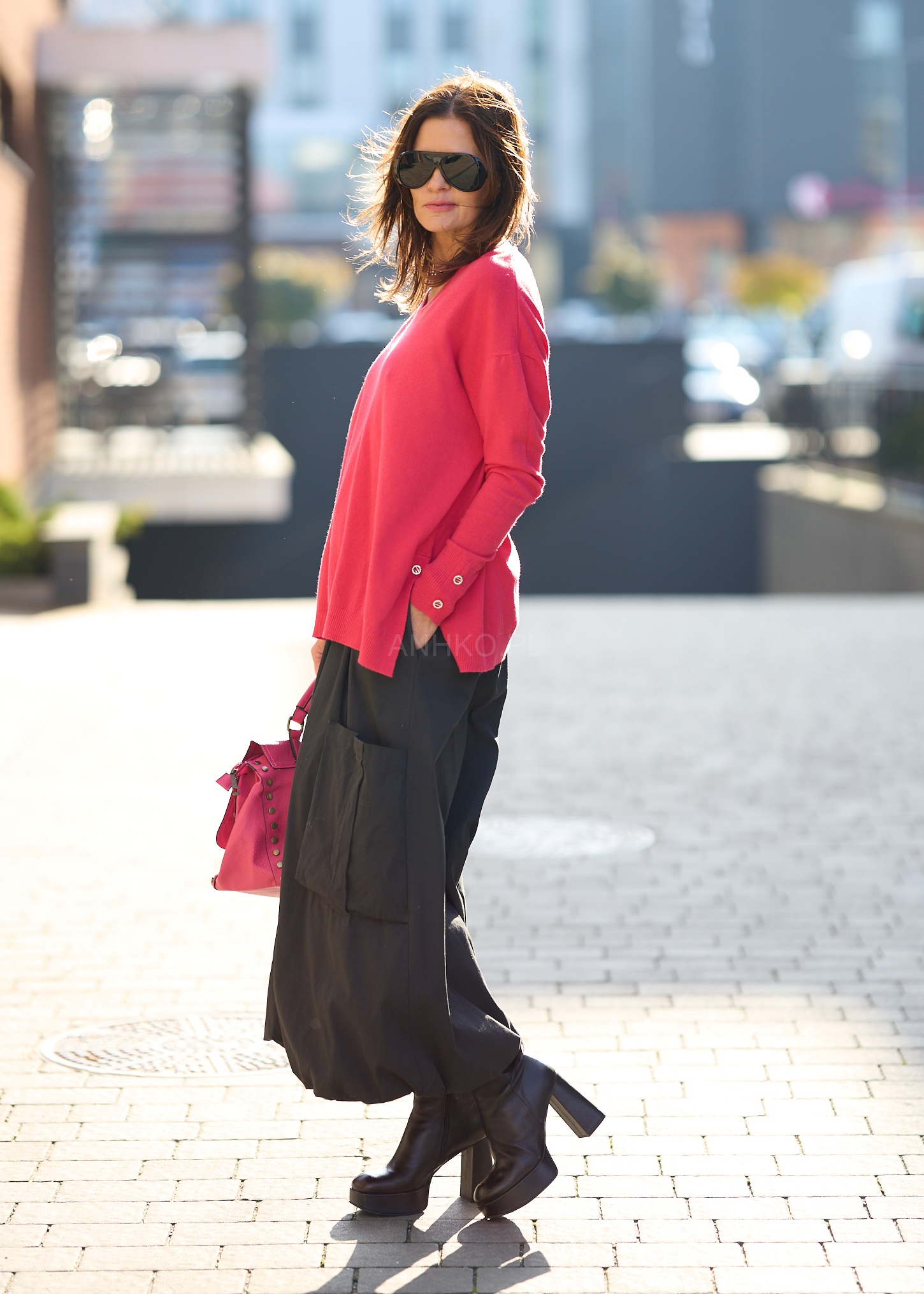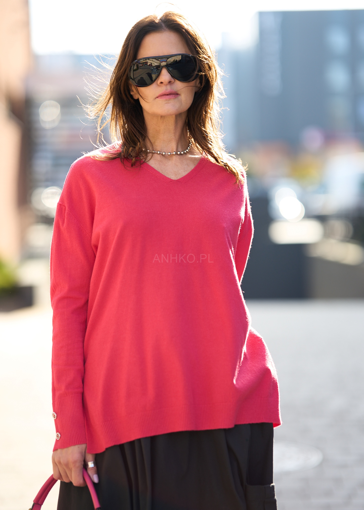 Model, który łączy wygodę z odważną, pełną życia kolorystyką. Miękka dzianina przyjemnie otula sylwetkę, a dekolt V pięknie wysmukla i dodaje lekkości. Prosty fason pozwala nosić go zarówno na co dzień, jak i w bardziej stylizowanych zestawach. Doskonale wygląda z czernią, jeansem, bielą czy pastelami, tworząc nowoczesne kontrasty. Idealny do pracy, na spotkania, spacery lub weekendowe wyjścia — gdy chcesz dodać stylizacji energii i subtelnej elegancji.