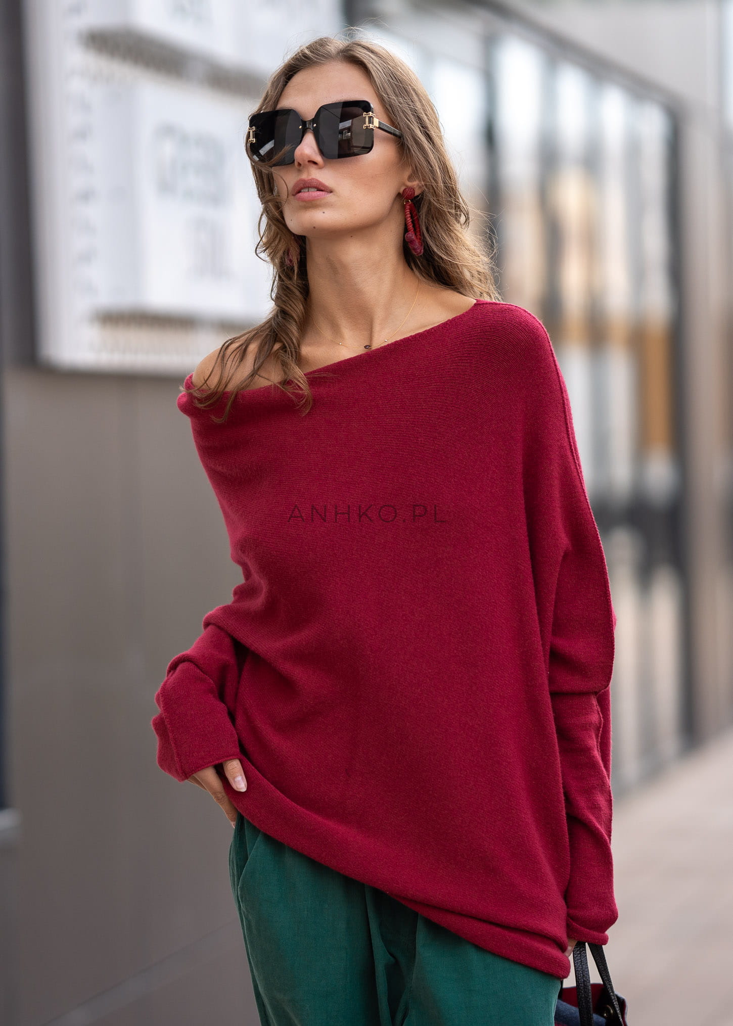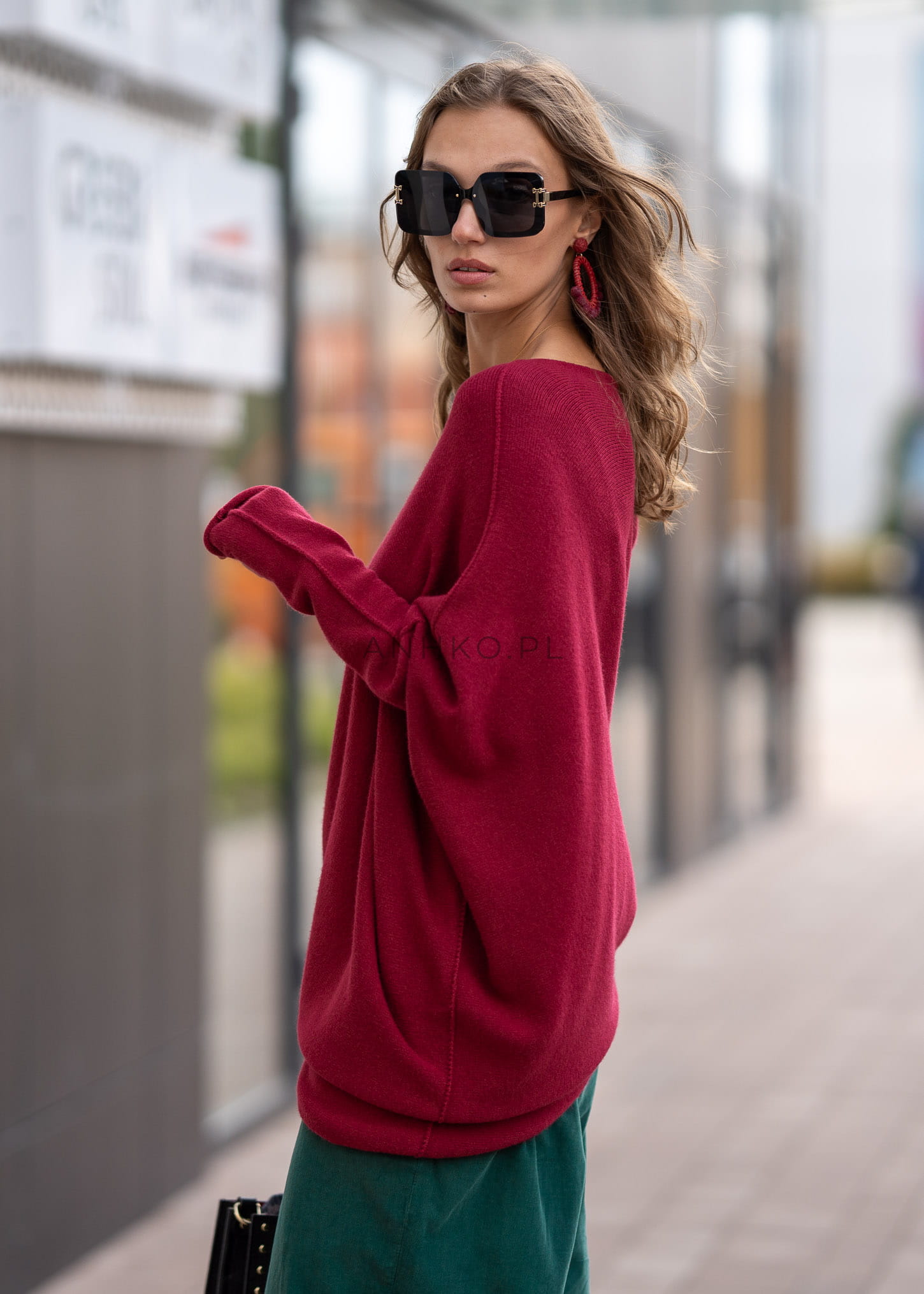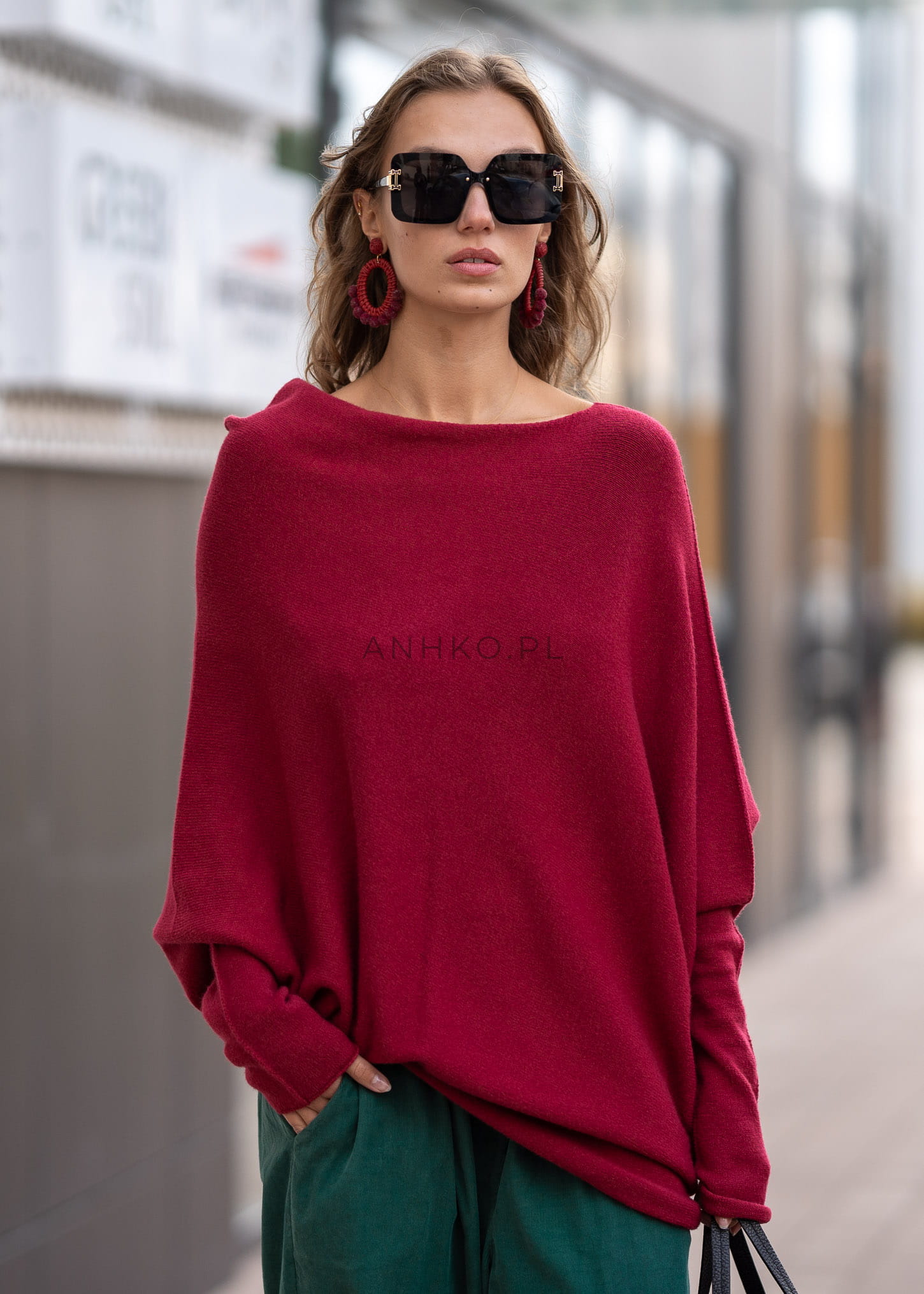 Ten sweter oversize w kolorze bordo przyciąga uwagę wyrazistą barwą i luźnym, nietoperzowym krojem. Miękka dzianina naturalnie układa się na sylwetce, zapewniając komfort oraz efekt lekkości niezależnie od stylizacji.