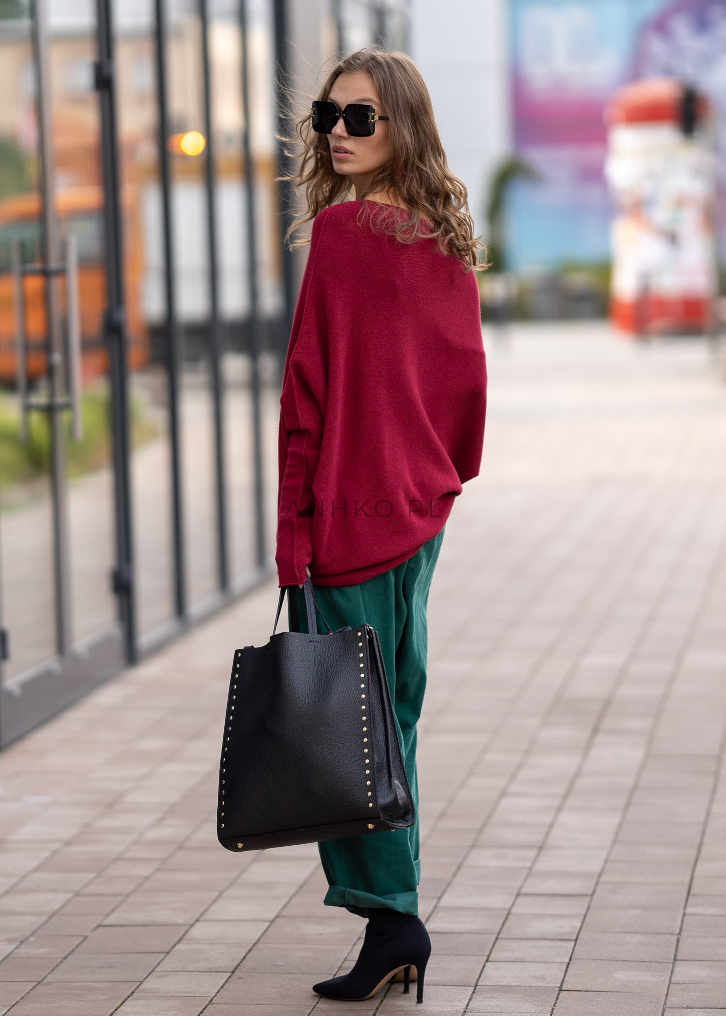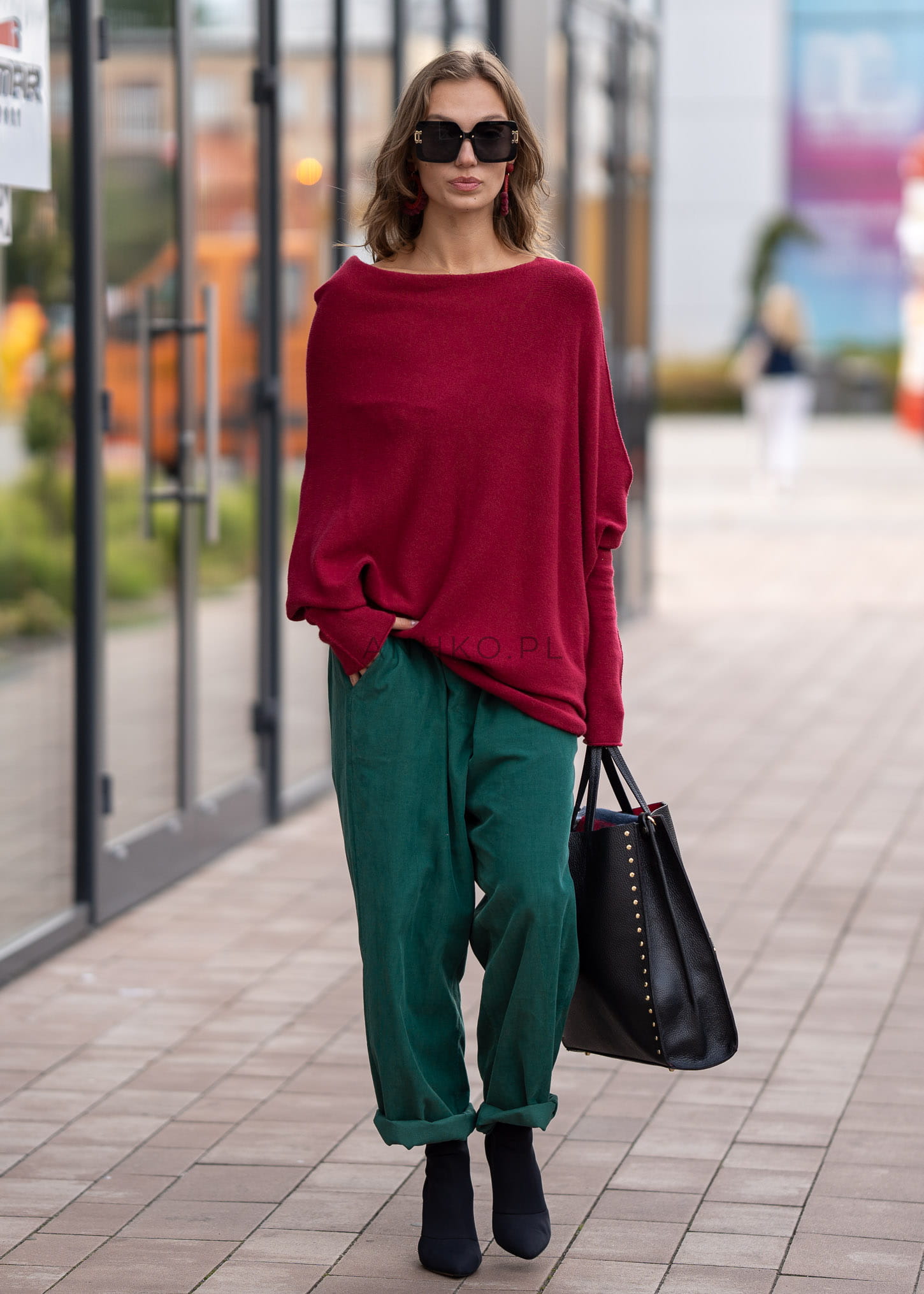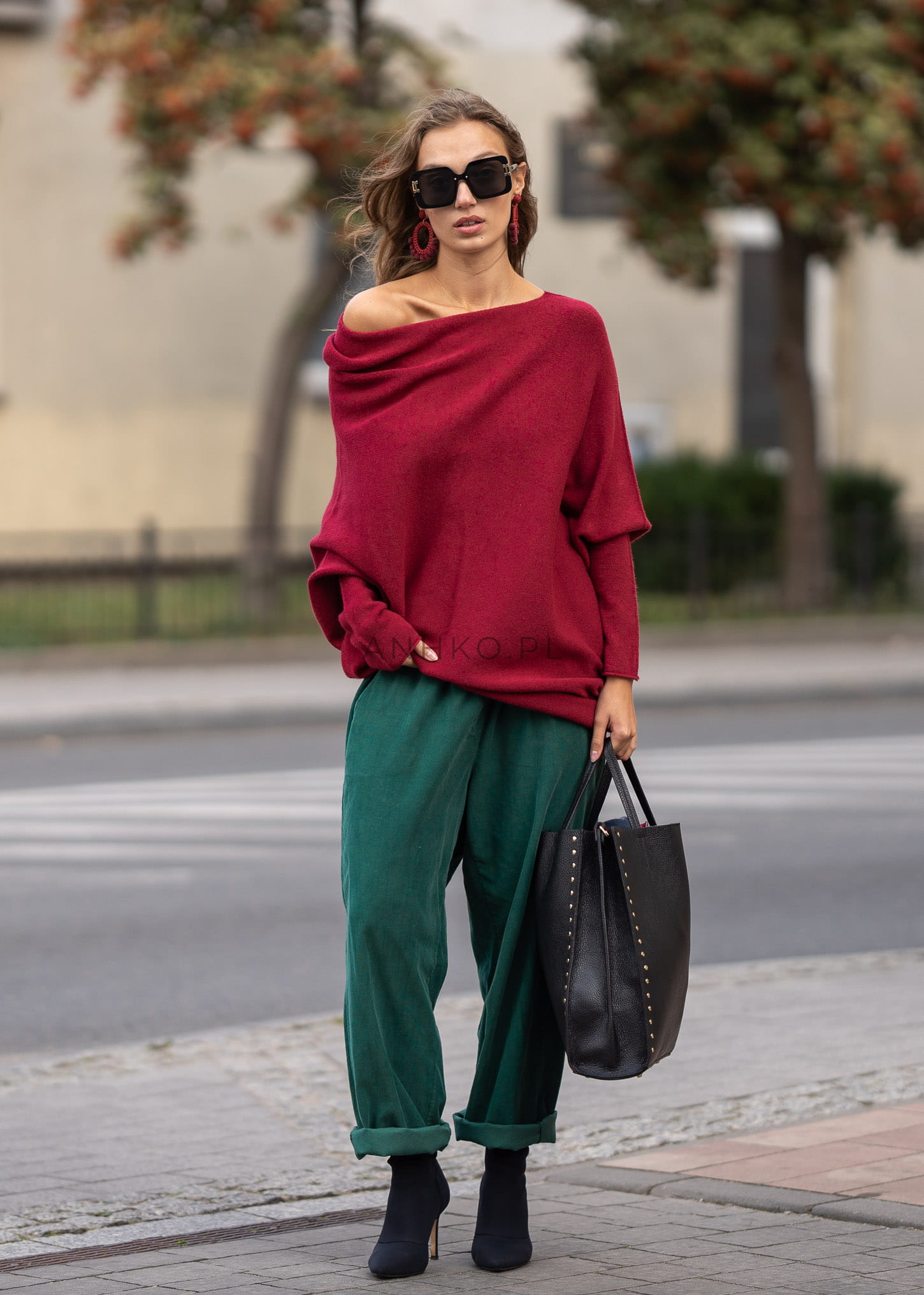 Ten sweter oversize w kolorze bordo przyciąga uwagę wyrazistą barwą i luźnym, nietoperzowym krojem. Miękka dzianina naturalnie układa się na sylwetce, zapewniając komfort oraz efekt lekkości niezależnie od stylizacji.