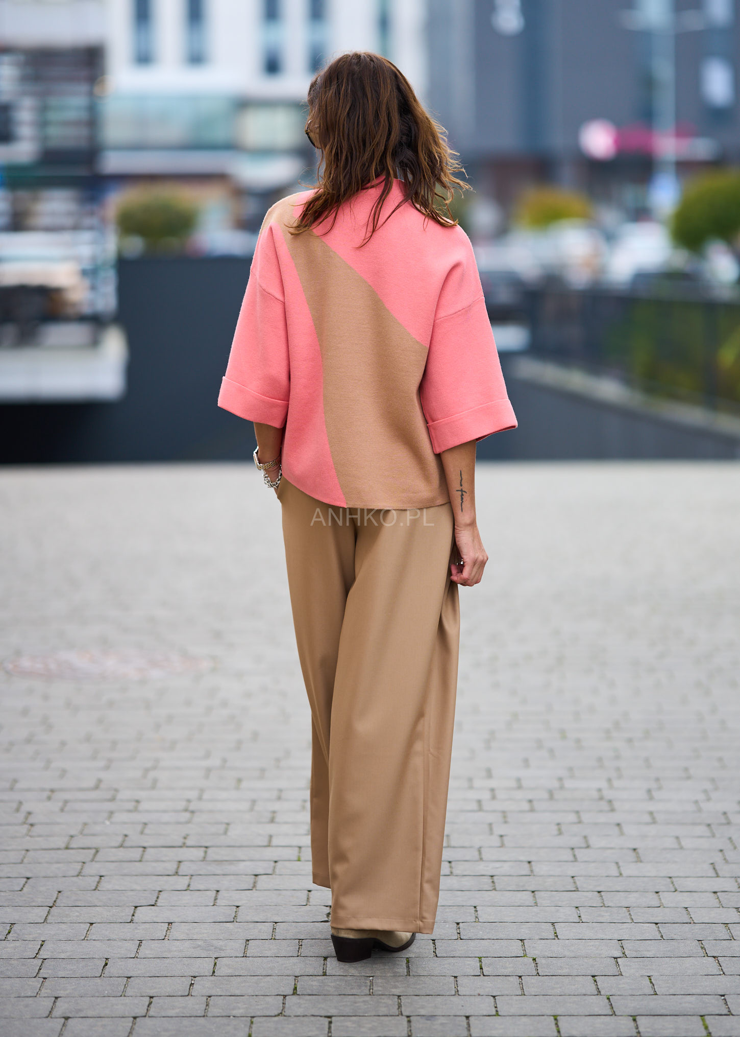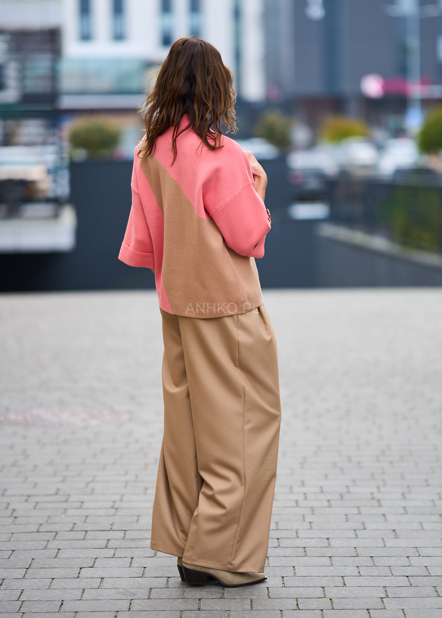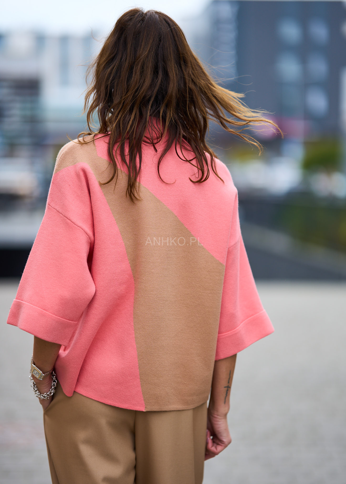 Sweter z półgolfem zachwyca połączeniem wyrazistego koloru i eleganckiej, geometrycznej formy. Wykonany z miękkiej dzianiny, gwarantuje komfort noszenia przez cały dzień, a luźniejszy krój pozwala na swobodę ruchów. Stójka oraz rękawy 3/4 z ozdobnymi guzikami dodają mu szyku. Ten model doskonale wpisuje się w styl smart-casual — noś go do szerokich spodni, garniturowych dołów, klasycznych jeansów czy spódnic o prostym kroju. Idealny do pracy, na spotkania i miejskie wyjścia, kiedy chcesz wyglądać stylowo, nowocześnie i kobieco.