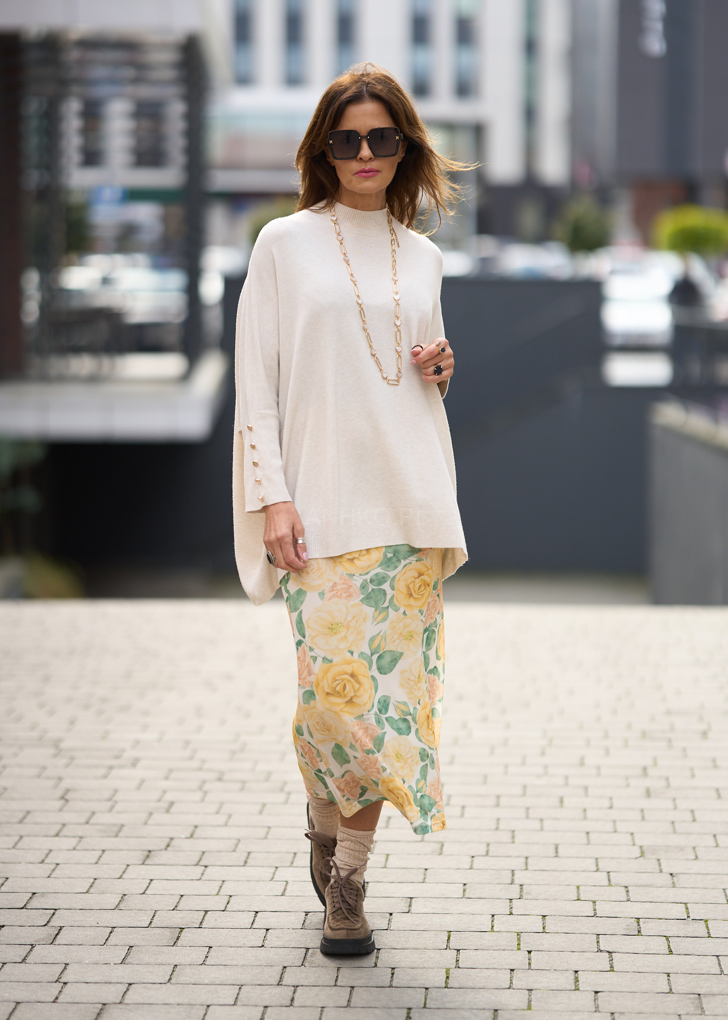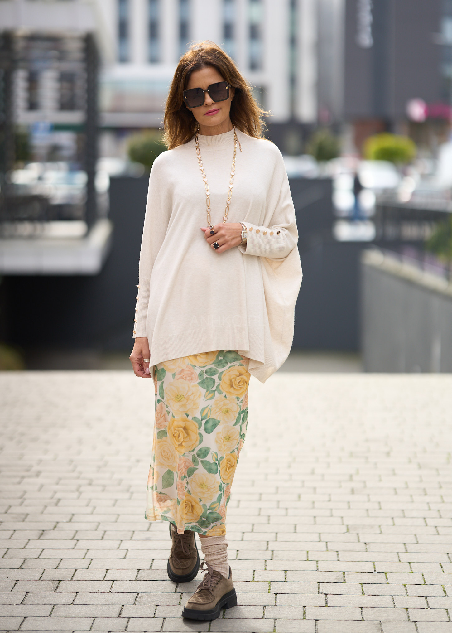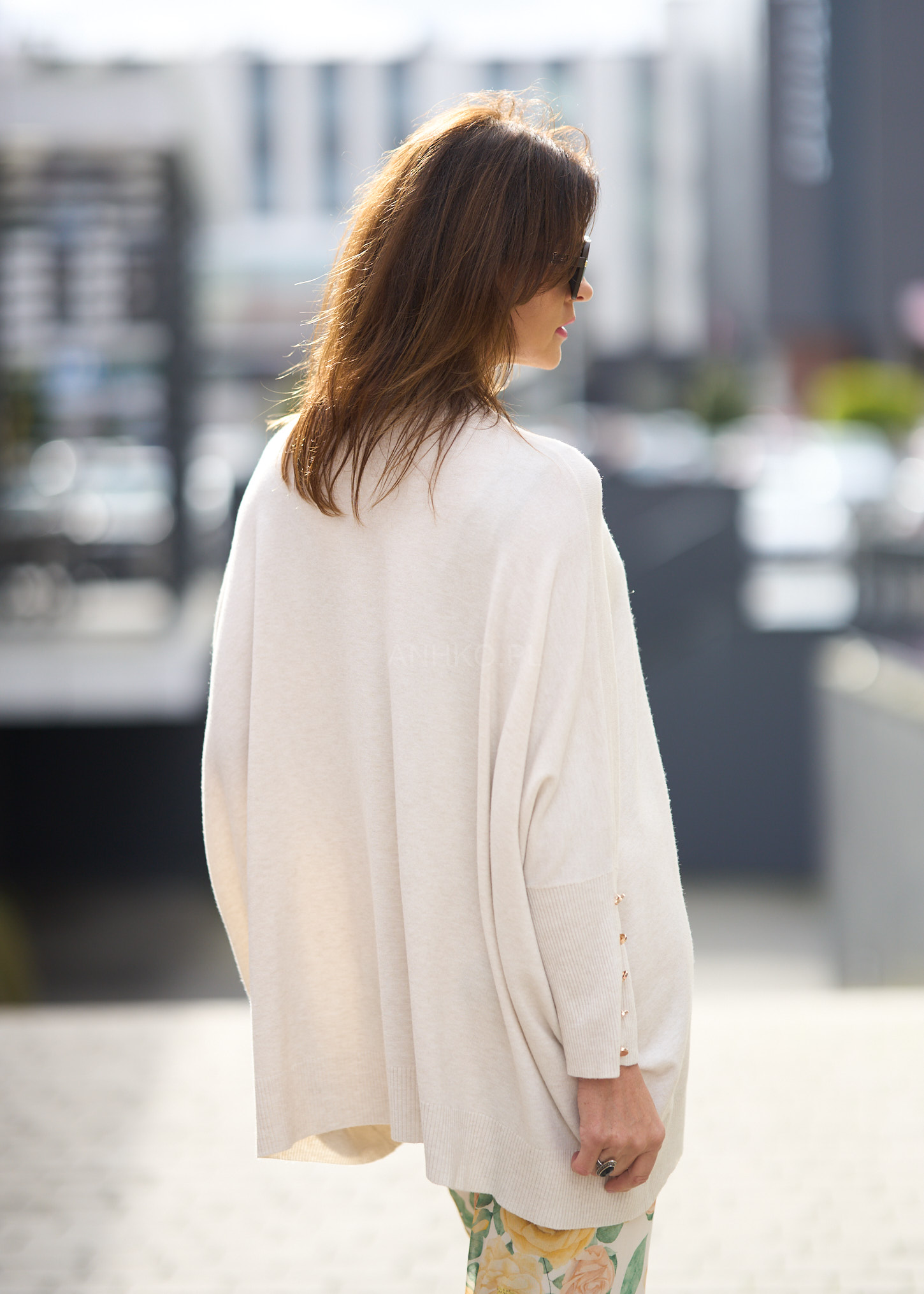 Ten granatowy sweter to kwintesencja klasy i wygody. Wykonany z mieszanki wysokiej jakości materiałów, charakteryzuje się delikatnym wykończeniem i eleganckim krojem. Ozdobne guziki na rękawach dodają mu oryginalności, sprawiając, że świetnie nadaje się zarówno na casualowe spotkania, jak i bardziej formalne okazje. Sweter doskonale komponuje się z jeansami, spodniami materiałowymi czy spódnicami, tworząc stylizacje na każdą okazję.