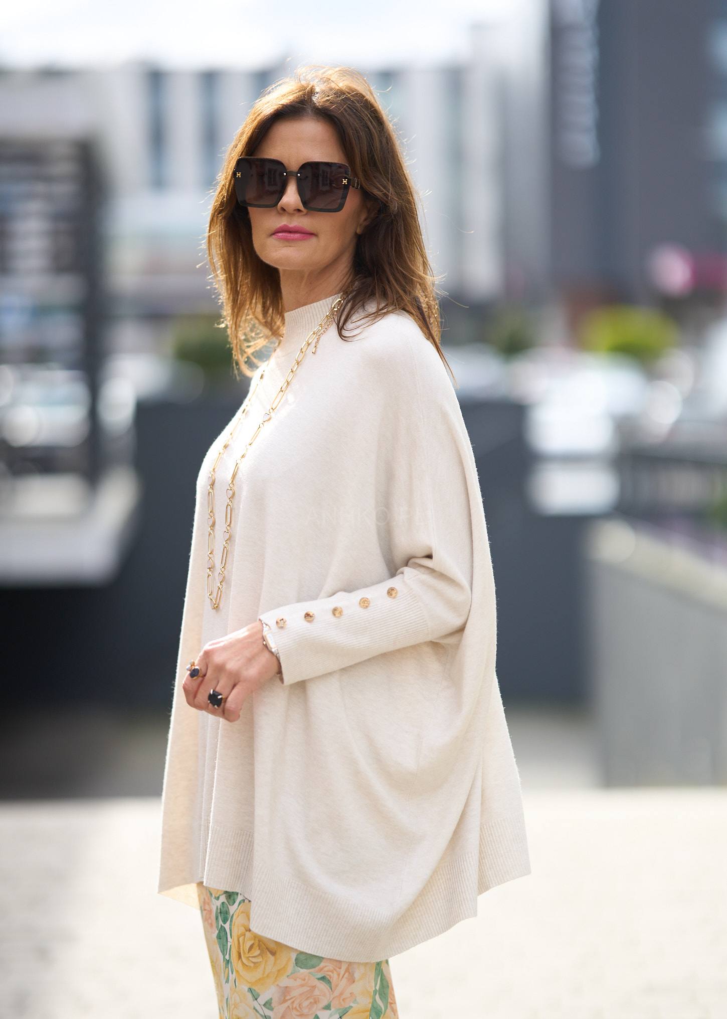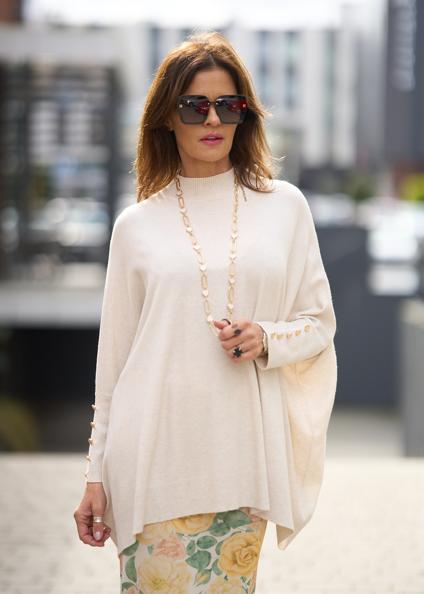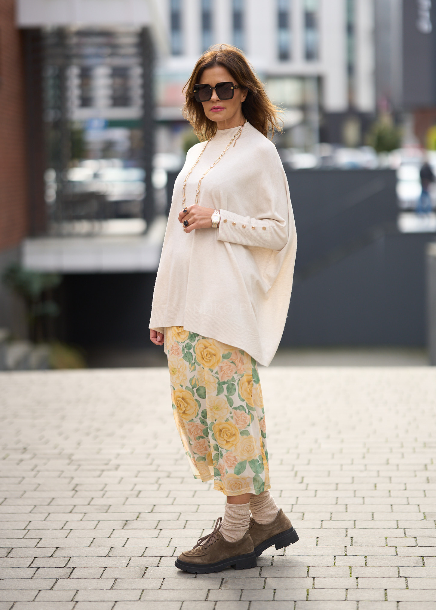 Ten granatowy sweter to kwintesencja klasy i wygody. Wykonany z mieszanki wysokiej jakości materiałów, charakteryzuje się delikatnym wykończeniem i eleganckim krojem. Ozdobne guziki na rękawach dodają mu oryginalności, sprawiając, że świetnie nadaje się zarówno na casualowe spotkania, jak i bardziej formalne okazje. Sweter doskonale komponuje się z jeansami, spodniami materiałowymi czy spódnicami, tworząc stylizacje na każdą okazję.