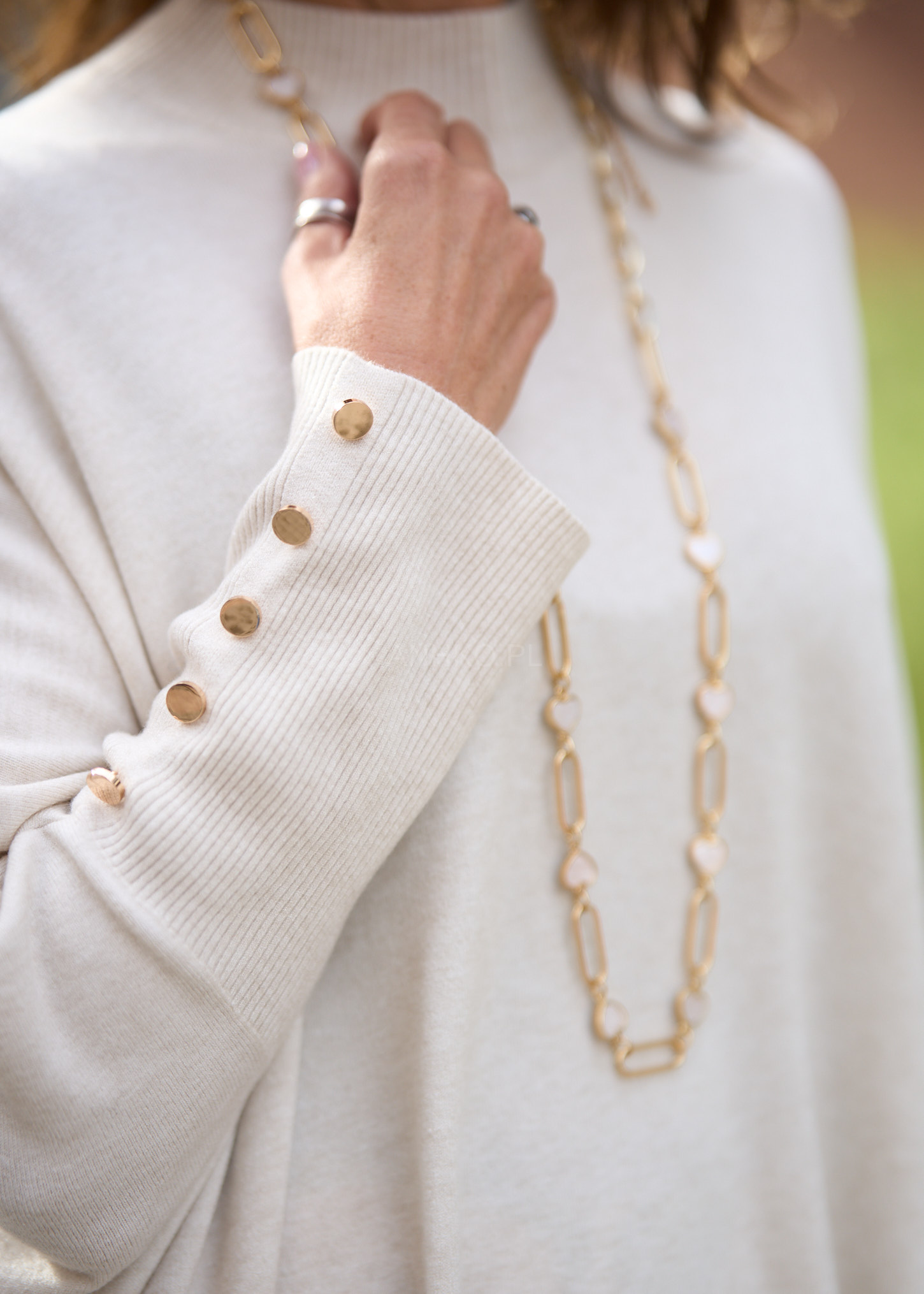 Naszyjnik Sece to długi, złoty naszyjnik z podłużnymi oczkami, zapinany na karabińczyk. Zawieszki w kształcie serca z masą perłową nadają mu elegancji, idealnie uzupełniając zarówno codzienne, jak i wieczorowe stylizacje.