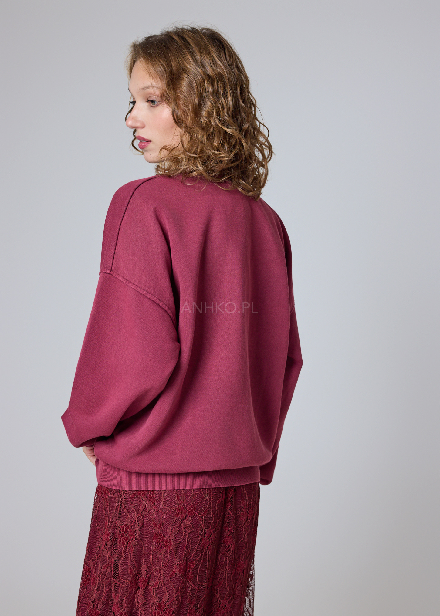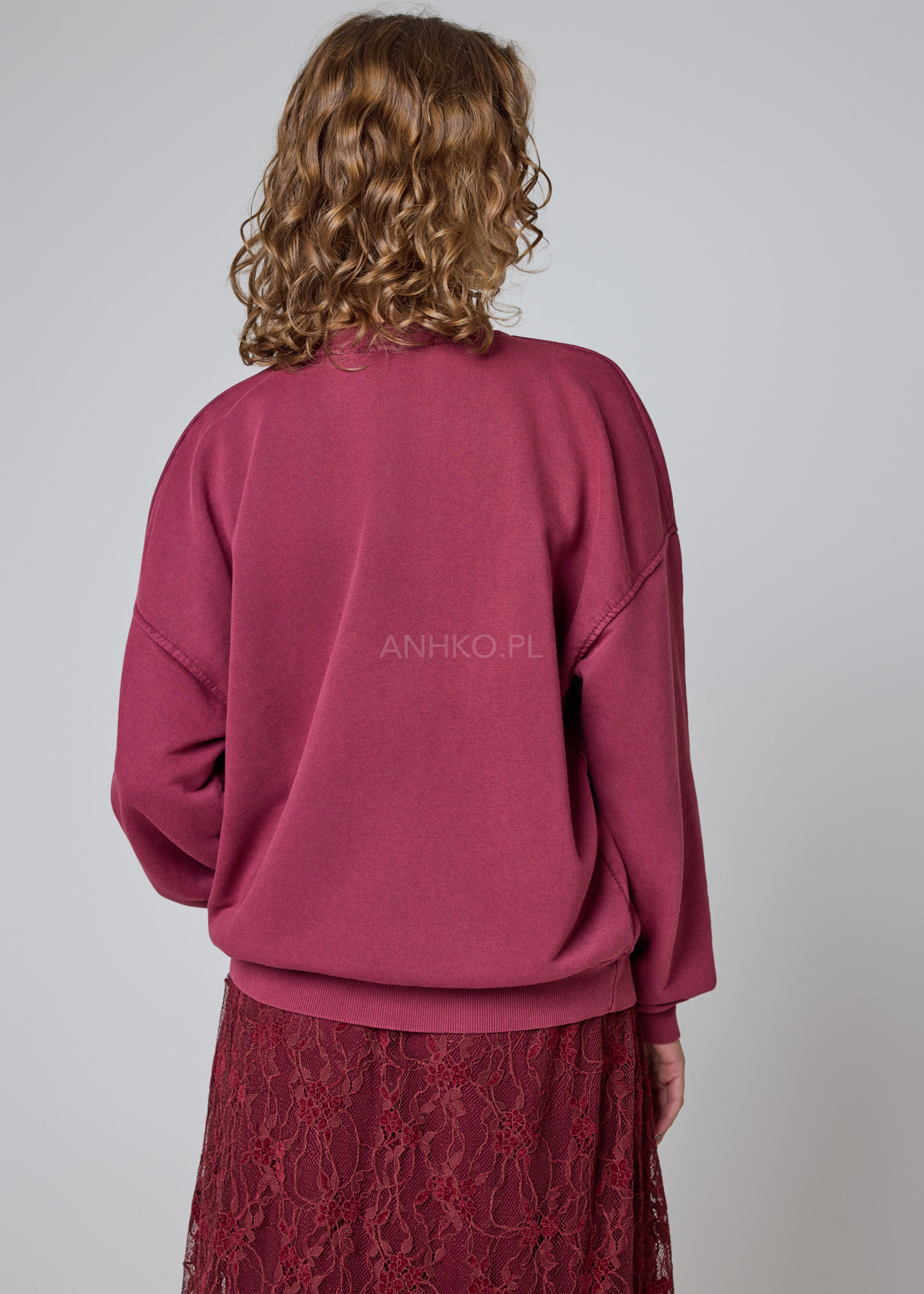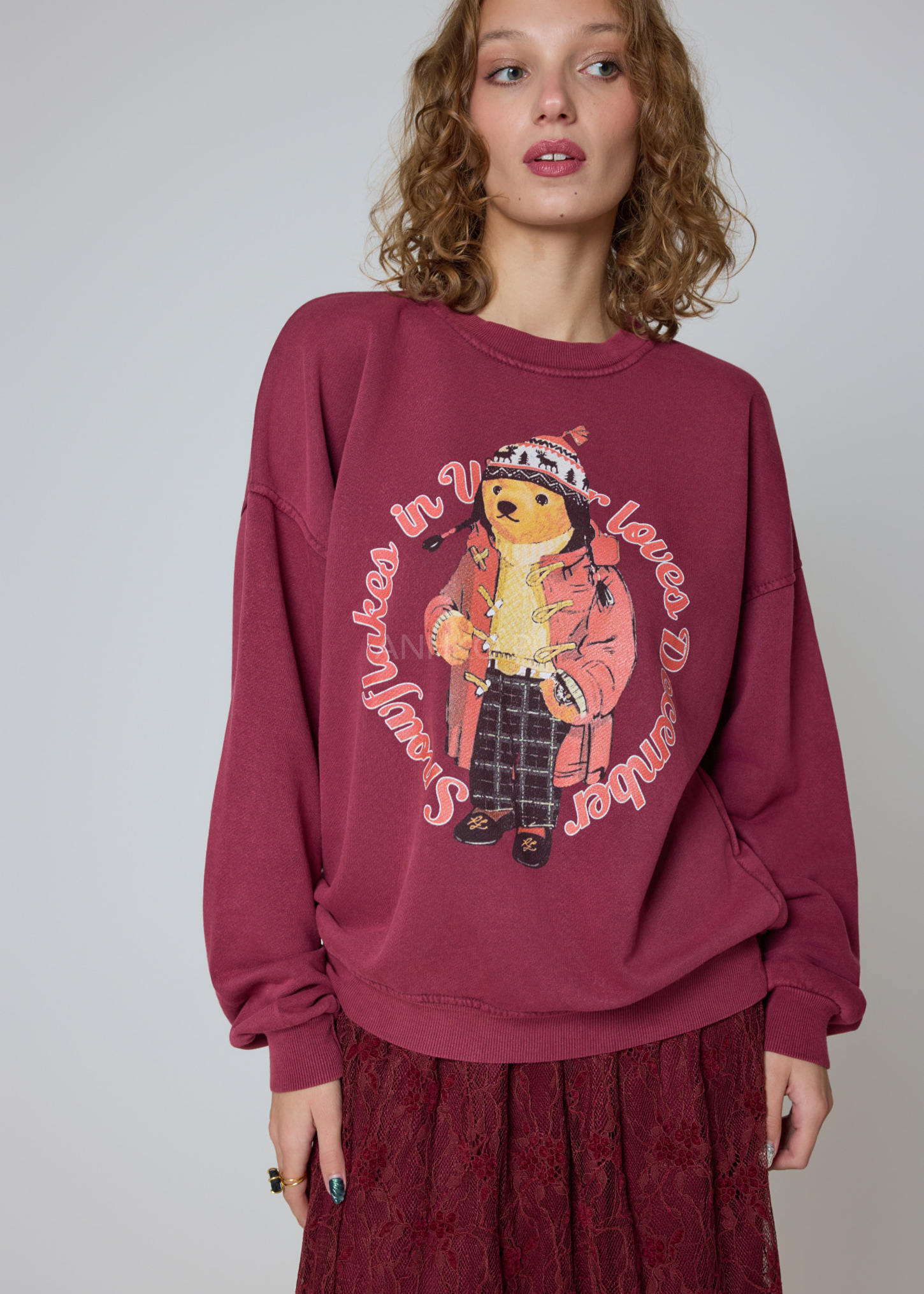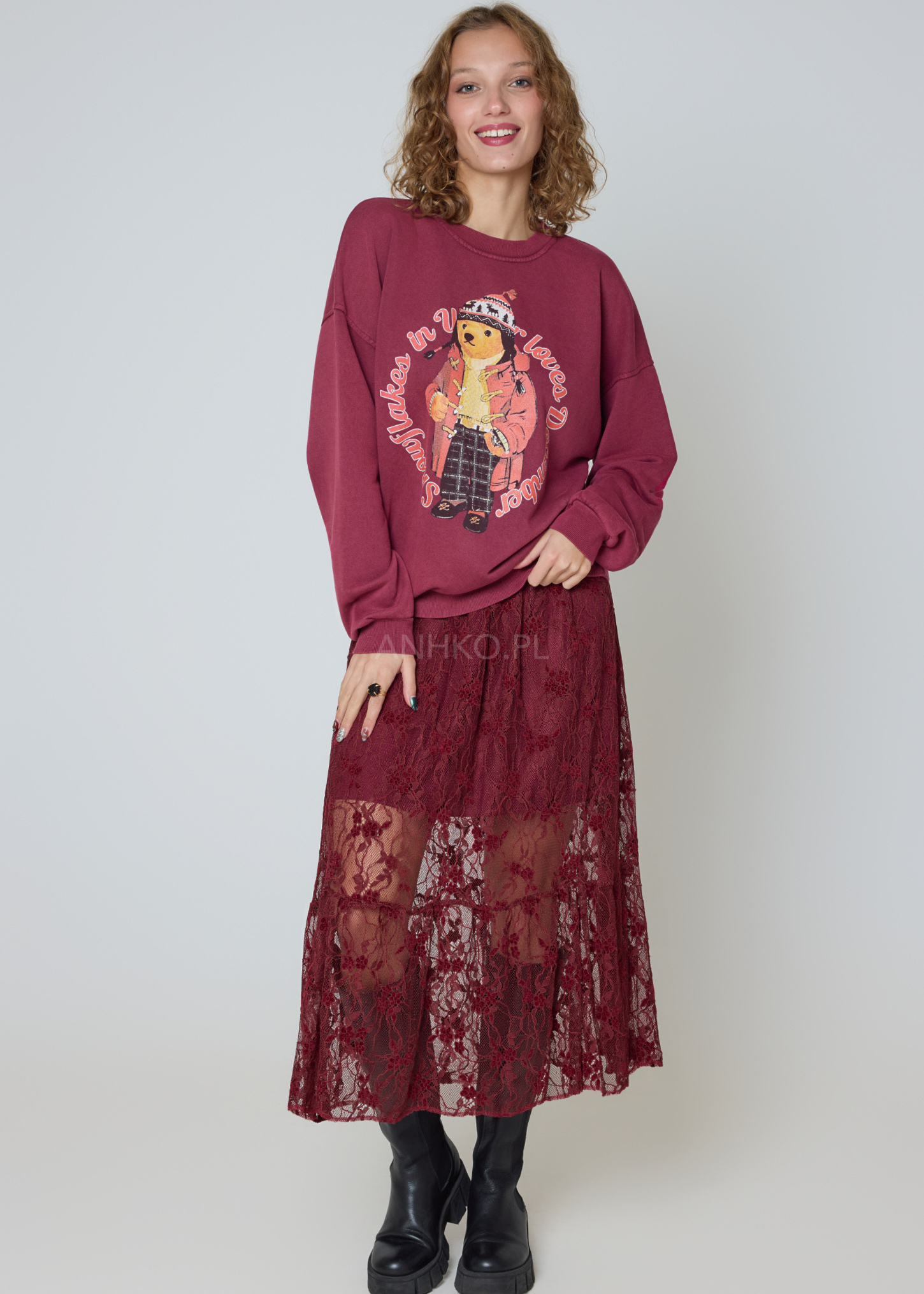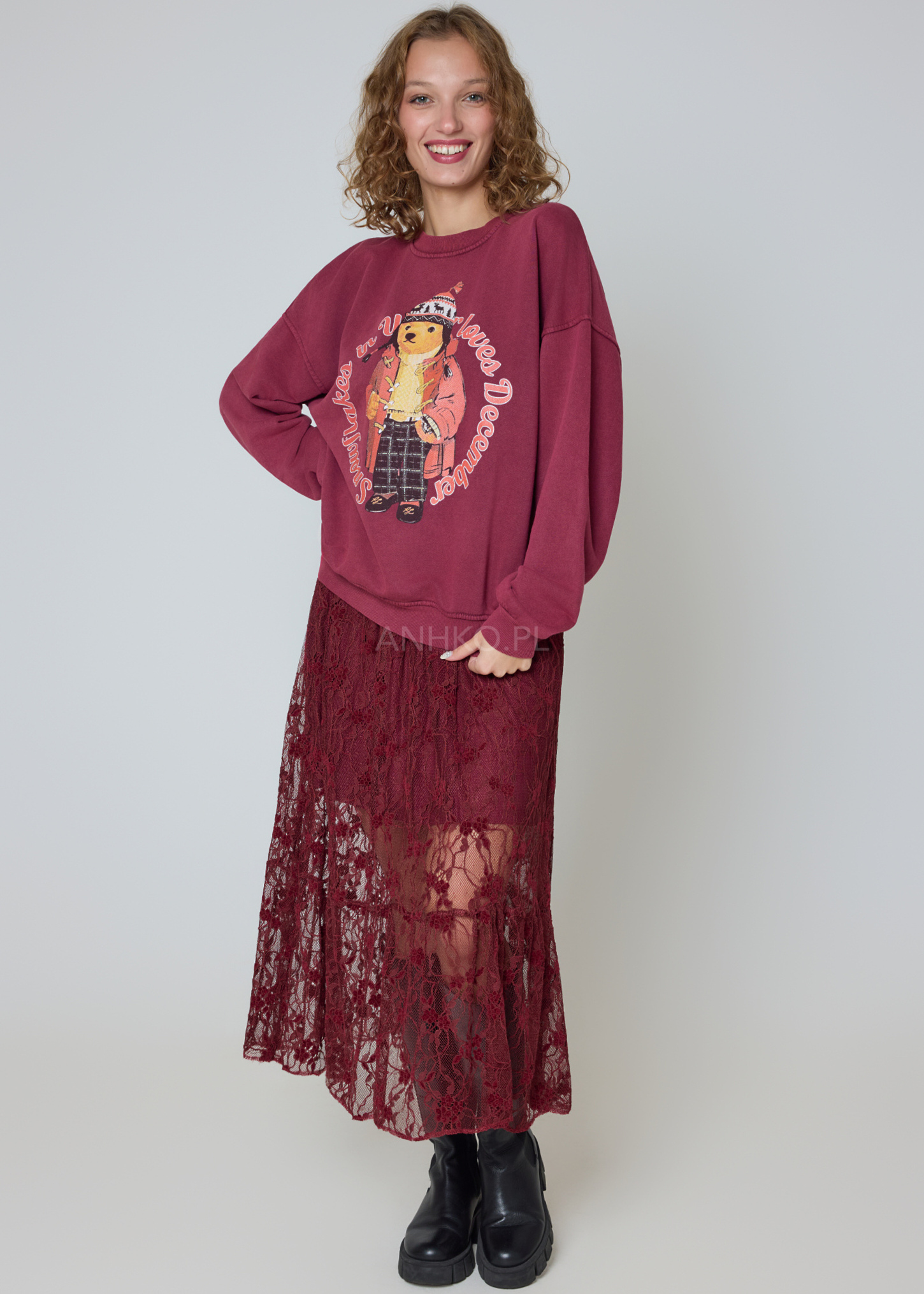 Idealna propozycja dla kobiet, które lubią wygodę połączoną z odrobiną zabawy w modzie. Utrzymana w głębokim bordowym odcieniu, wyróżnia się dużym nadrukiem misia w zimowym ubraniu — motywem, który wprowadza ciepły, przytulny klimat. Bluza posiada luźny fason z lekko obniżoną linią ramion, dzięki czemu świetnie układa się na sylwetce i zapewnia komfort noszenia przez cały dzień. Doskonała do codziennych stylizacji, na spacer, wyjazd w góry czy wieczór w świątecznym nastroju. Zestawisz ją zarówno z jeansami, jak i plisowaną spódnicą czy legginsami.